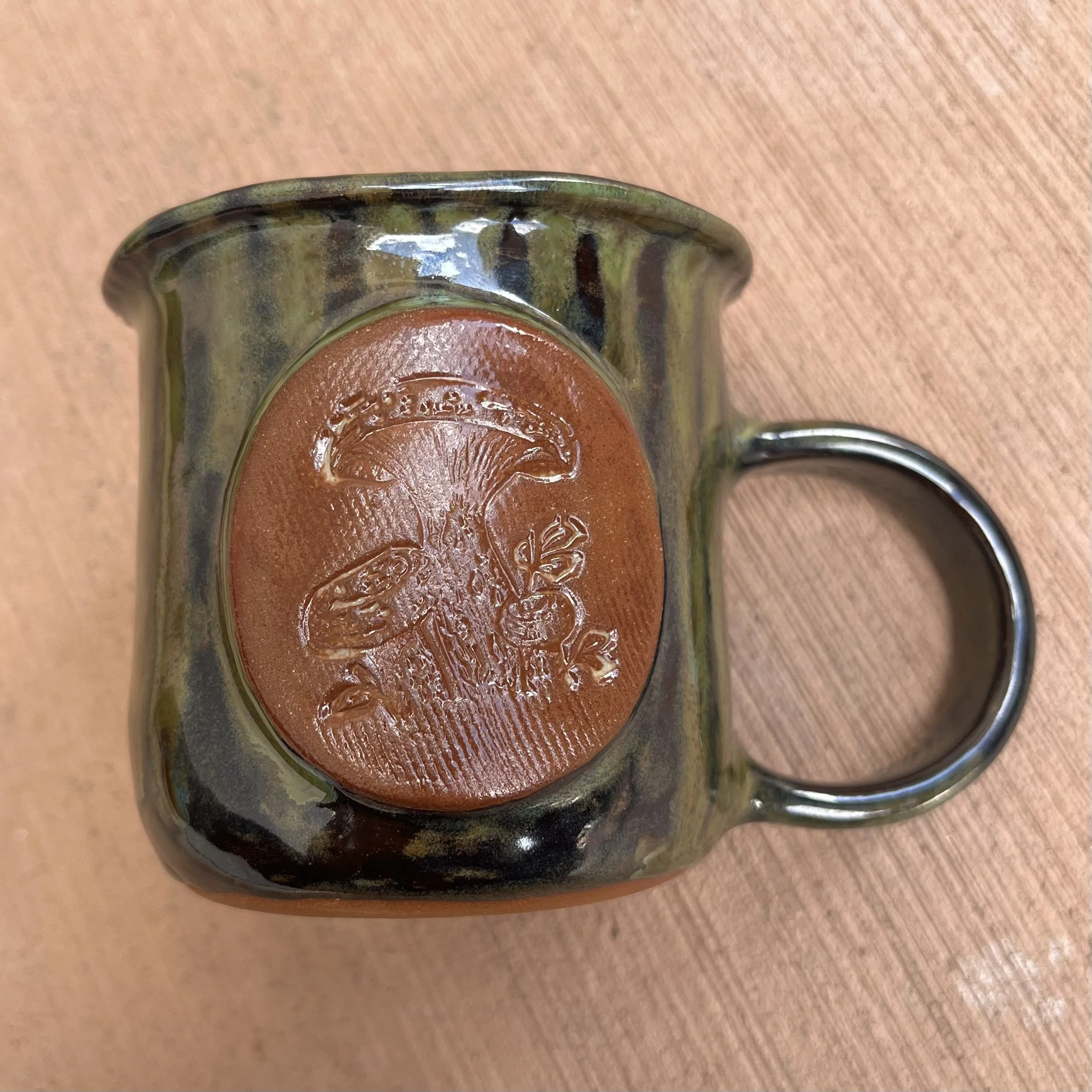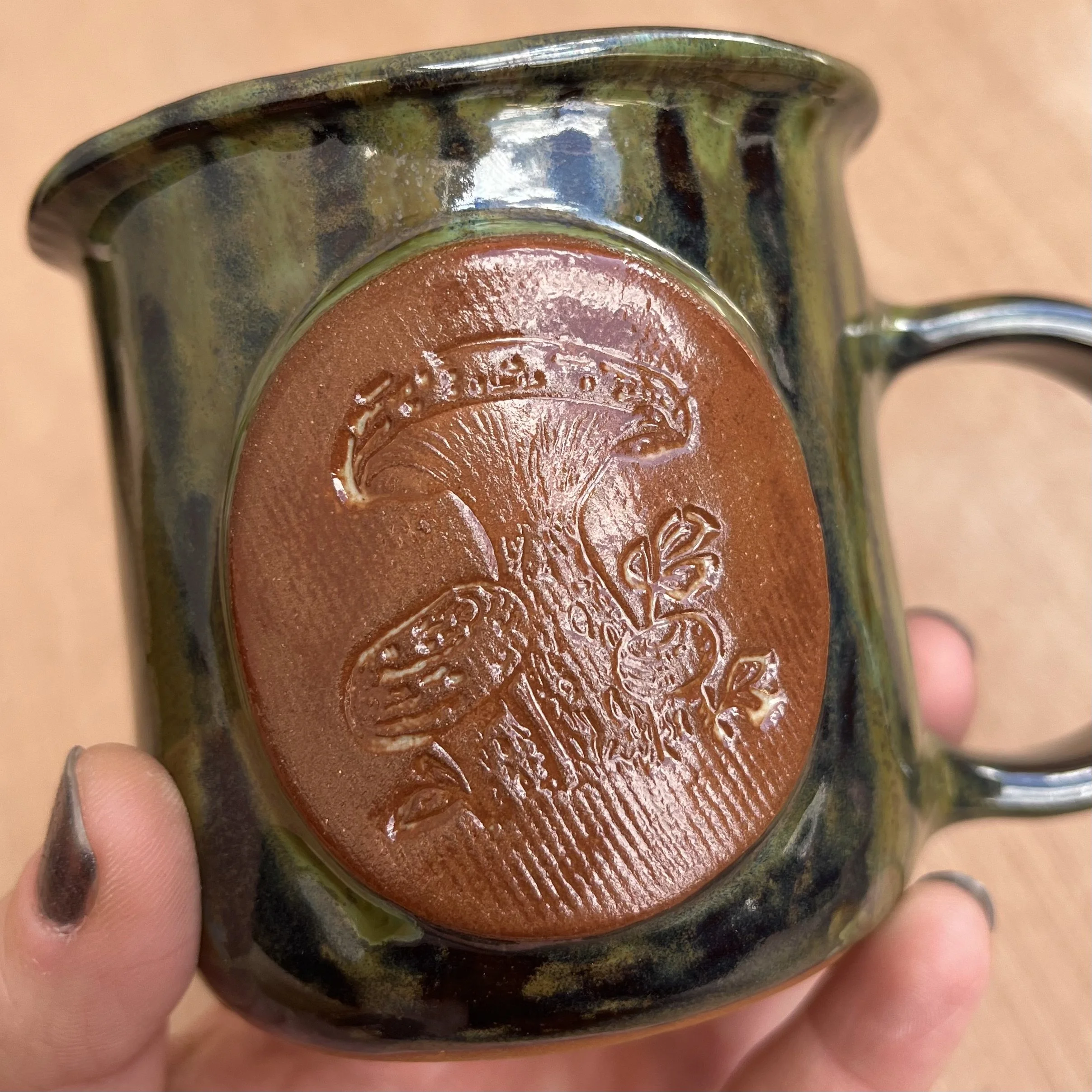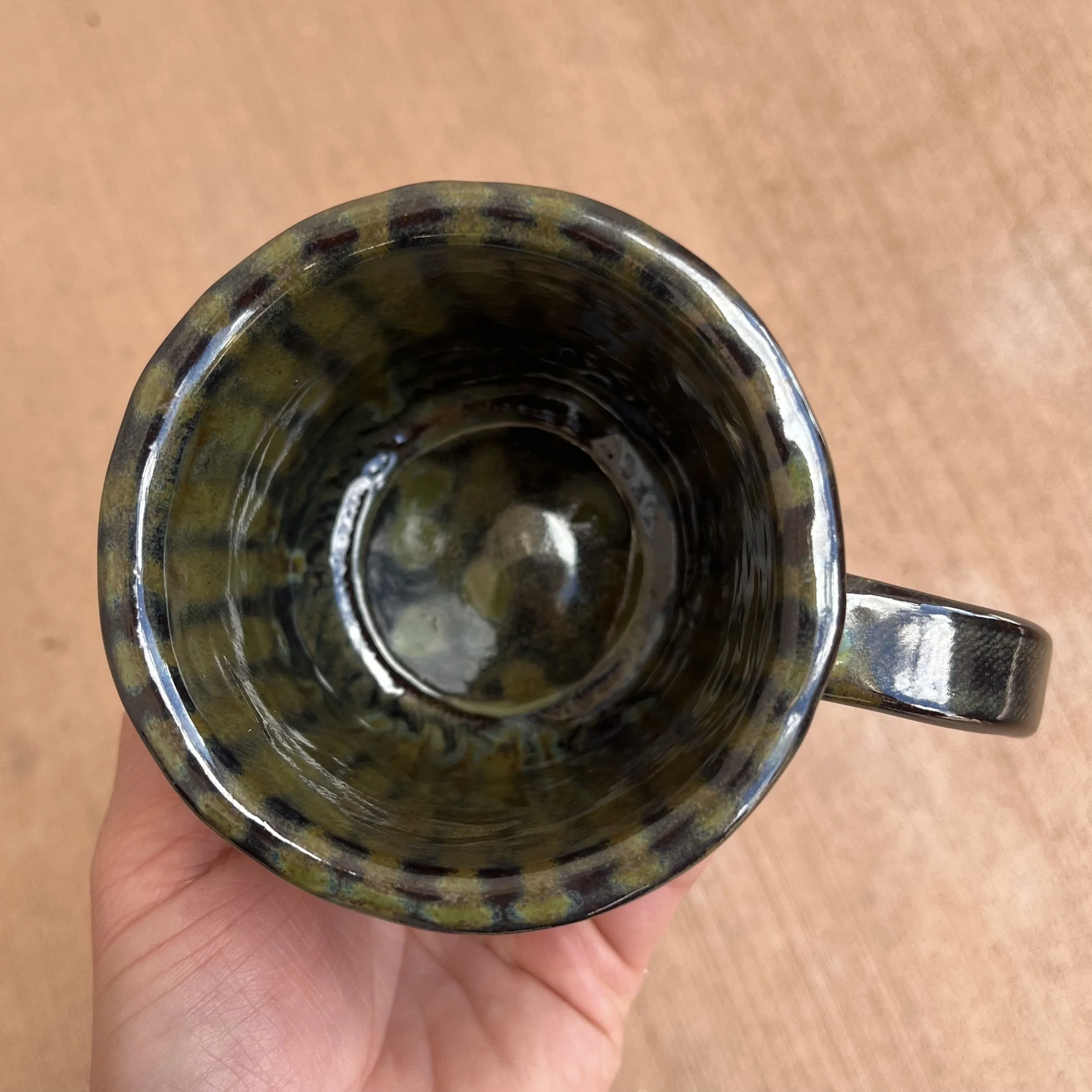 This handbuilt piece is created by cutting slabs of clay and attaching around a form with the addition of a handle. Red clay is fired with a combination of speckled orange and blue glaze. The blue glaze reacts to form a brown drizzle with notes of white and blue appearing in the runoff. Stars are drawn by hand with oil pastels capable of being kiln fired. Holds up to 12 fl oz of liquid.