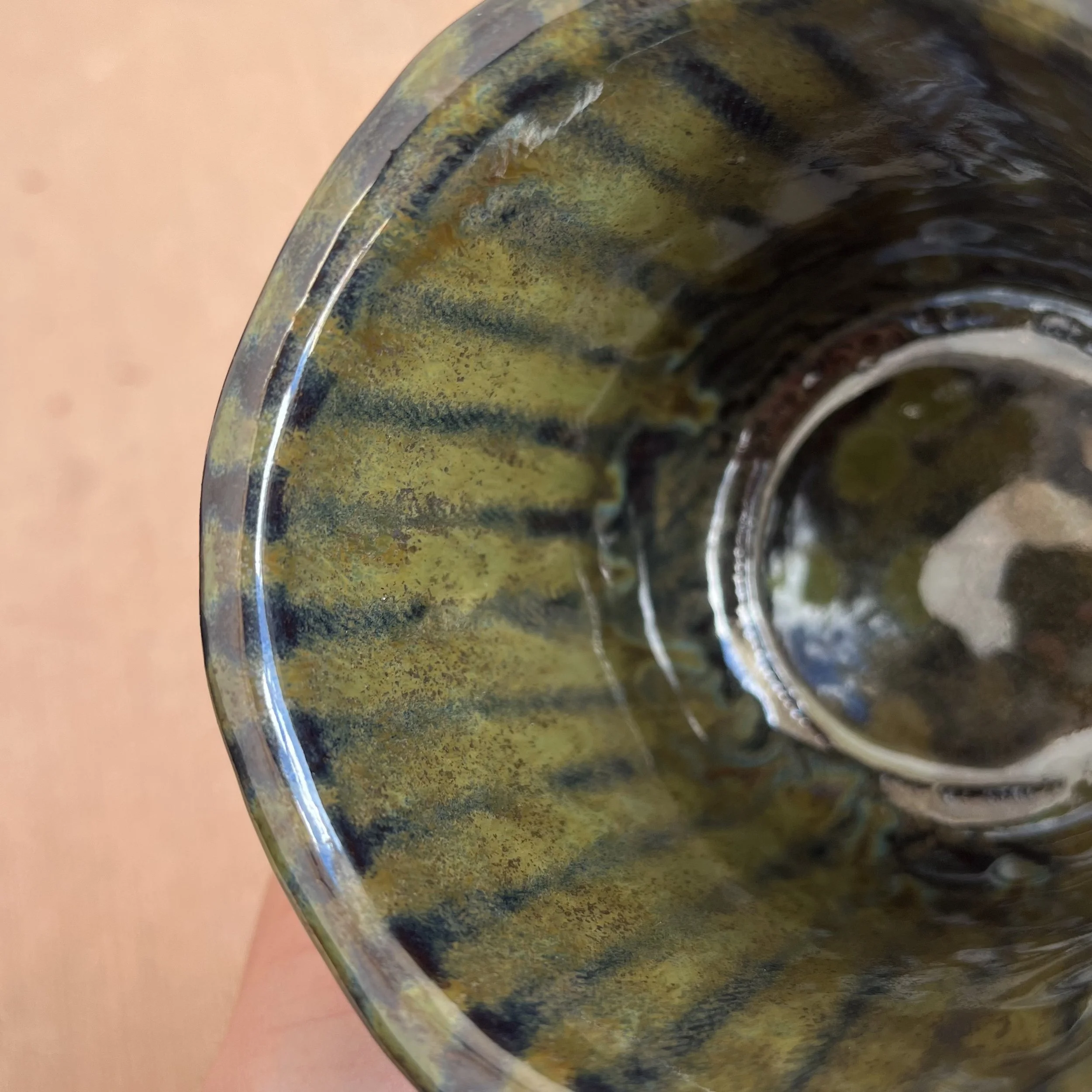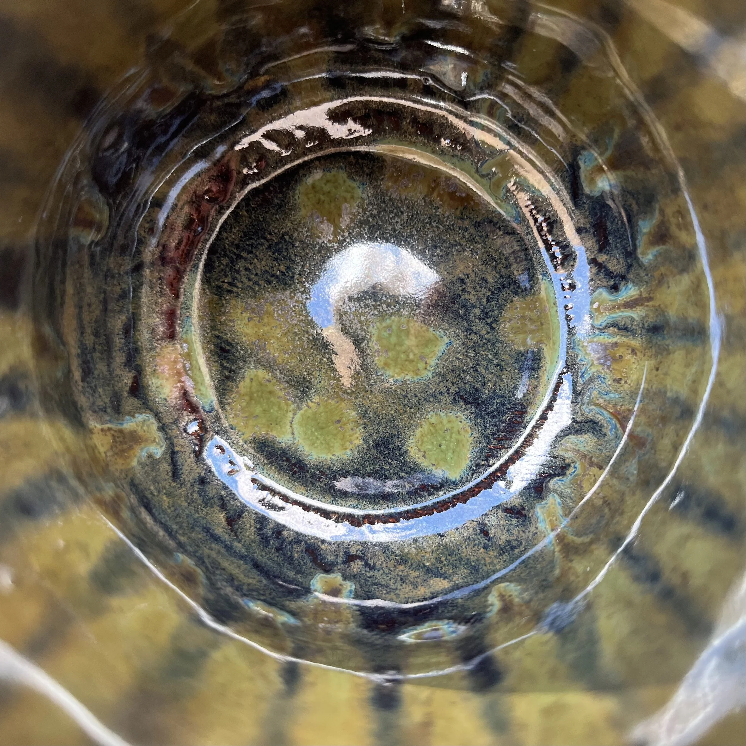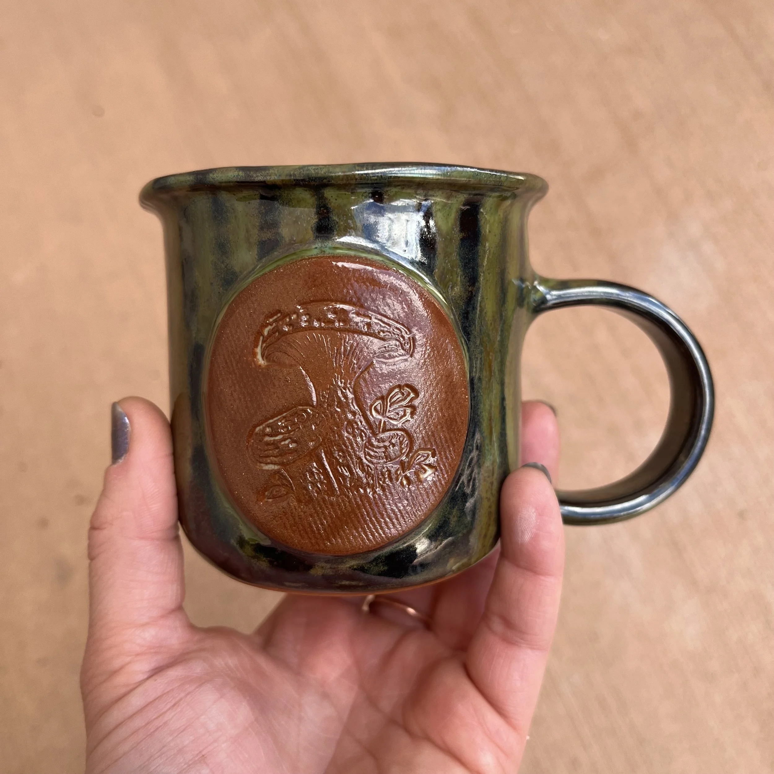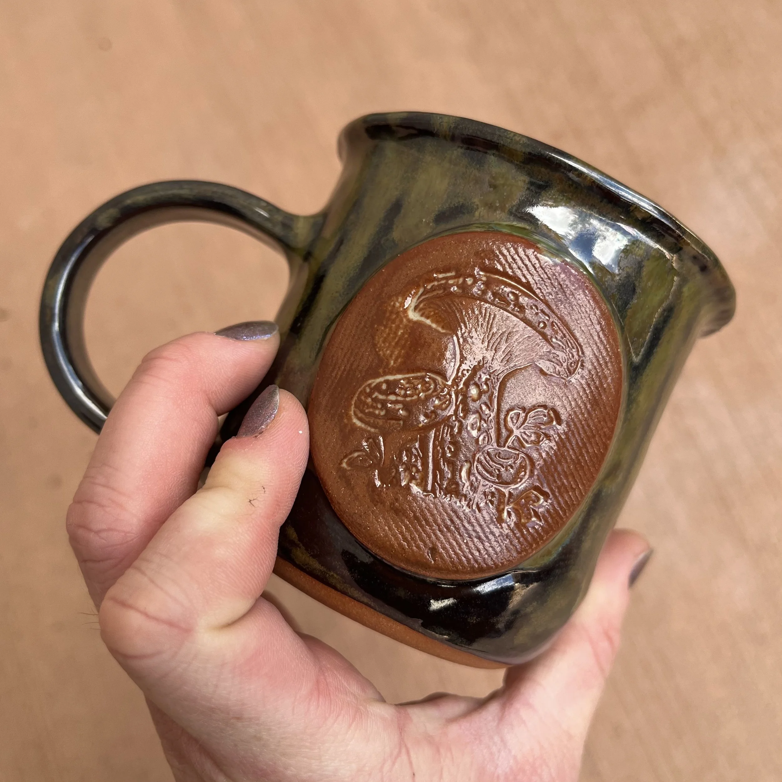 This handbuilt piece is created by cutting slabs of clay and attaching around a form with the addition of a handle. Red clay is fired with a combination of speckled orange and blue glaze. The blue glaze reacts to form a brown drizzle with notes of white and blue appearing in the runoff. Stars are drawn by hand with oil pastels capable of being kiln fired. Holds up to 12 fl oz of liquid.