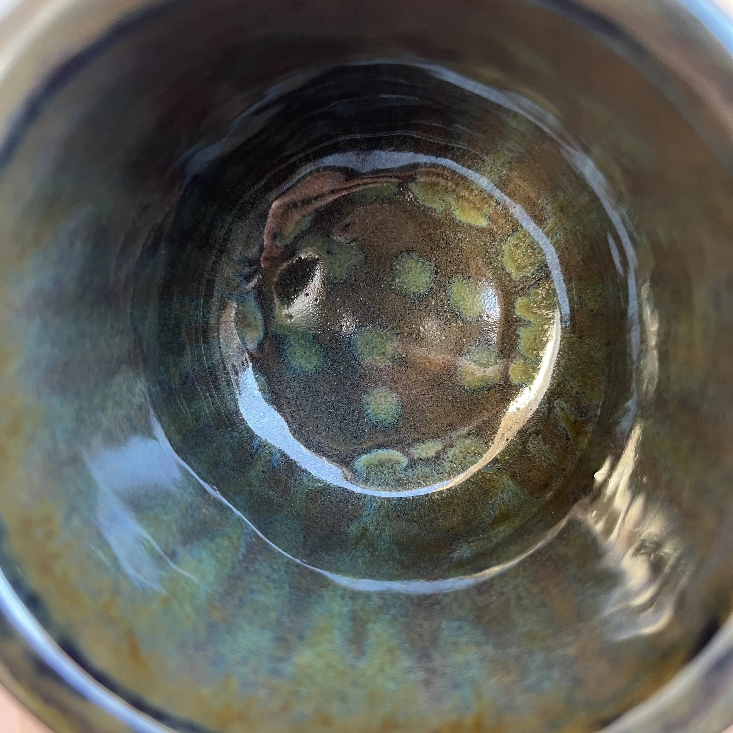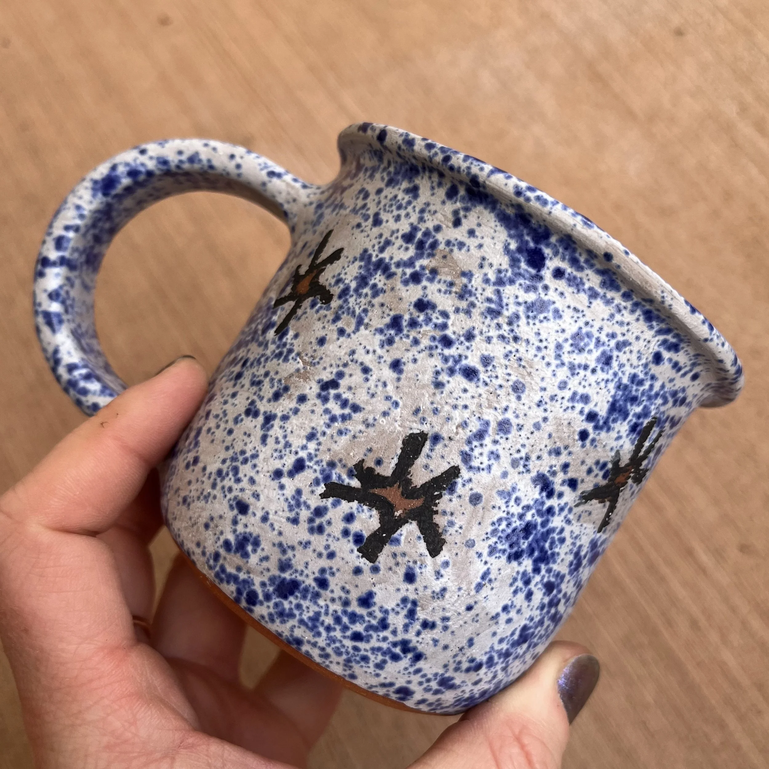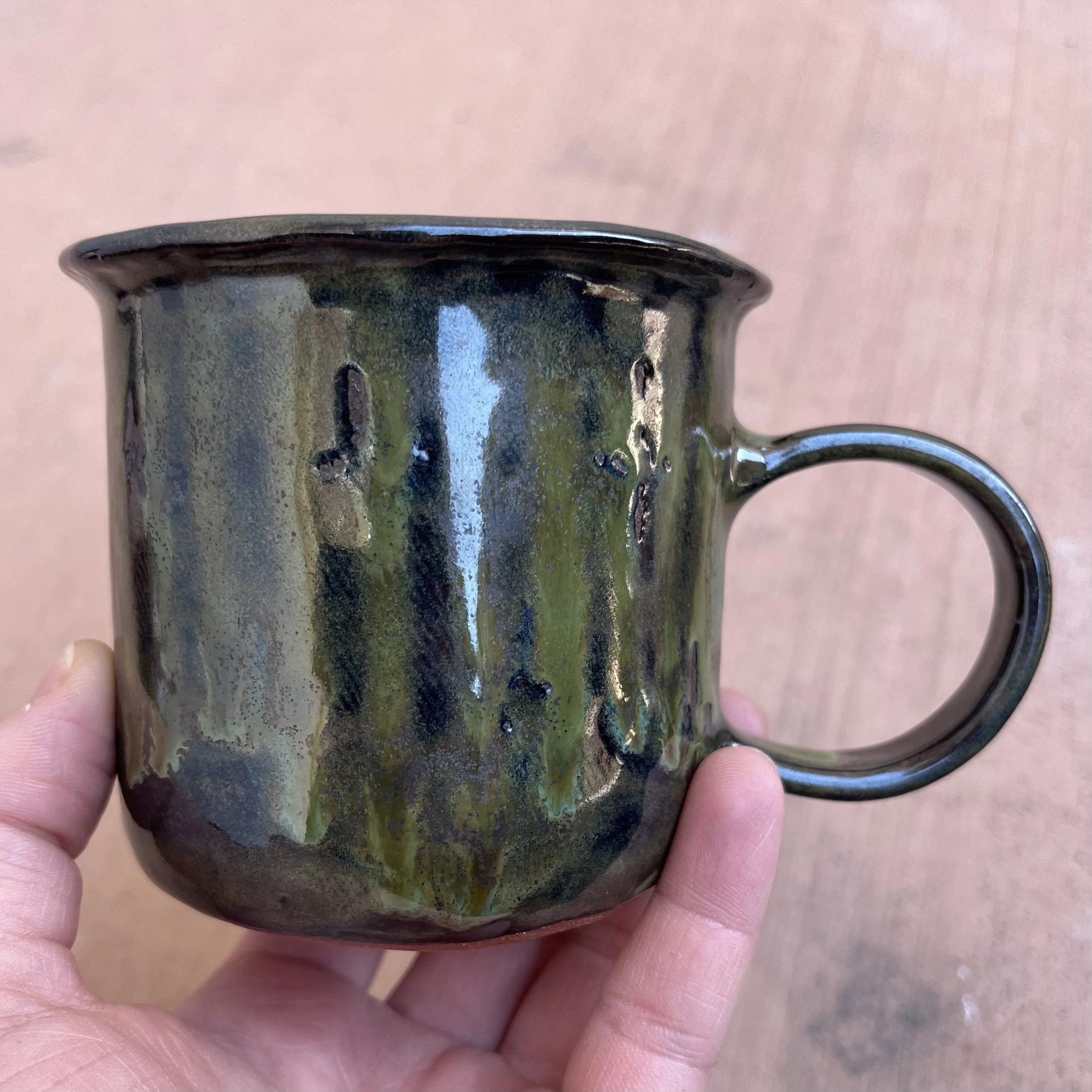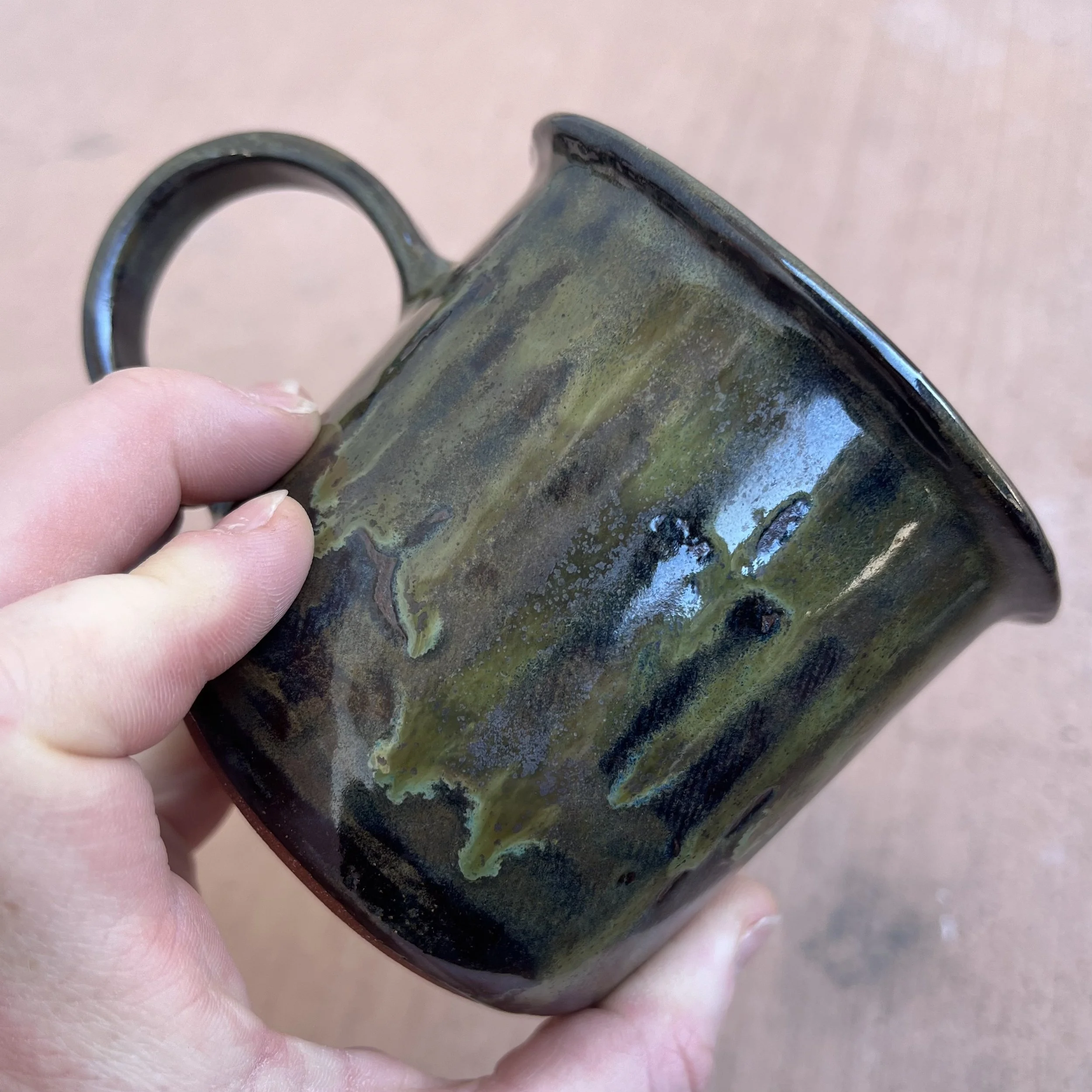 This handbuilt piece is created by cutting slabs of clay and attaching around a form with the addition of a handle. Red clay is fired with a seaweed green base and jade drizzle glaze. Stars are drawn by hand with oil pastels capable of being kiln fired. Holds up to 12 fl oz of liquid.