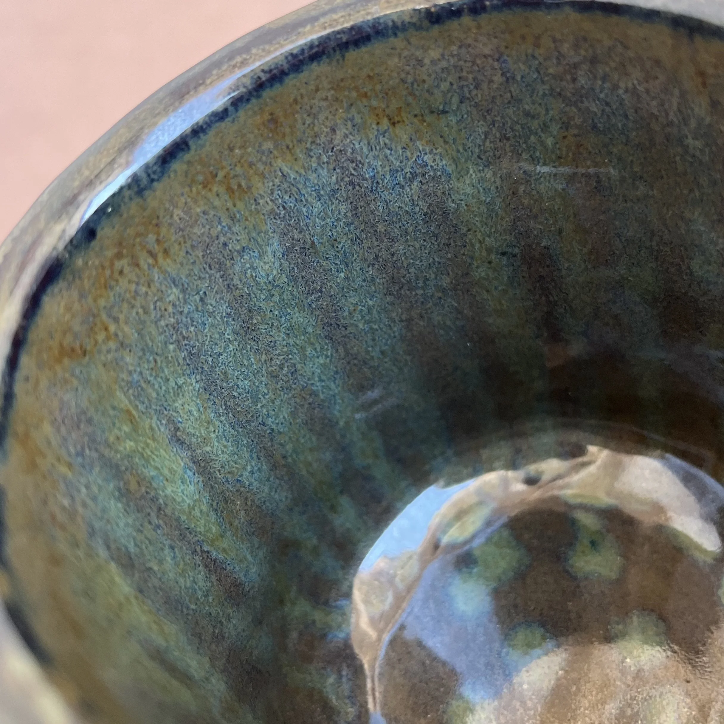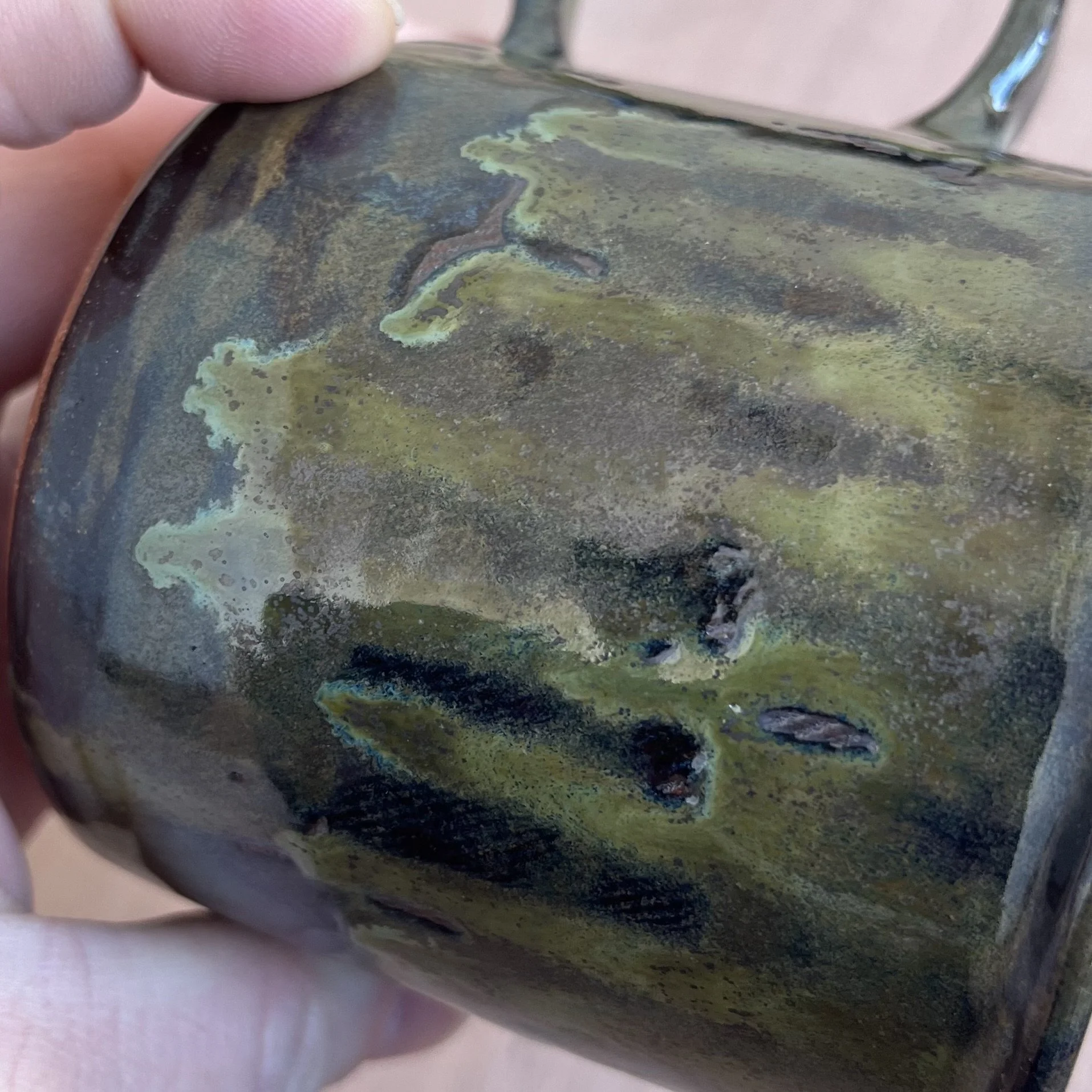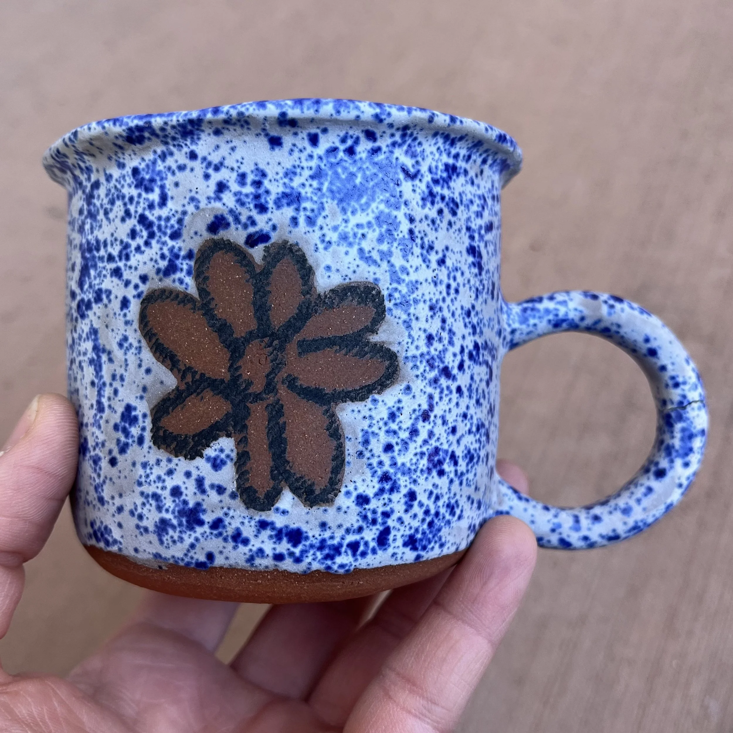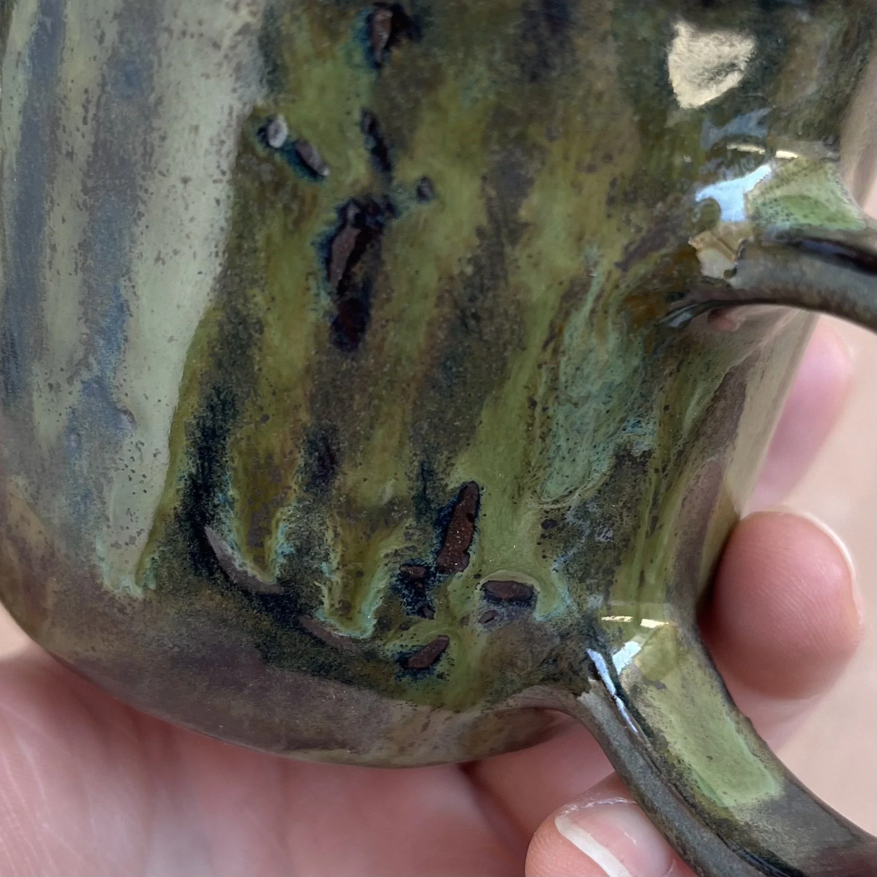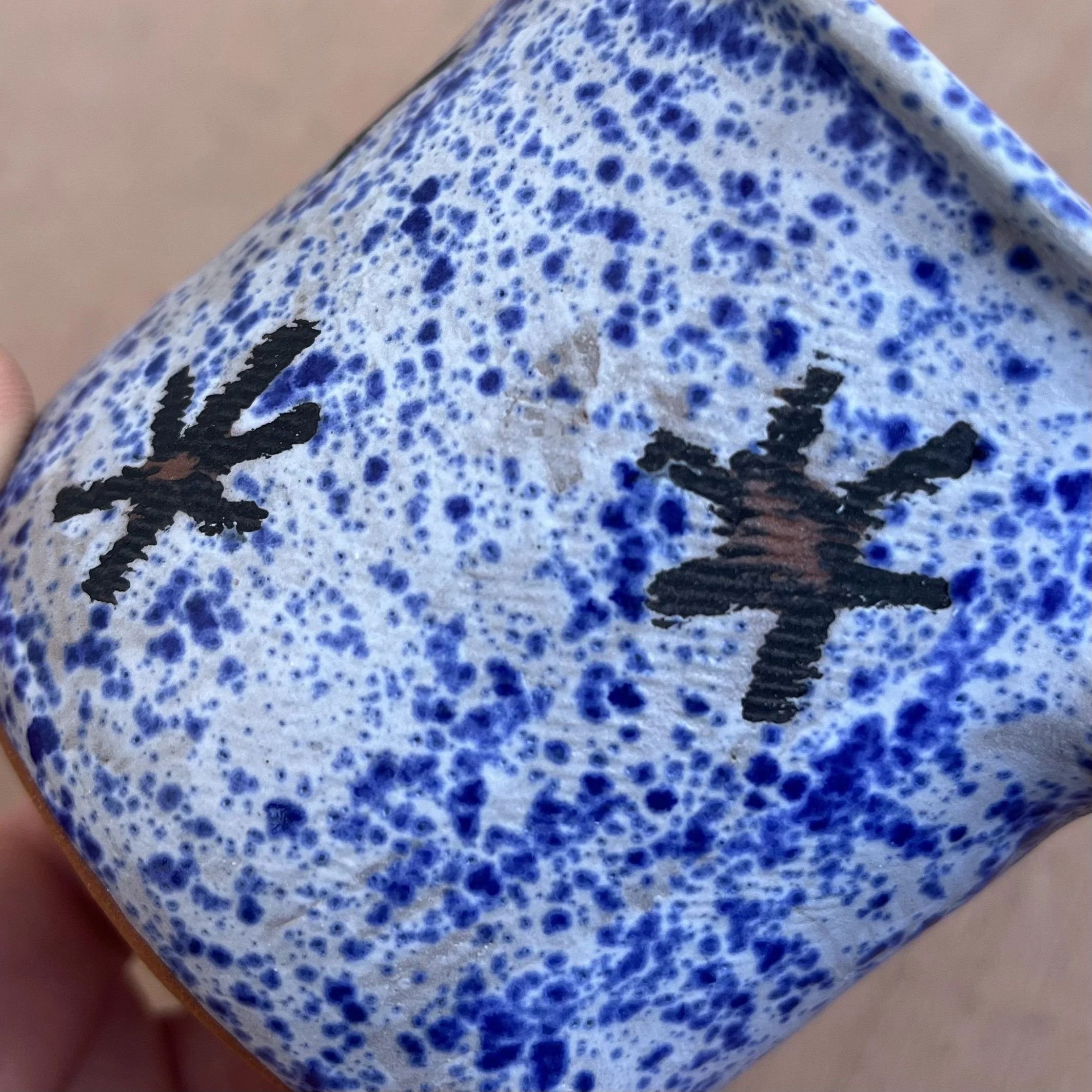 This handbuilt piece is created by cutting slabs of clay and attaching around a form with the addition of a handle. Red clay is fired with a seaweed green base and jade drizzle glaze. Stars are drawn by hand with oil pastels capable of being kiln fired. Holds up to 12 fl oz of liquid.