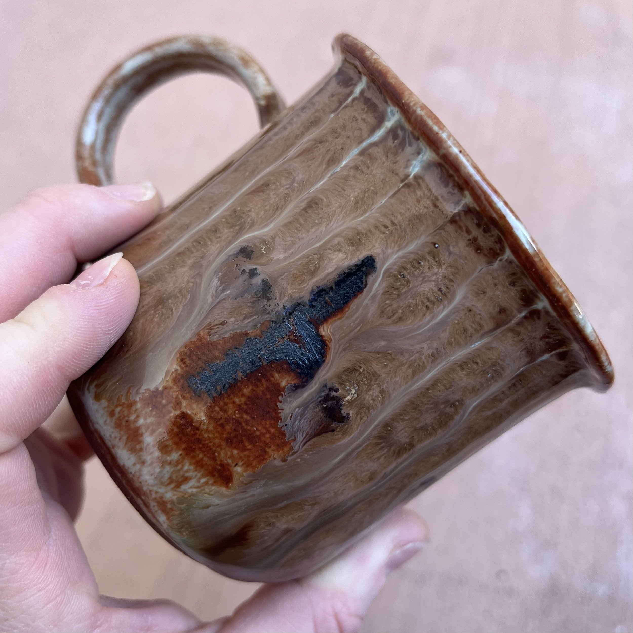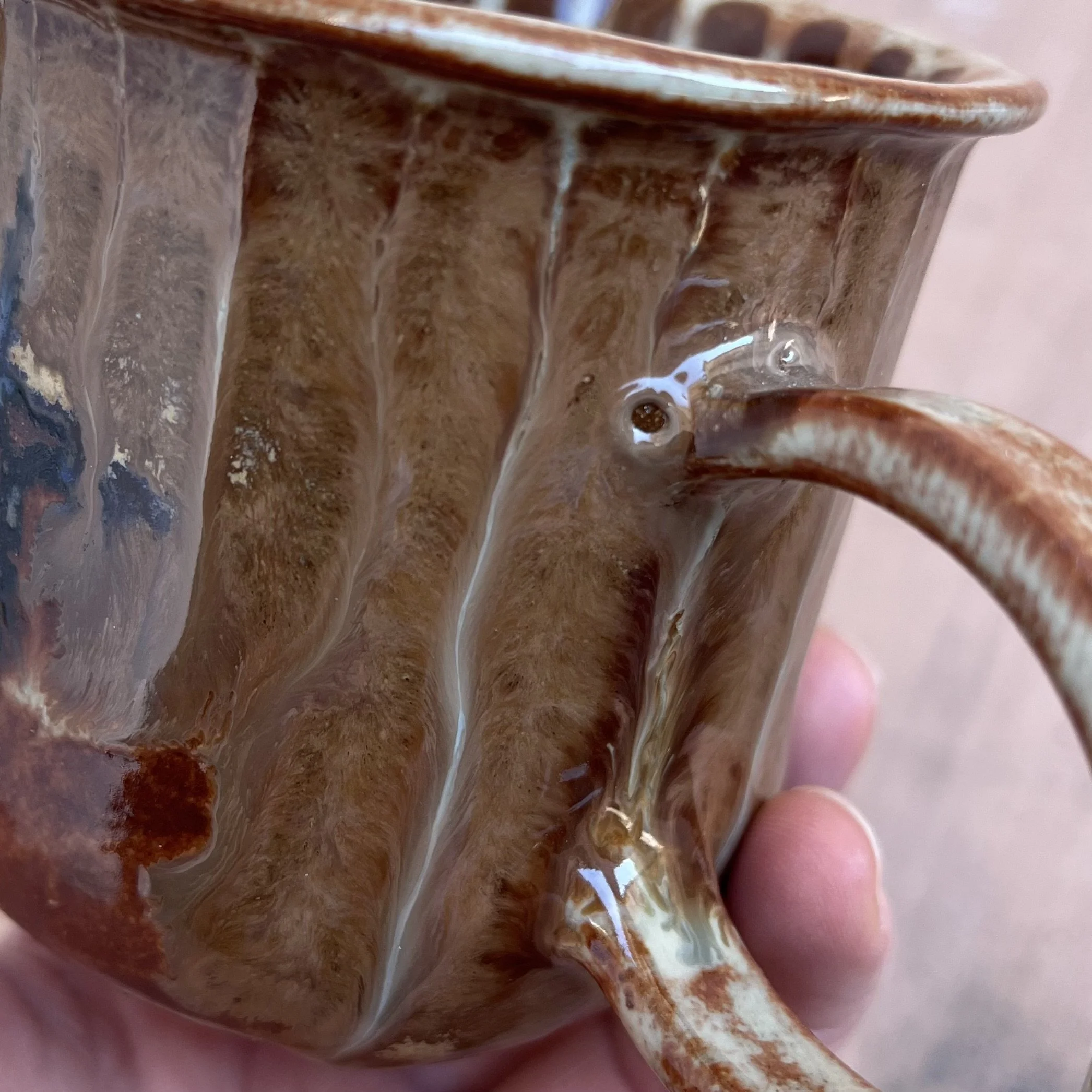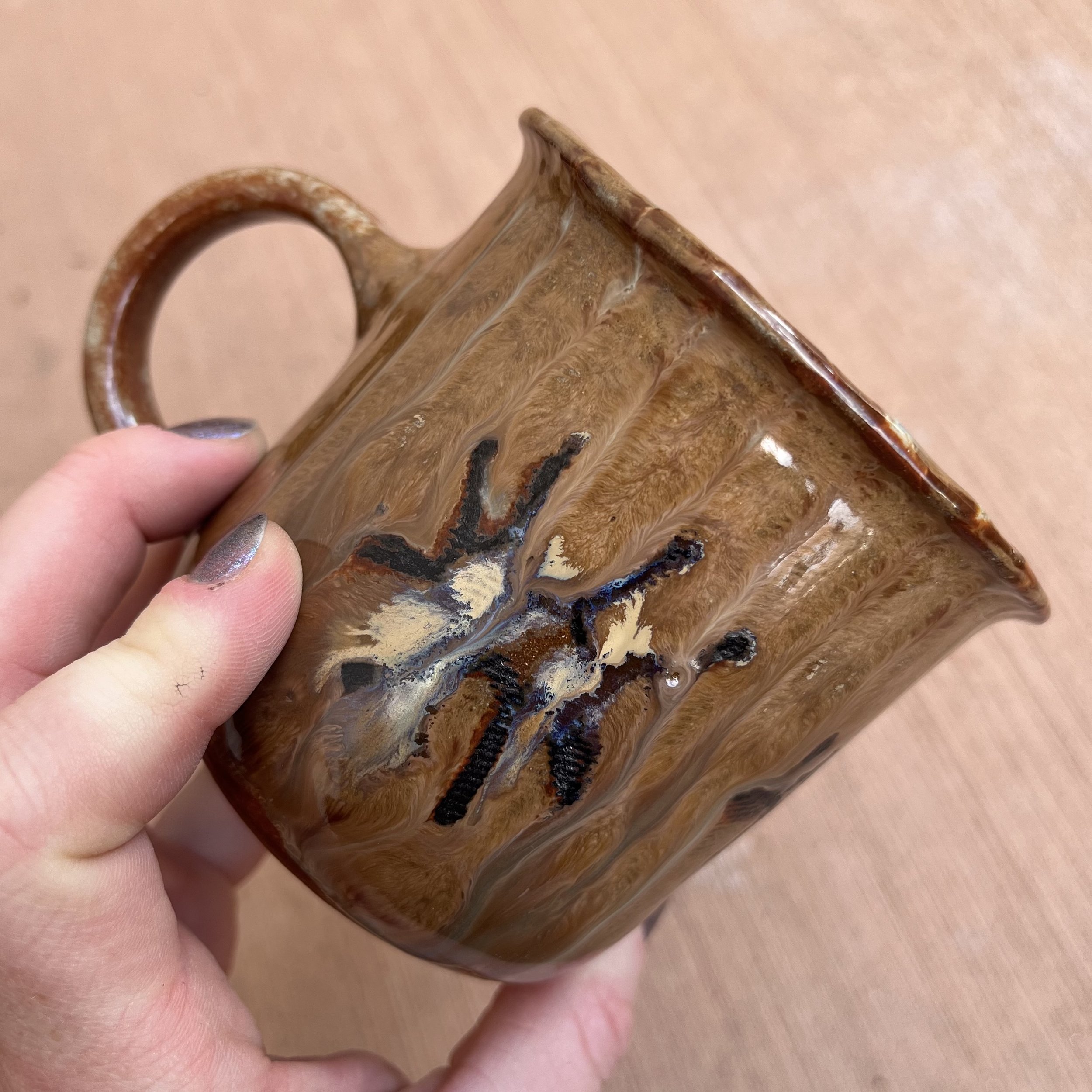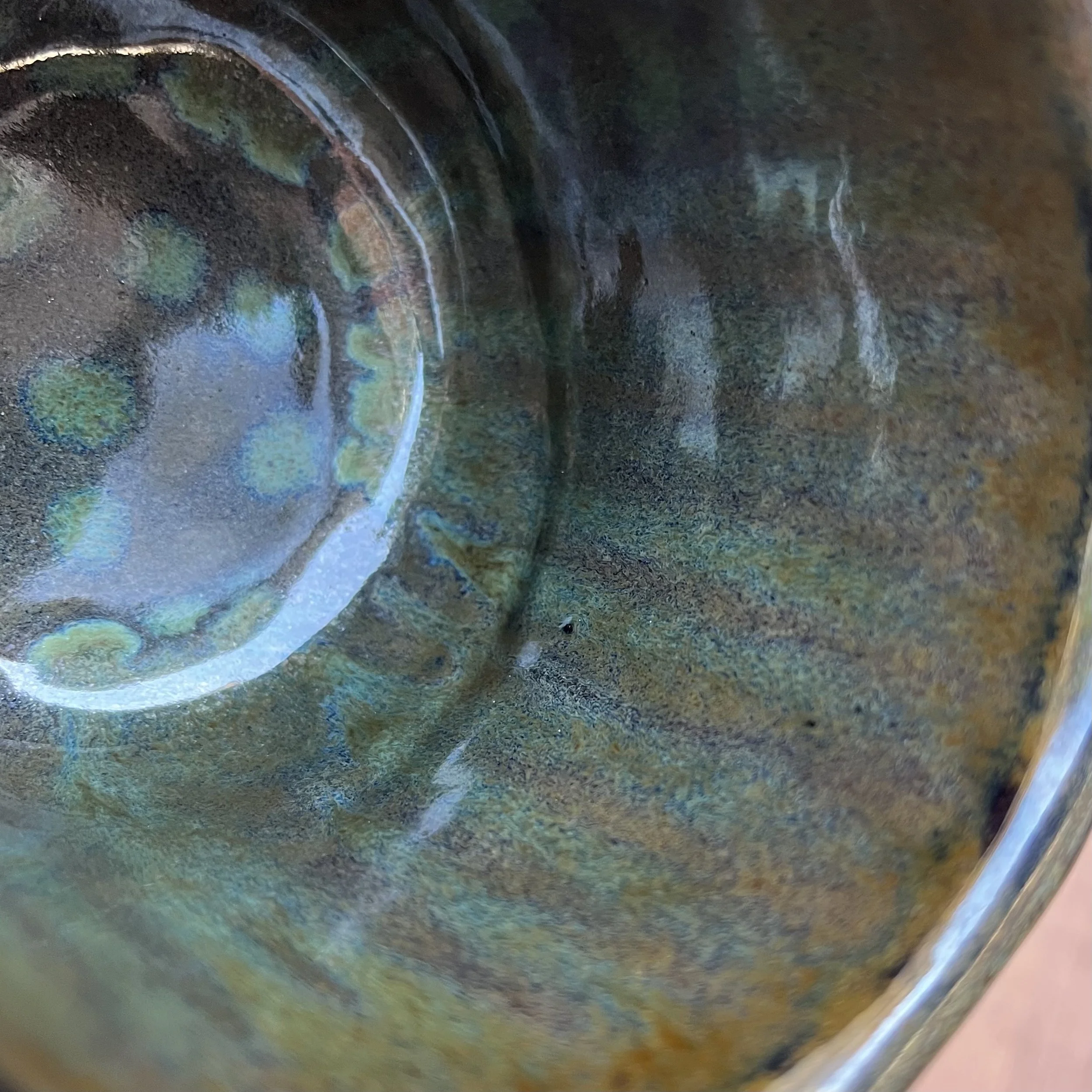 This handbuilt piece is created by cutting slabs of clay and attaching around a form with the addition of a handle. Red clay is fired with a seaweed green base and jade drizzle glaze. Stars are drawn by hand with oil pastels capable of being kiln fired. Holds up to 12 fl oz of liquid.