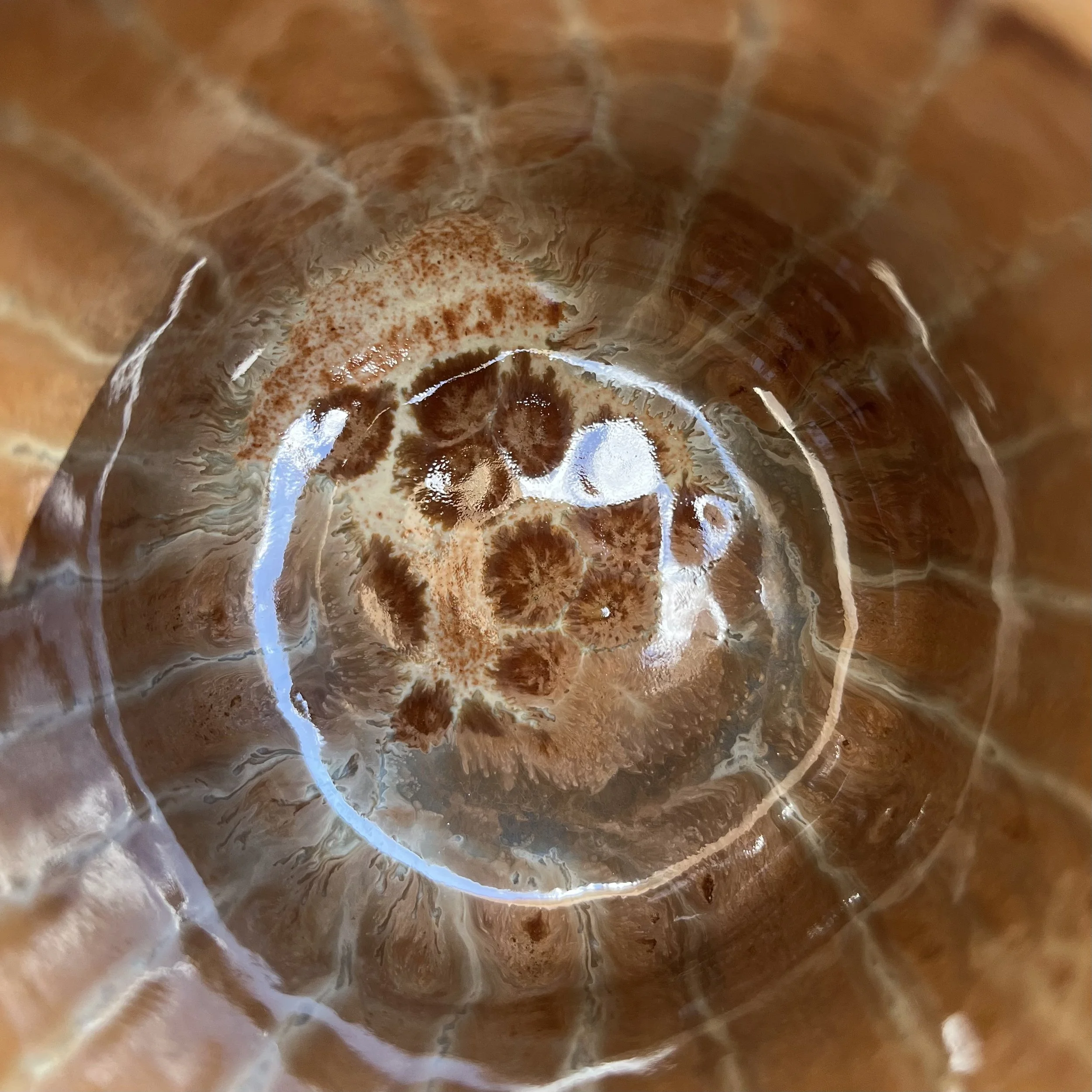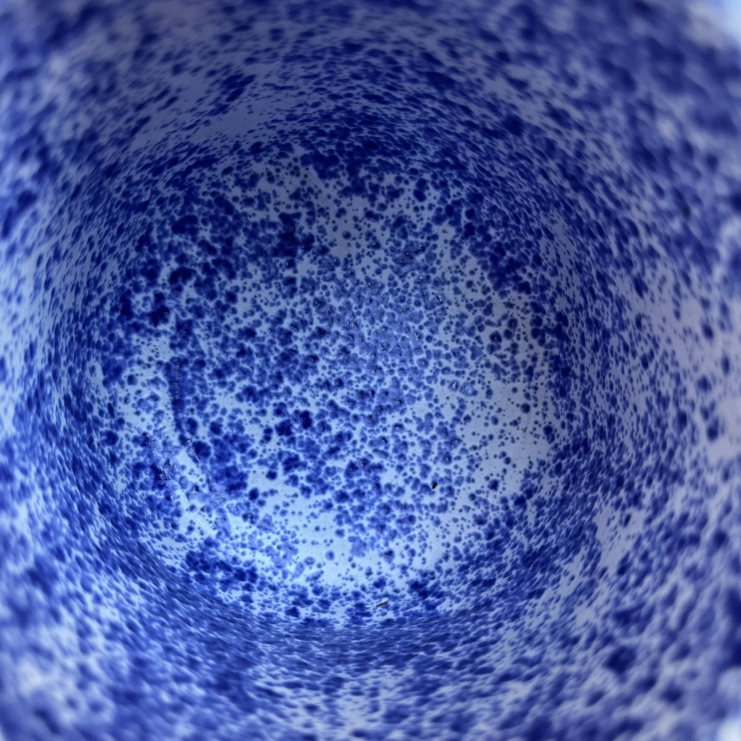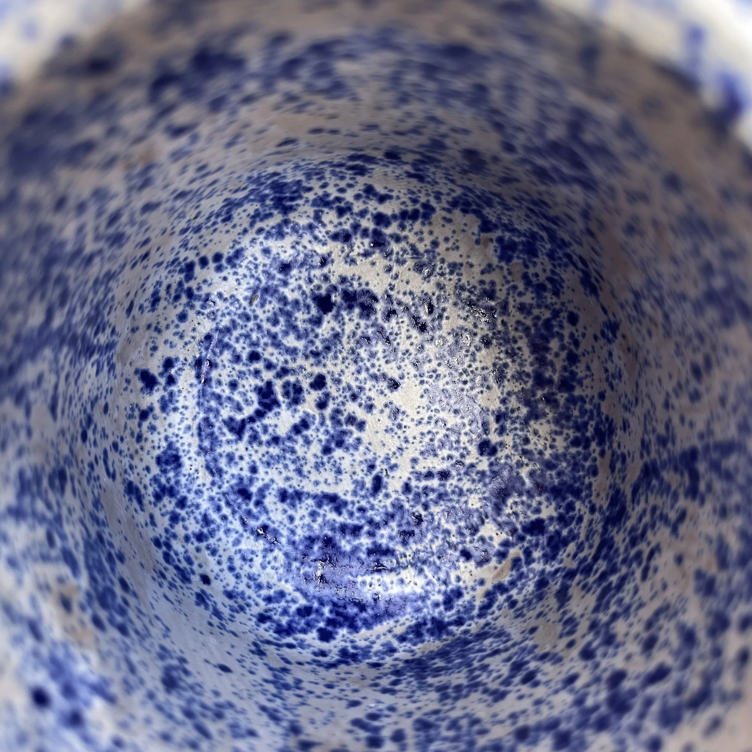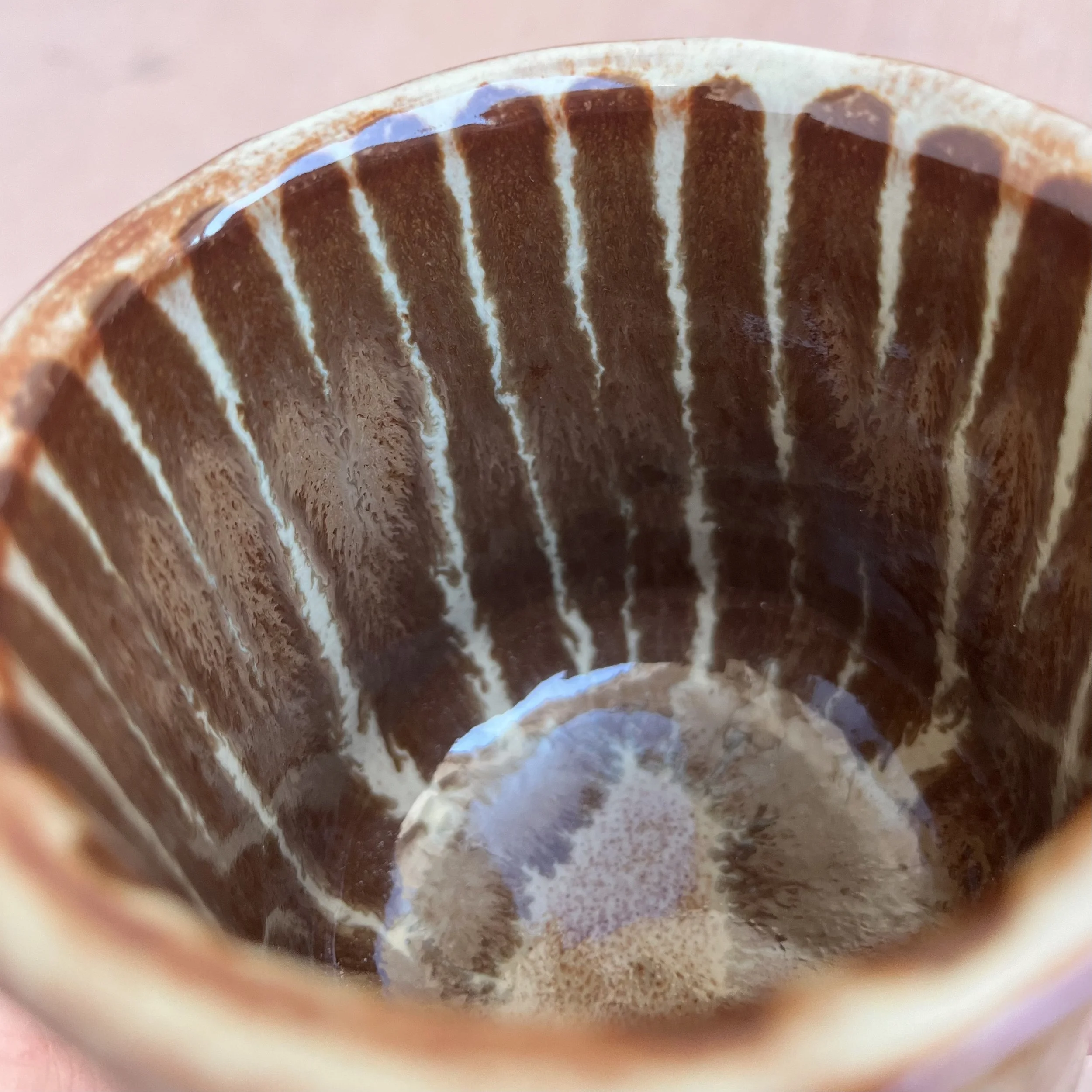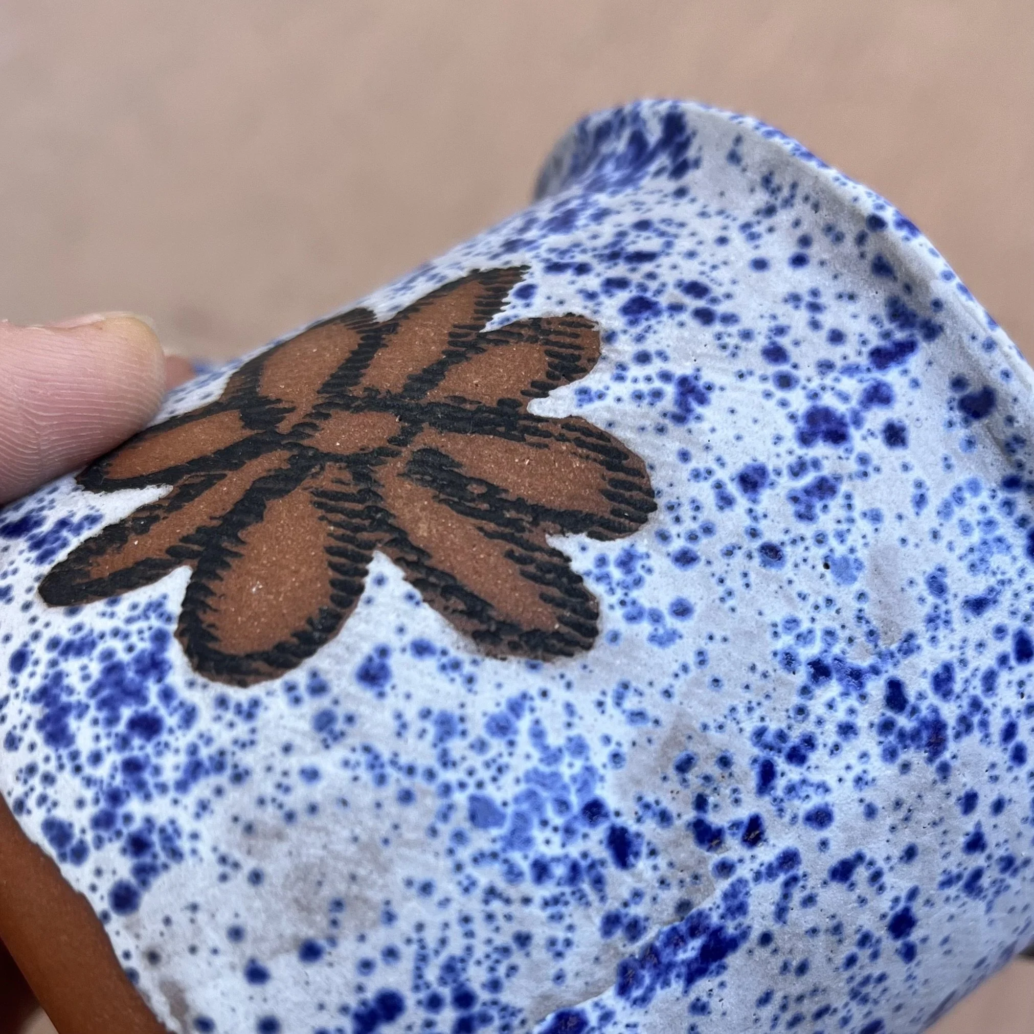 This handbuilt piece is created by cutting slabs of clay and attaching around a form with the addition of a handle. Red clay is fired with a seaweed green base and jade drizzle glaze. Stars are drawn by hand with oil pastels capable of being kiln fired. Holds up to 12 fl oz of liquid.