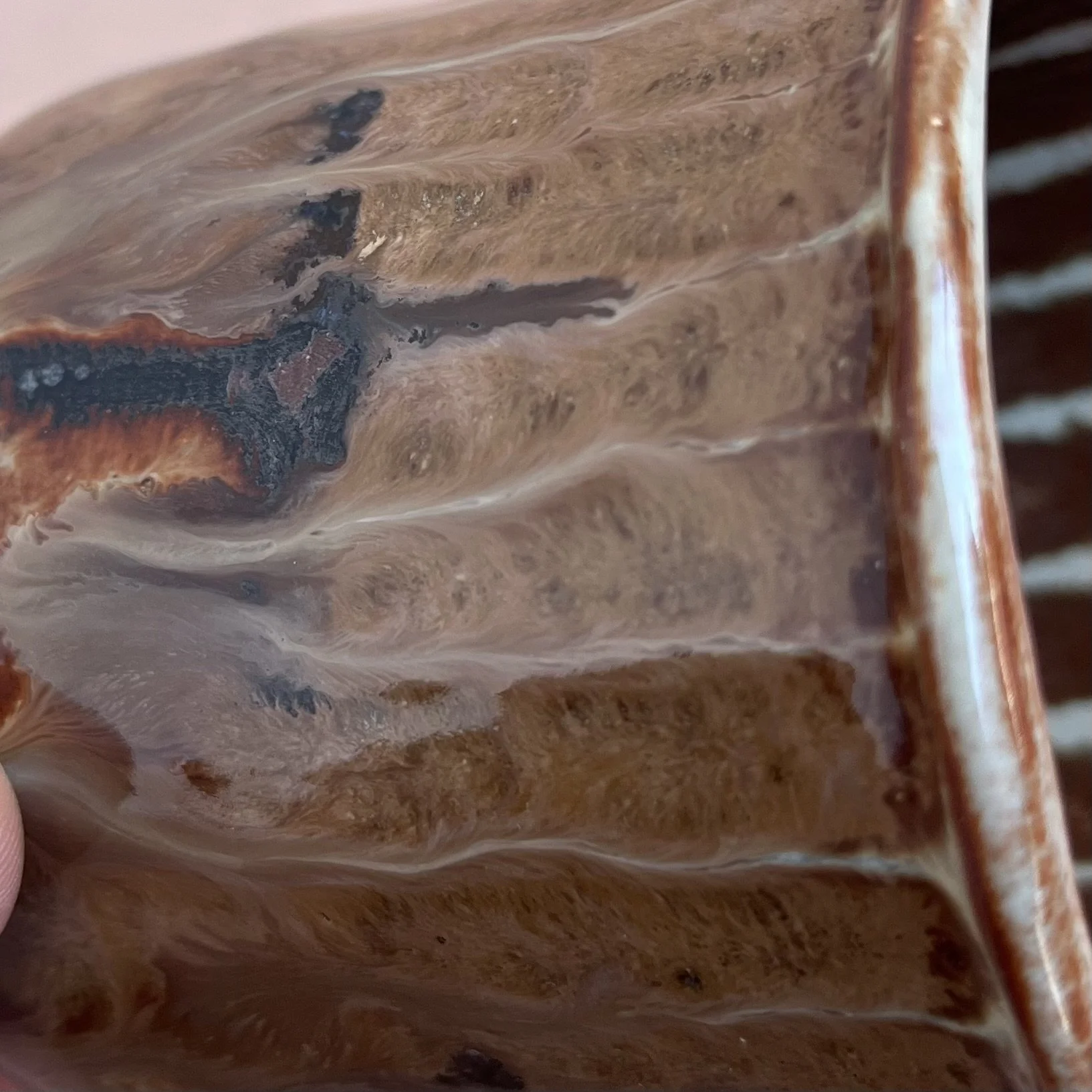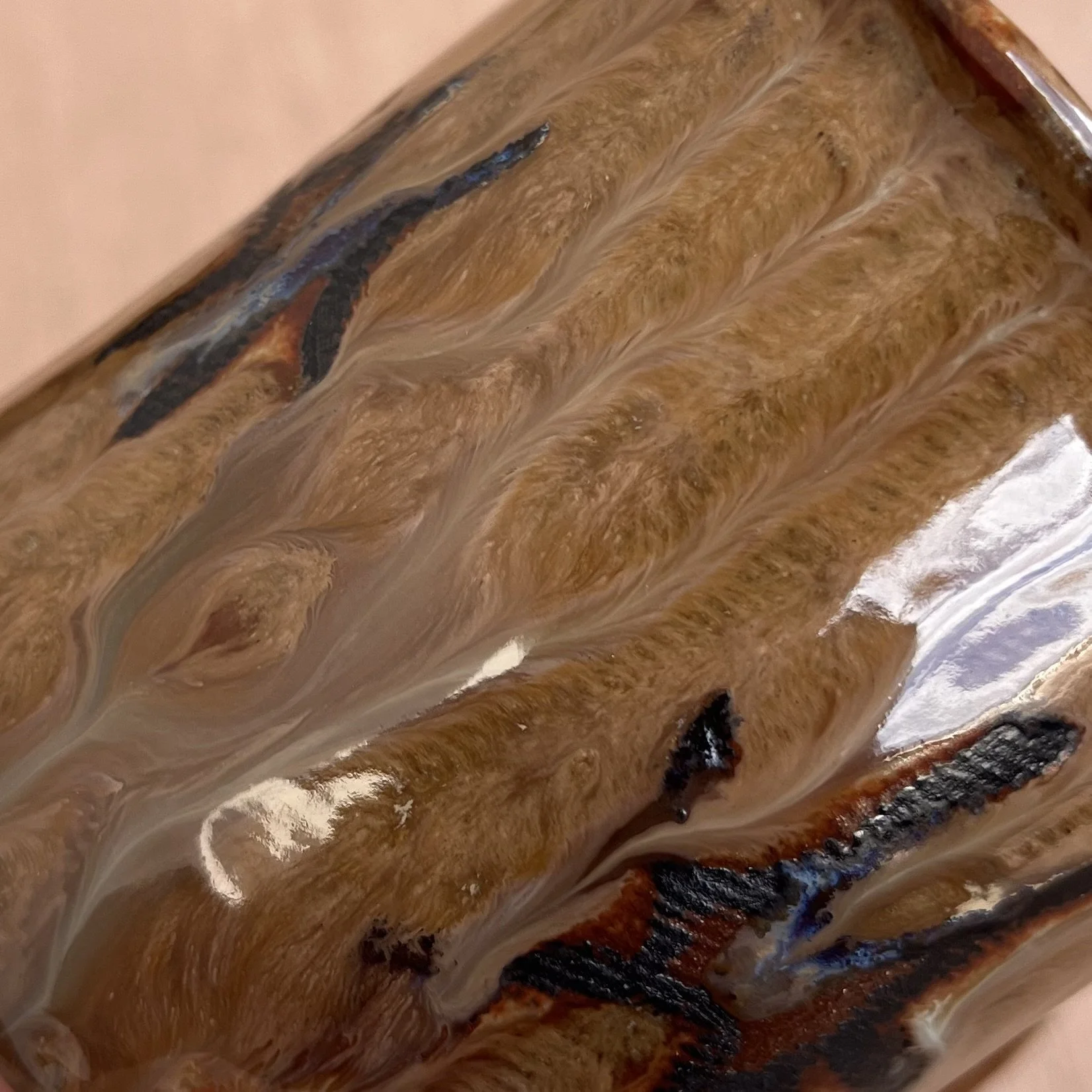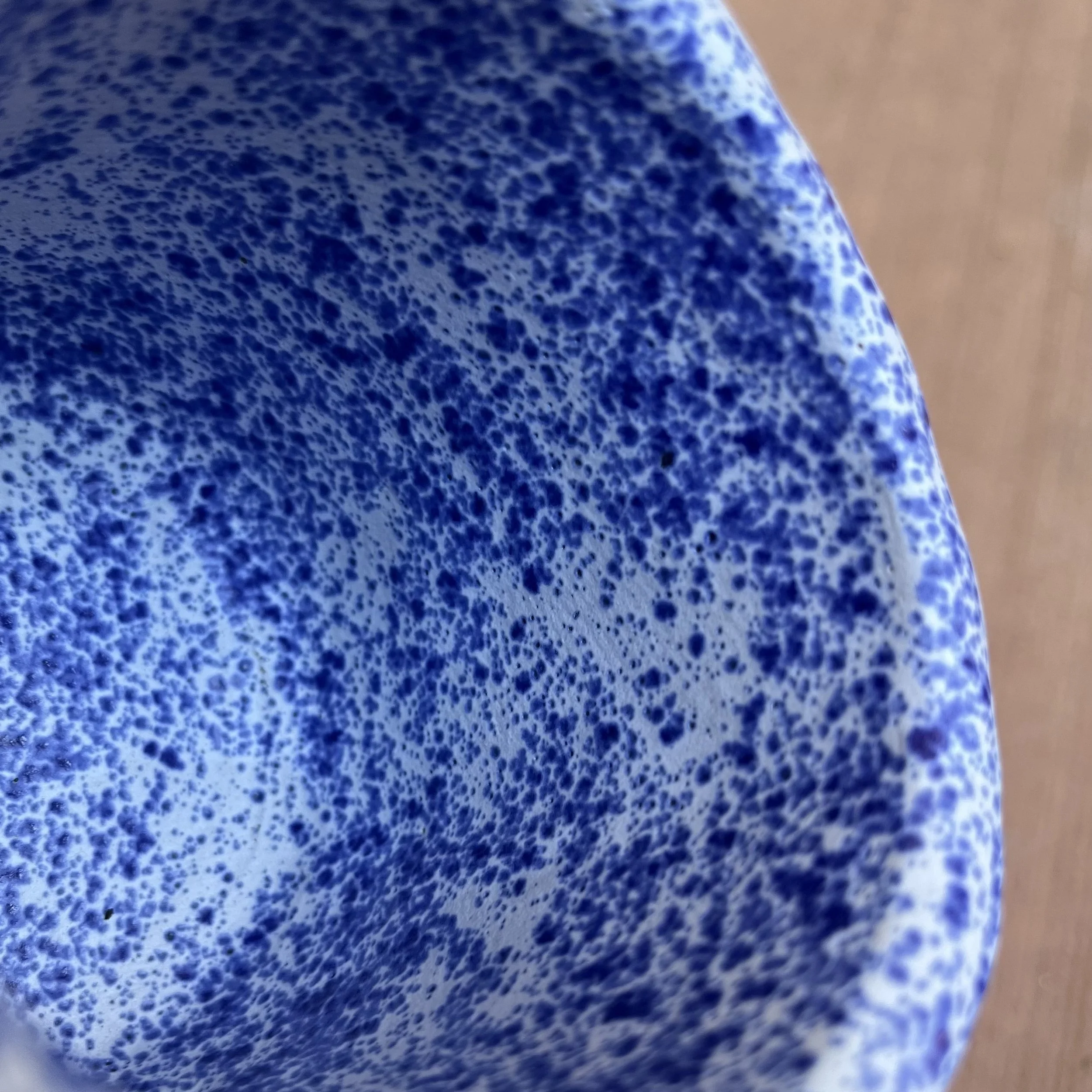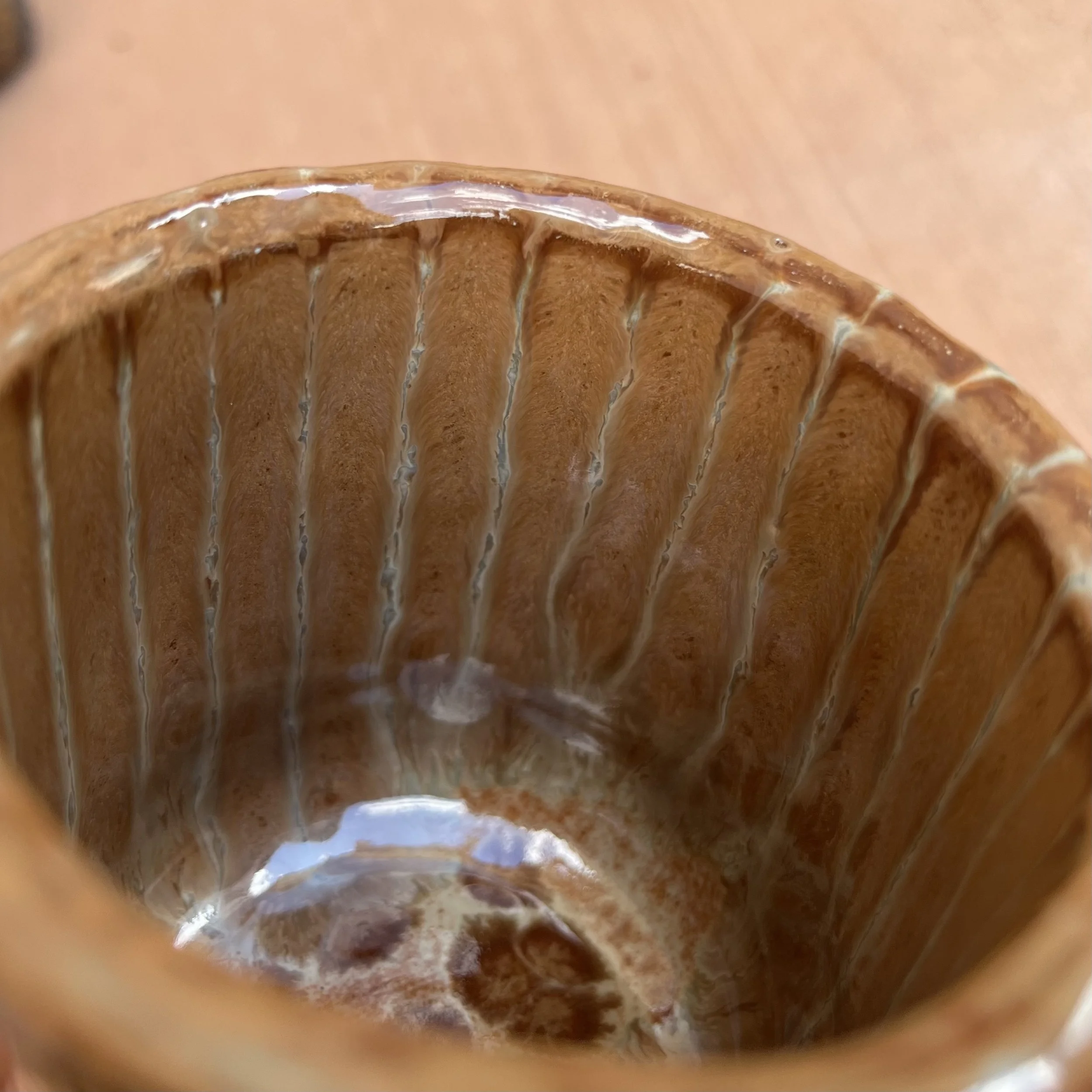 This handbuilt piece is created by cutting slabs of clay and attaching around a form with the addition of a handle. Red clay is fired with a seaweed green base and jade drizzle glaze. Stars are drawn by hand with oil pastels capable of being kiln fired. Holds up to 12 fl oz of liquid.