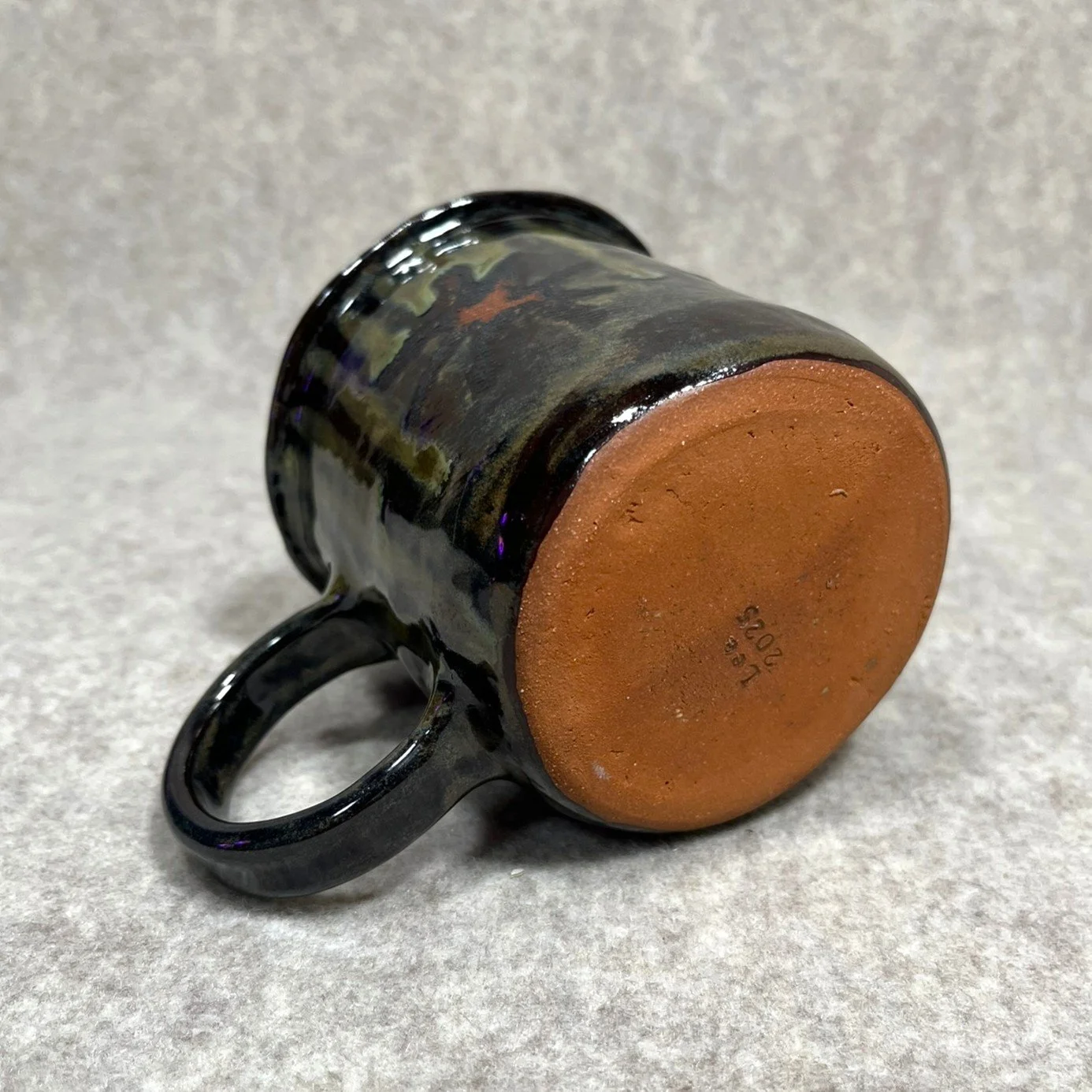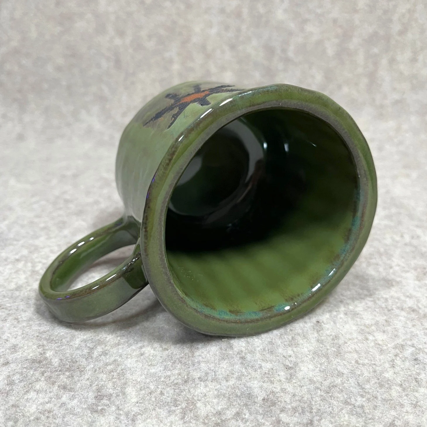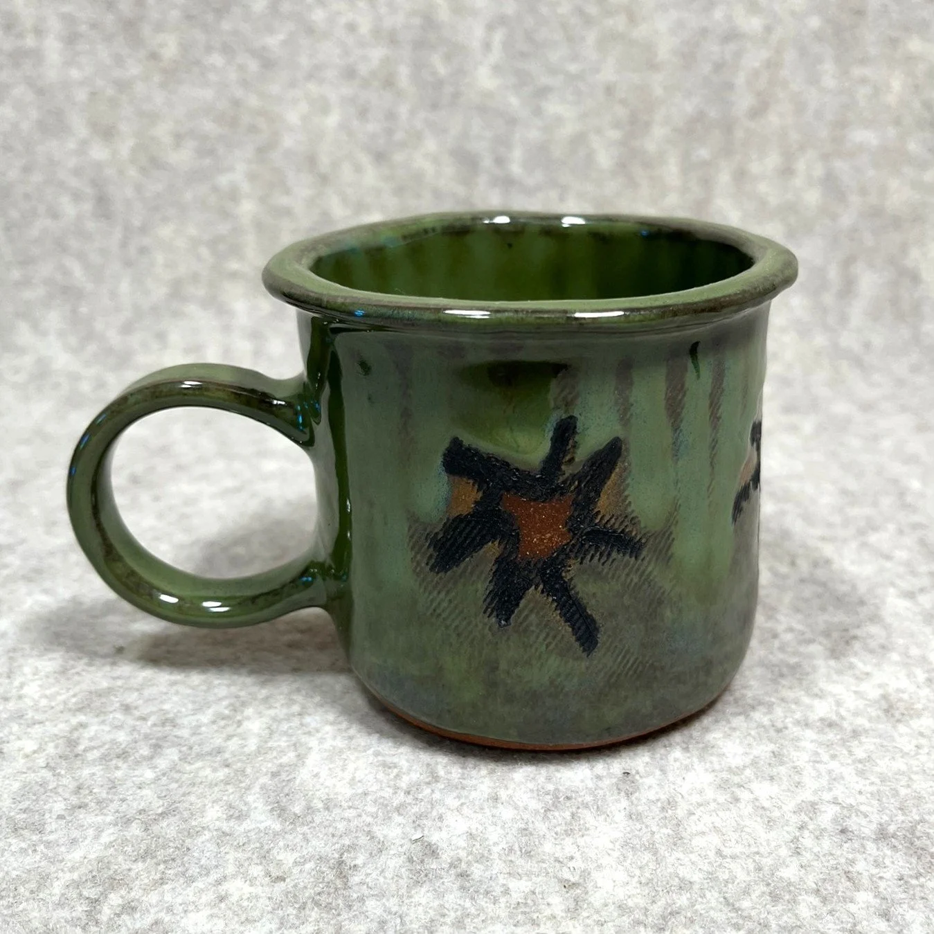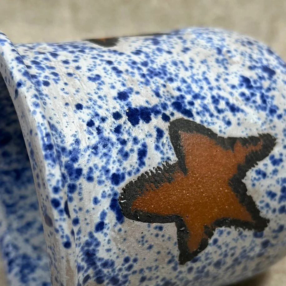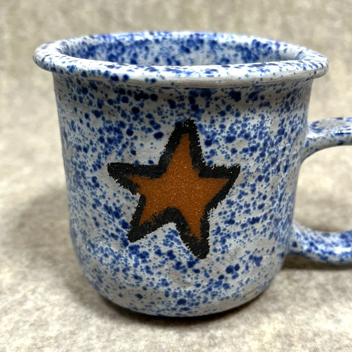 This handbuilt piece is created by cutting slabs of clay and attaching around a form with the addition of a handle. Red/orange clay is fired with a combination of green and orange drizzling glaze. Subtle metallic streaks can be seen in the glaze. Stars are drawn by hand with oil pastels cabable of being kiln fired. Holds up to 12 fl oz of liquid.