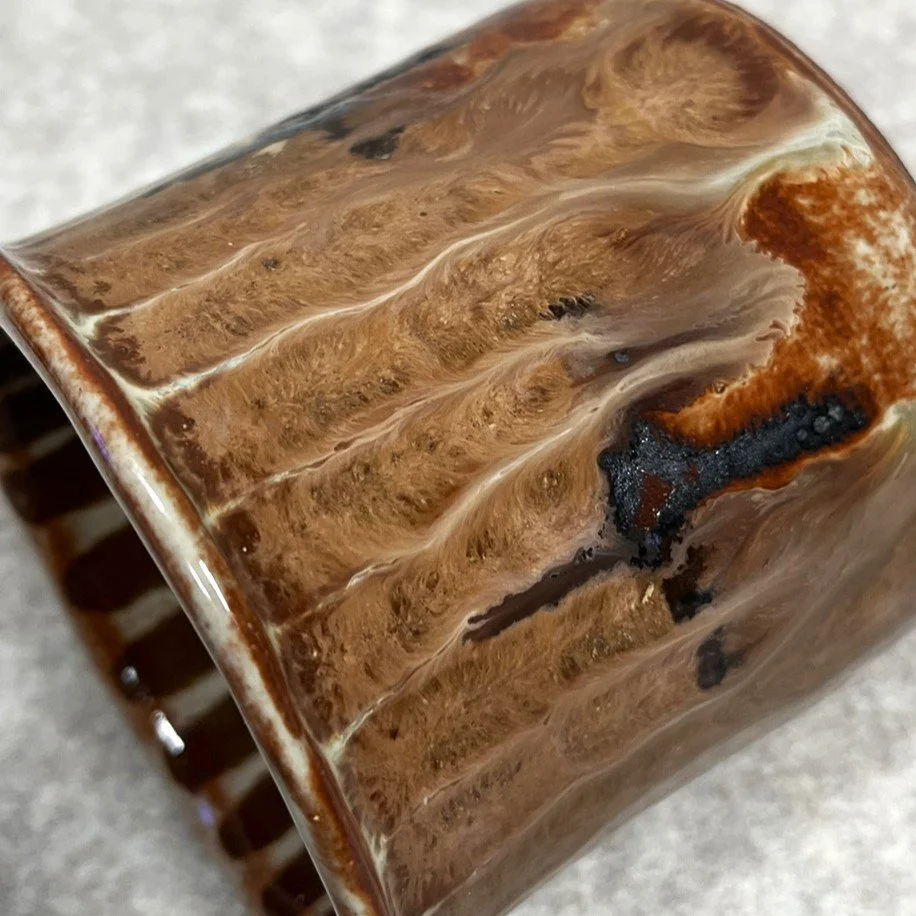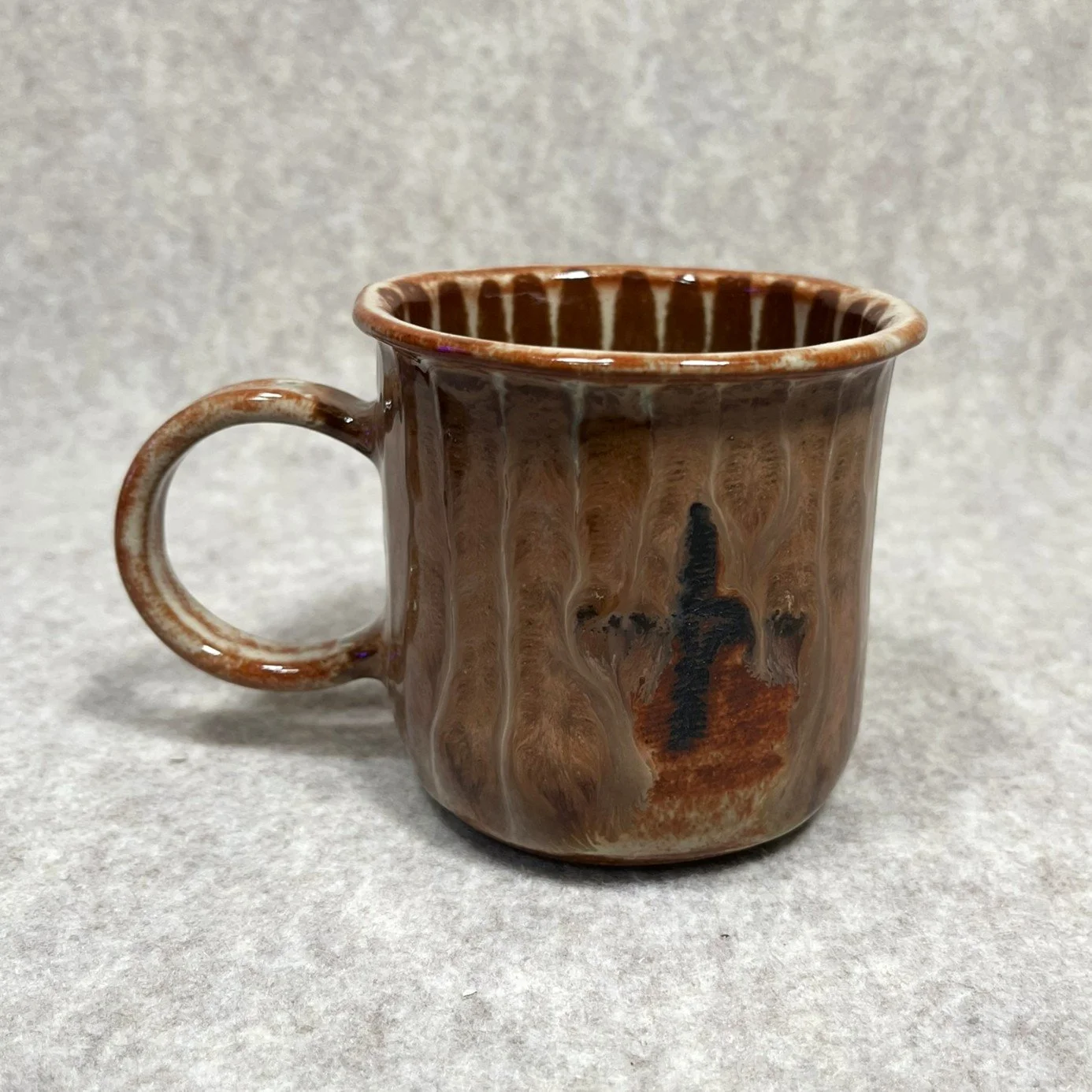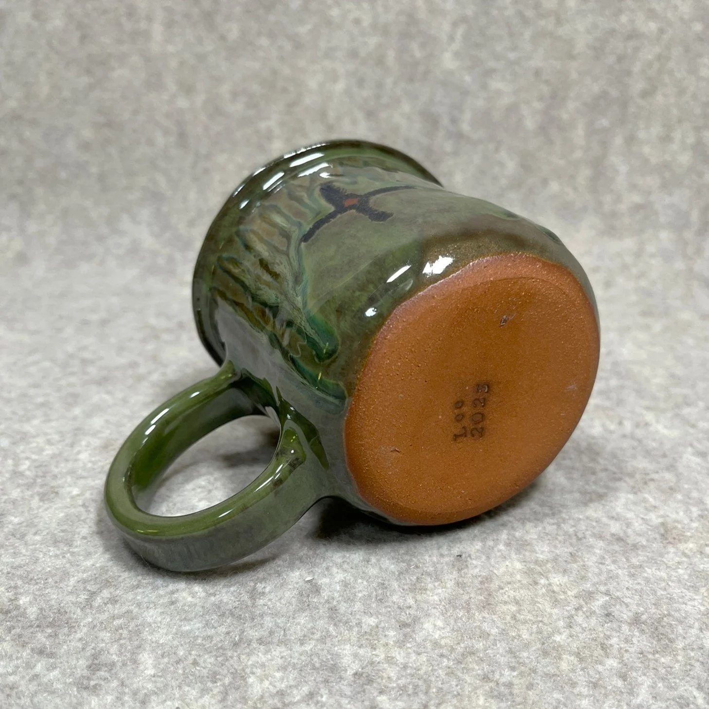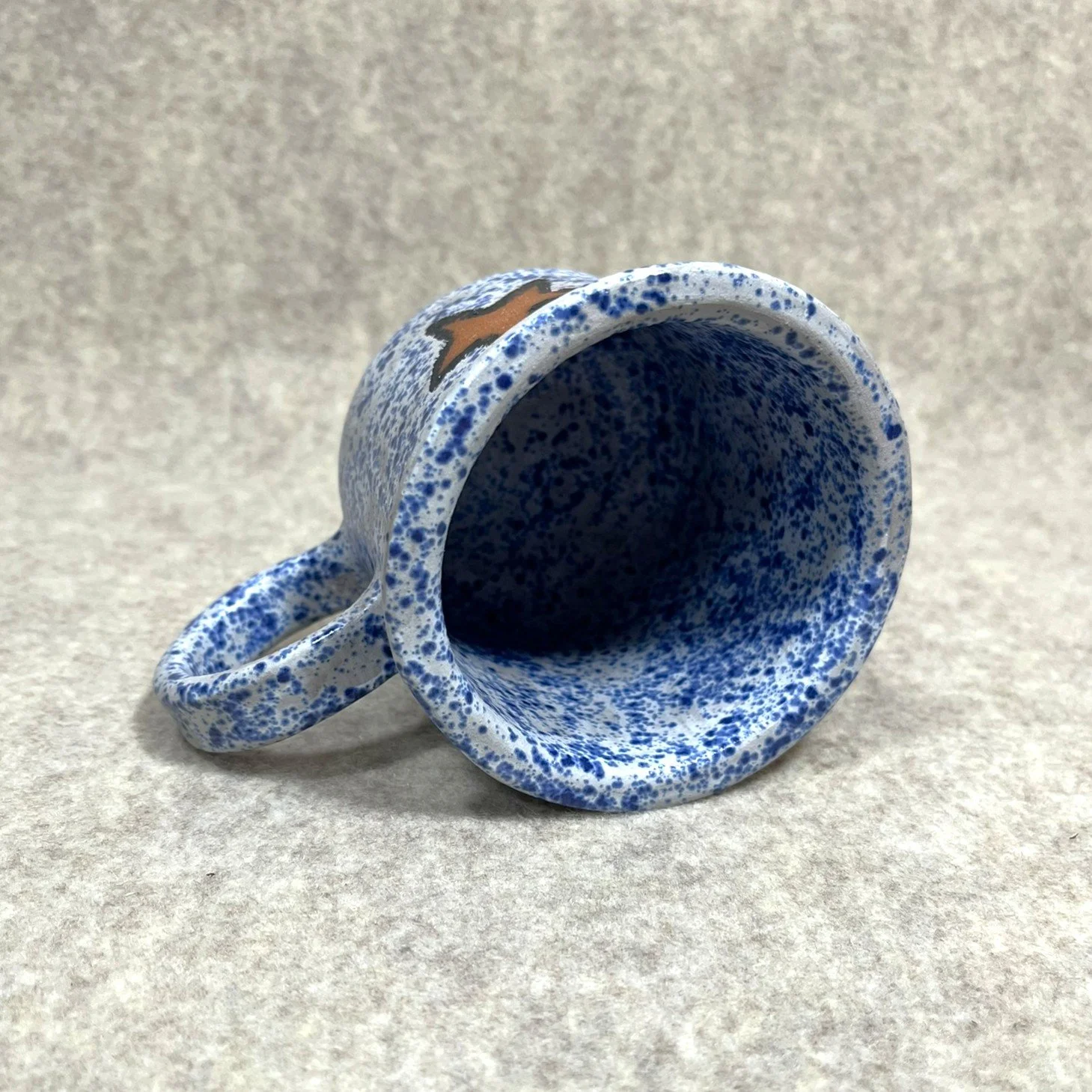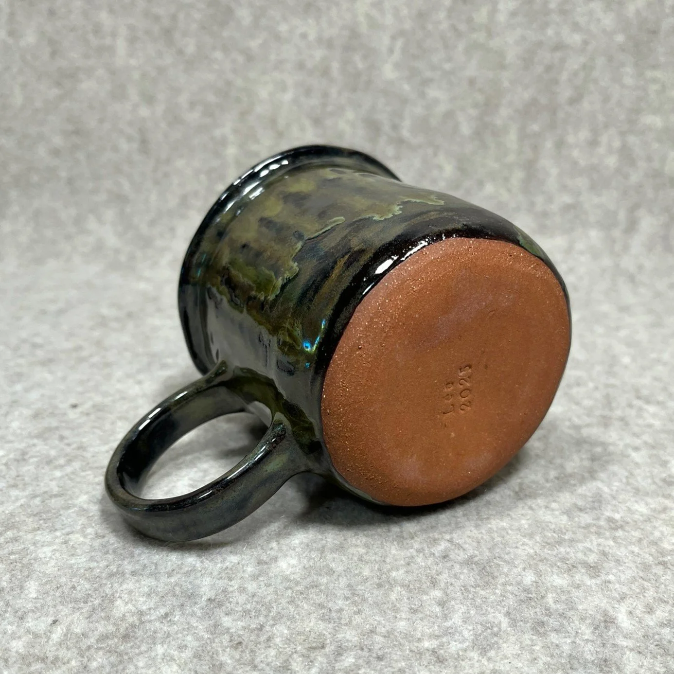 This handbuilt piece is created by cutting slabs of clay and attaching around a form with the addition of a handle. Red/orange clay is fired with a combination of green and orange drizzling glaze. Subtle metallic streaks can be seen in the glaze. Stars are drawn by hand with oil pastels cabable of being kiln fired. Holds up to 12 fl oz of liquid.