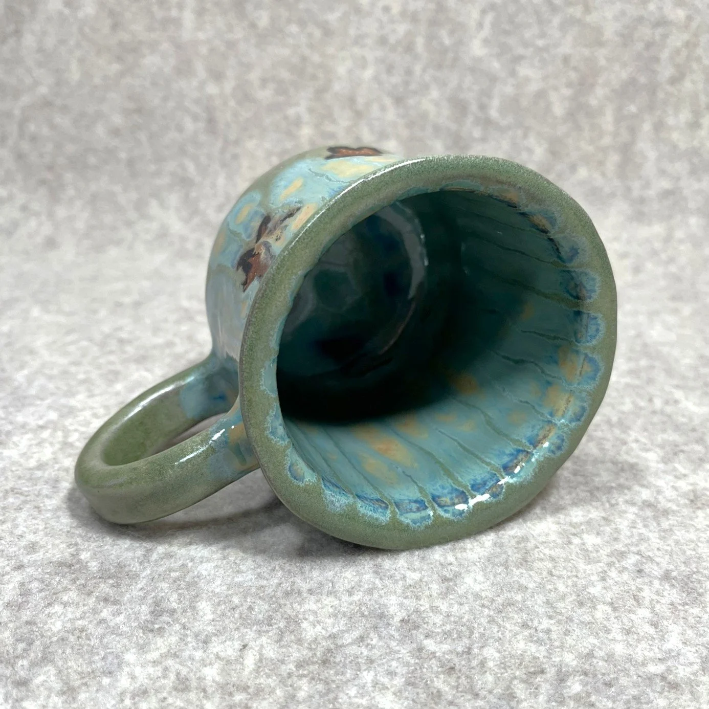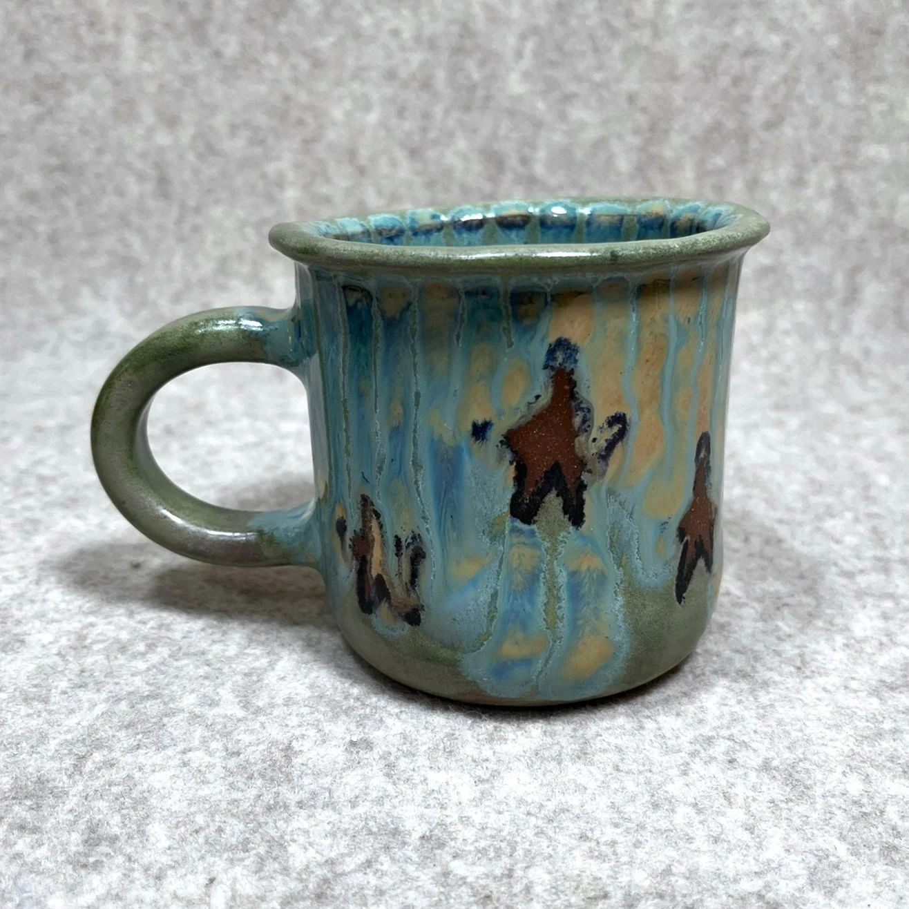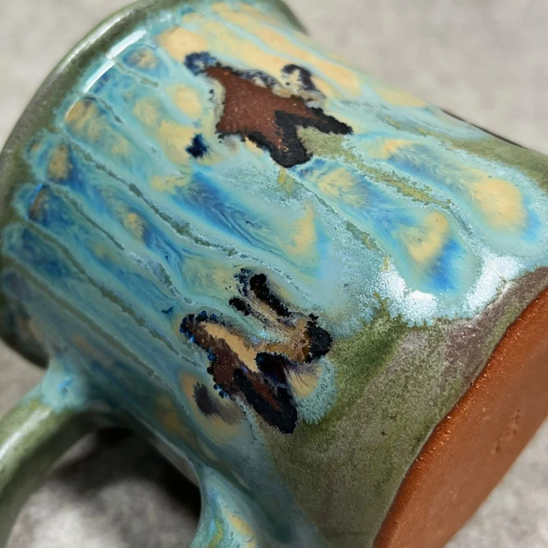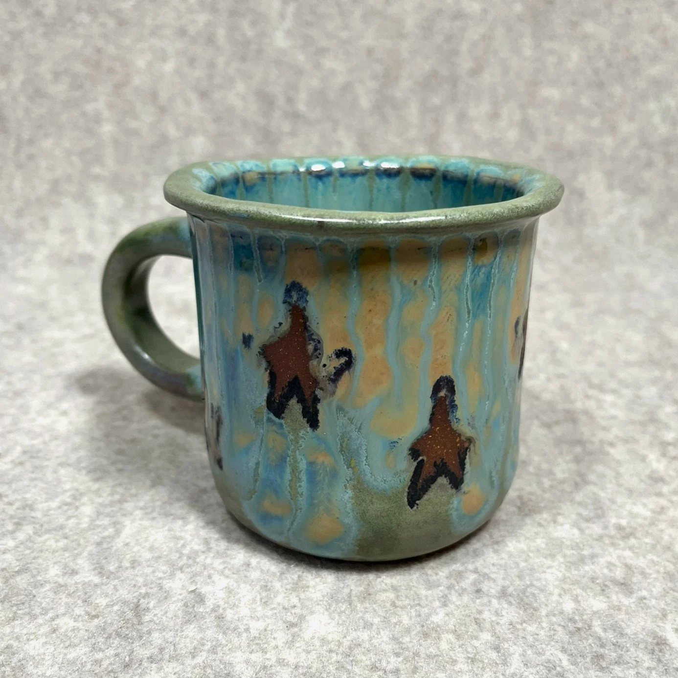 This handbuilt piece is created by cutting slabs of clay and attaching around a form with the addition of a handle. Red/orange clay is fired with a combination of black and green drizzling glaze. Subtle metallic crystalline structures can be seen in the glaze. Stars are drawn by hand with oil pastels cabable of being kiln fired. As the glaze fired and covered up the stars, small pieces peek through to create an appealing texture on the body. Holds up to 12 fl oz of liquid.