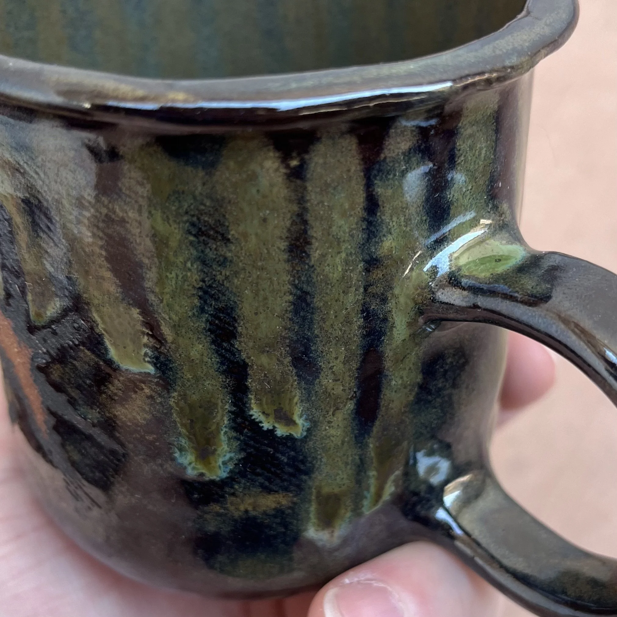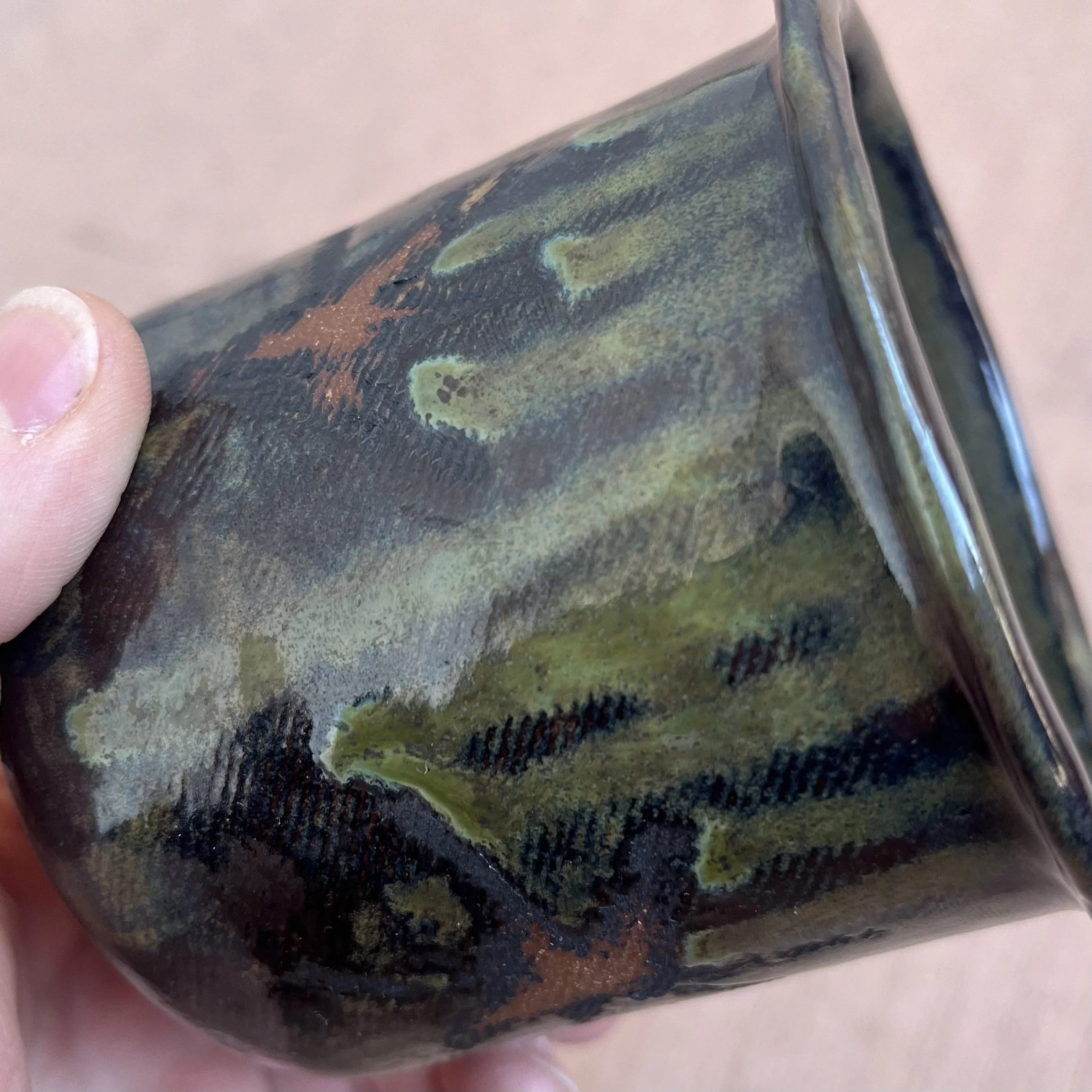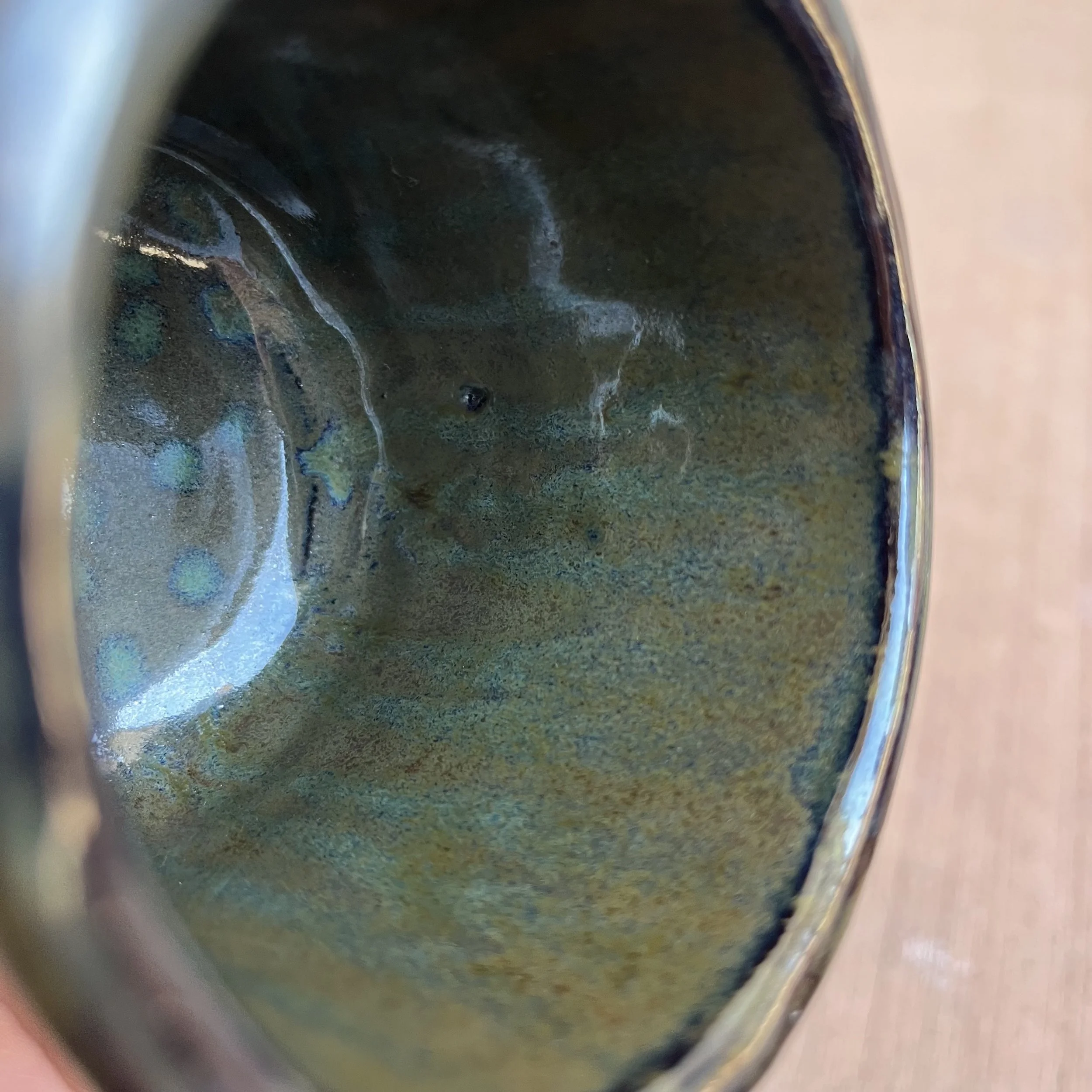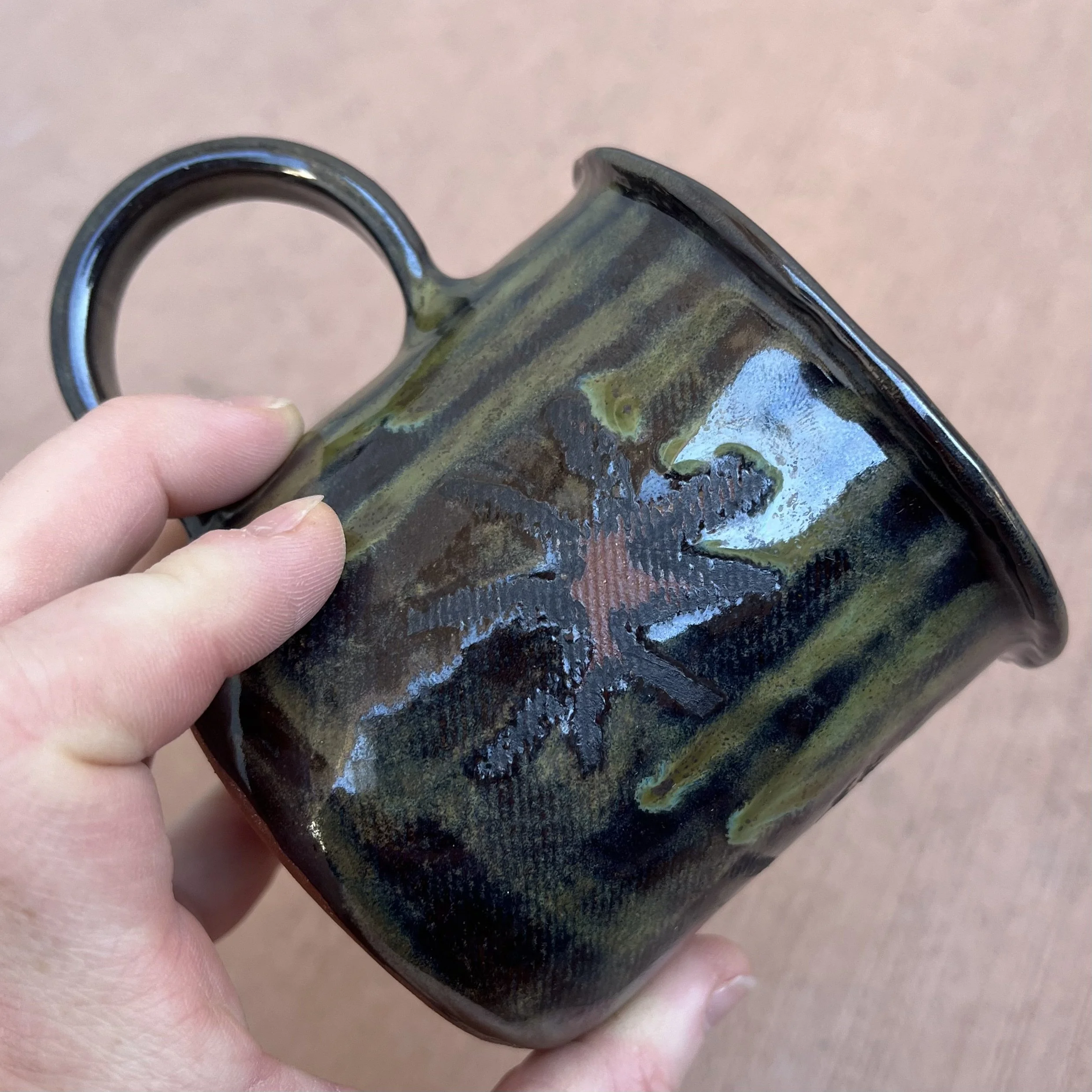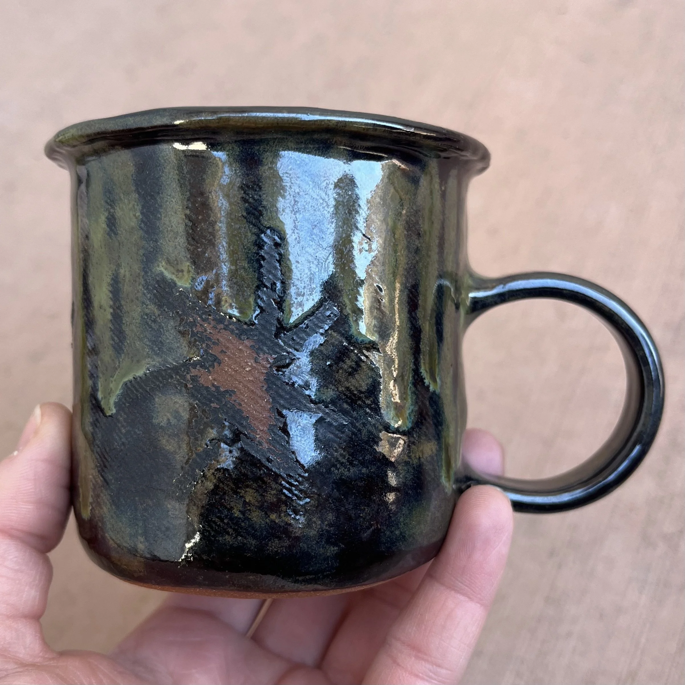 This handbuilt piece is created by cutting slabs of clay and attaching around a form with the addition of a handle. Red clay is fired with a semi-gloss speckled blue on white glaze. Stars are drawn by hand with oil pastels capable of being kiln fired. Holds up to 12 fl oz of liquid.