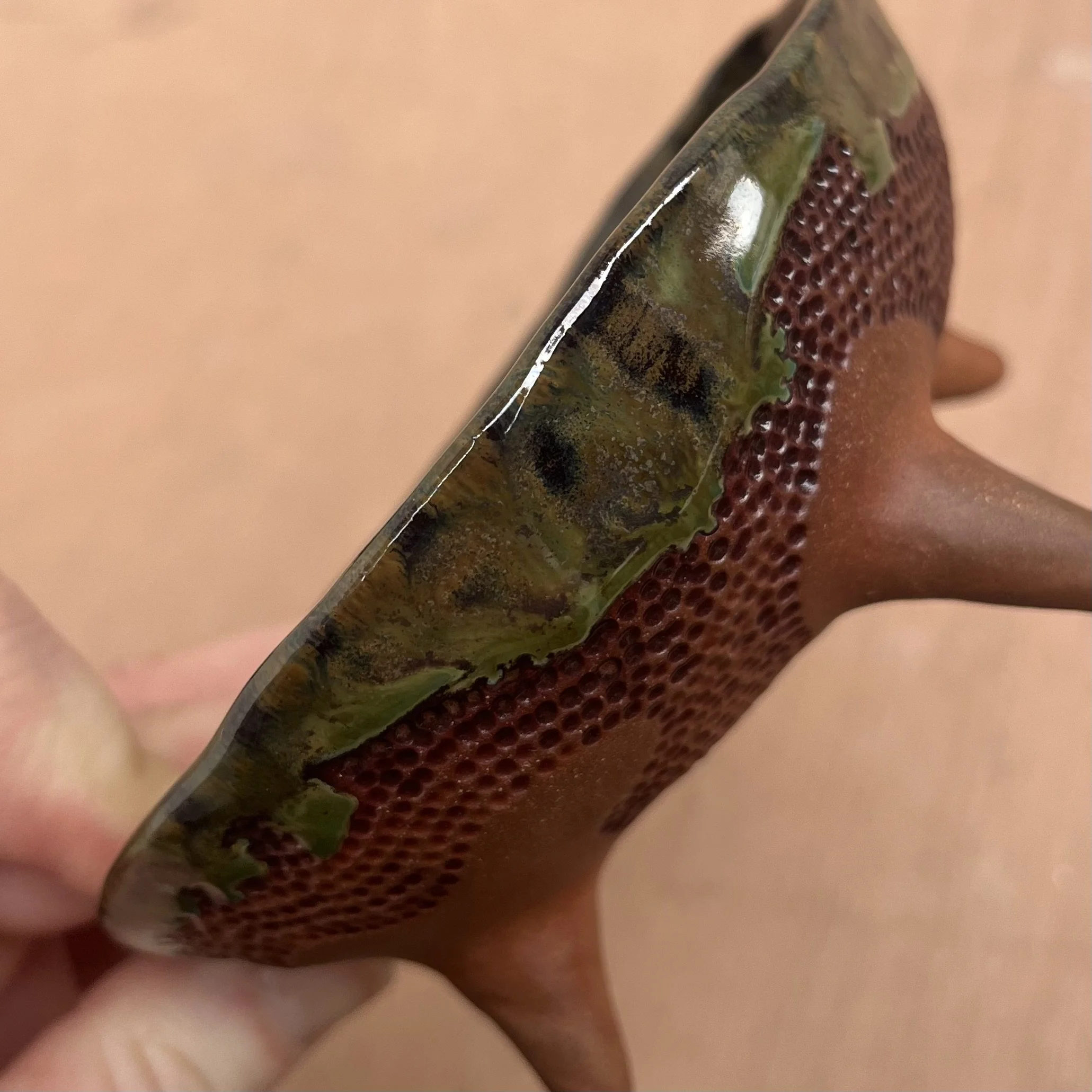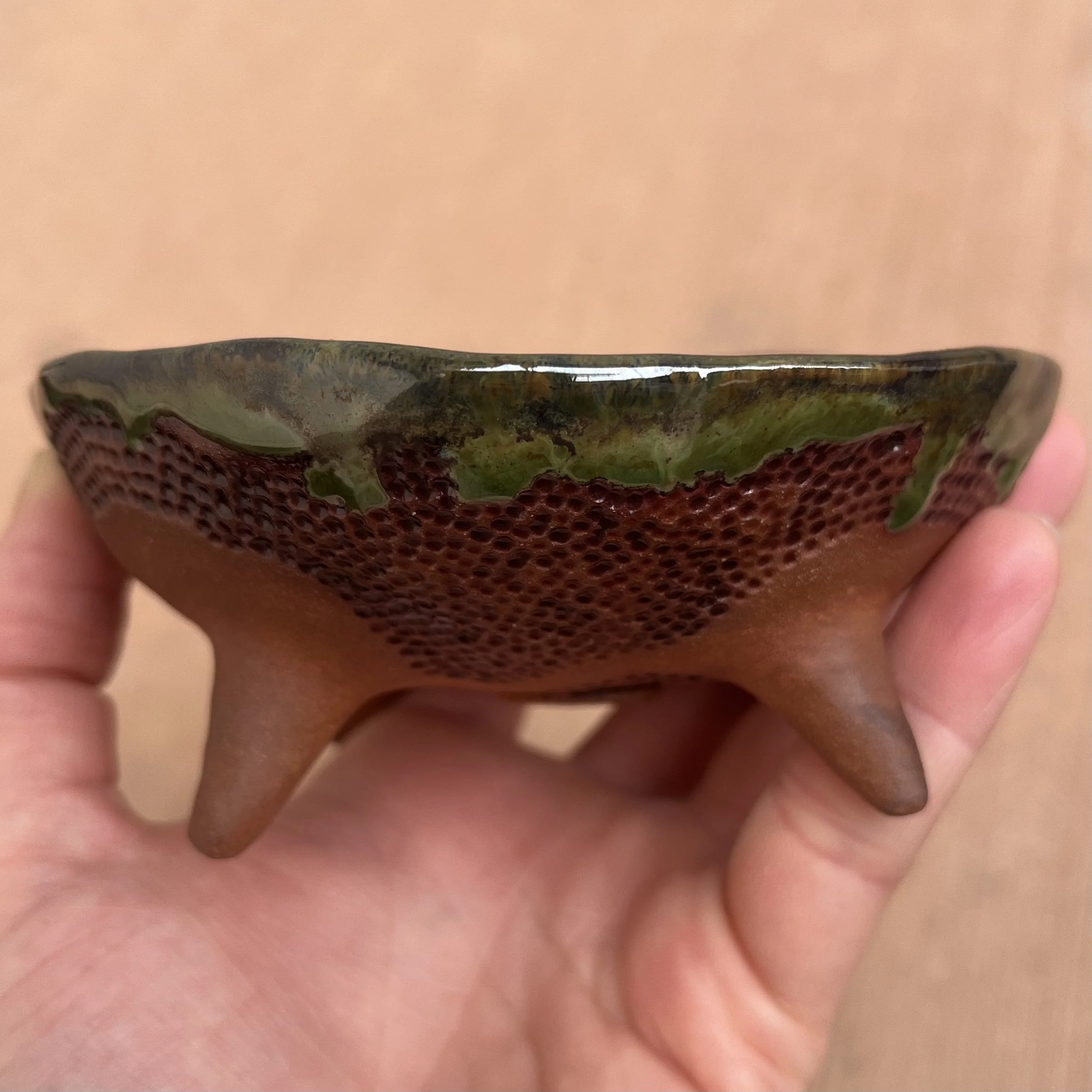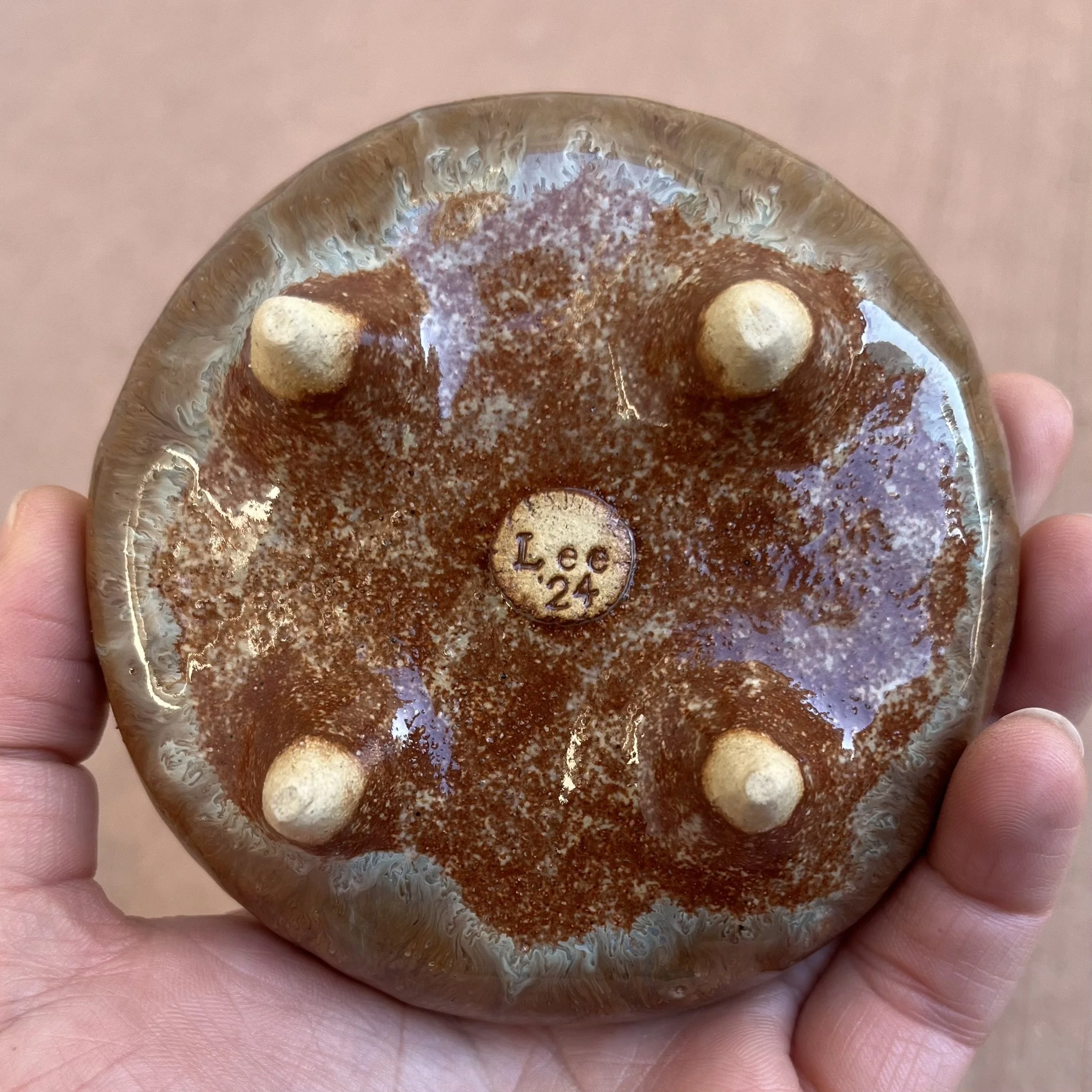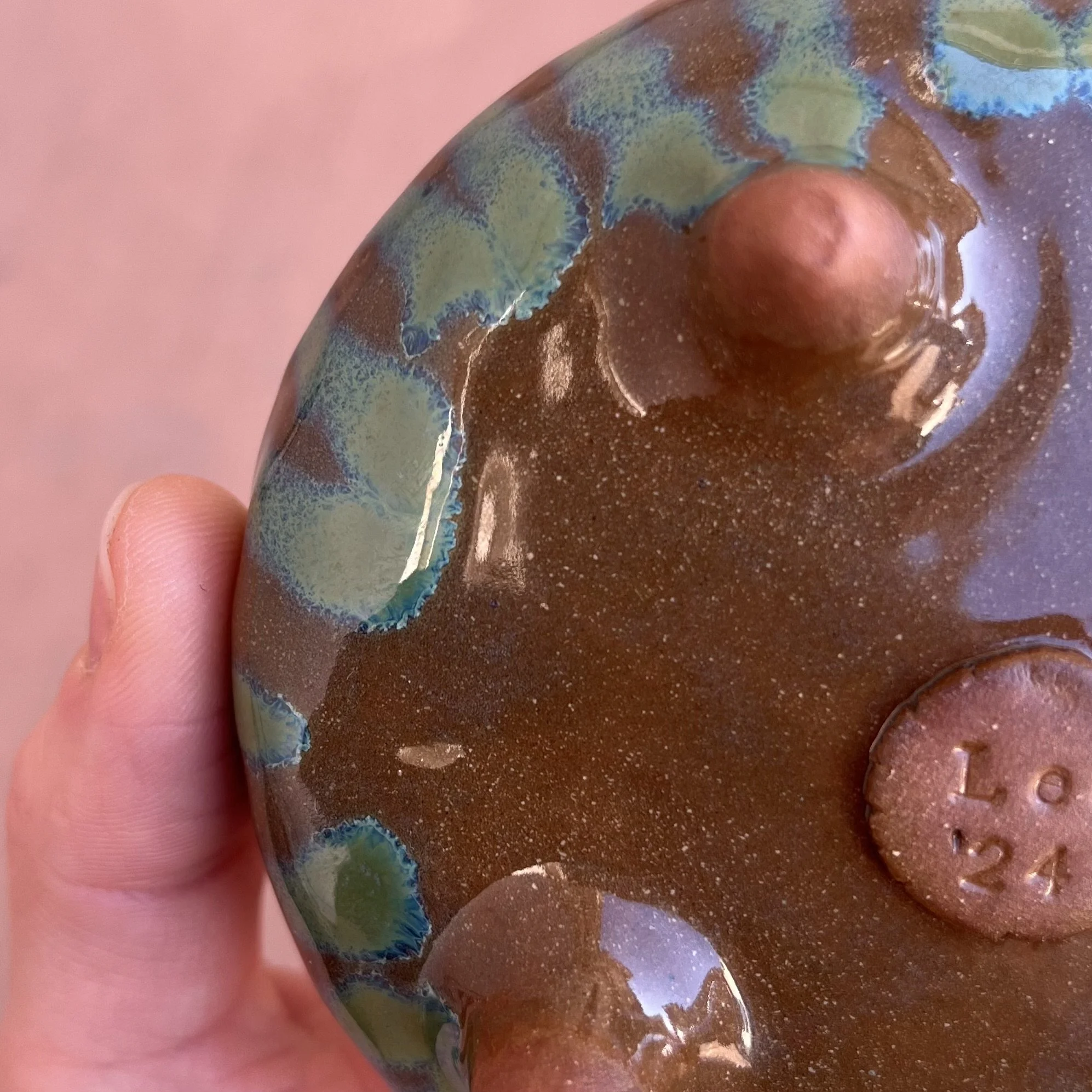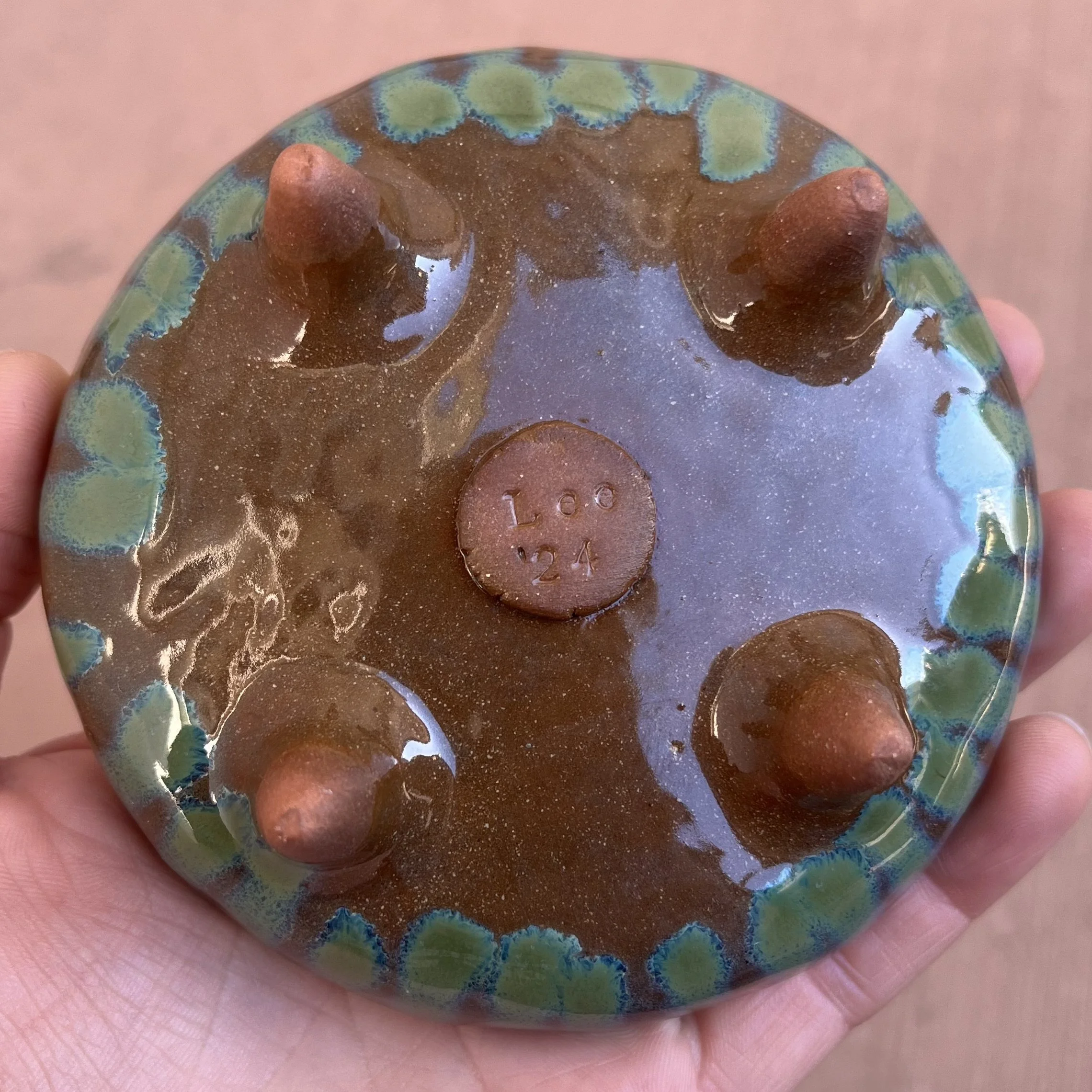 Using a hand pinch technique to create an imperfect aesthetic, this dish sits atop 4 pointed legs to elevate the piece. Red clay is fired with a semi-gloss speckled blue on white glaze. Dimples are added to the underside of the dish that form a clear design. The glaze settles into the dimples to further accentuate the design.