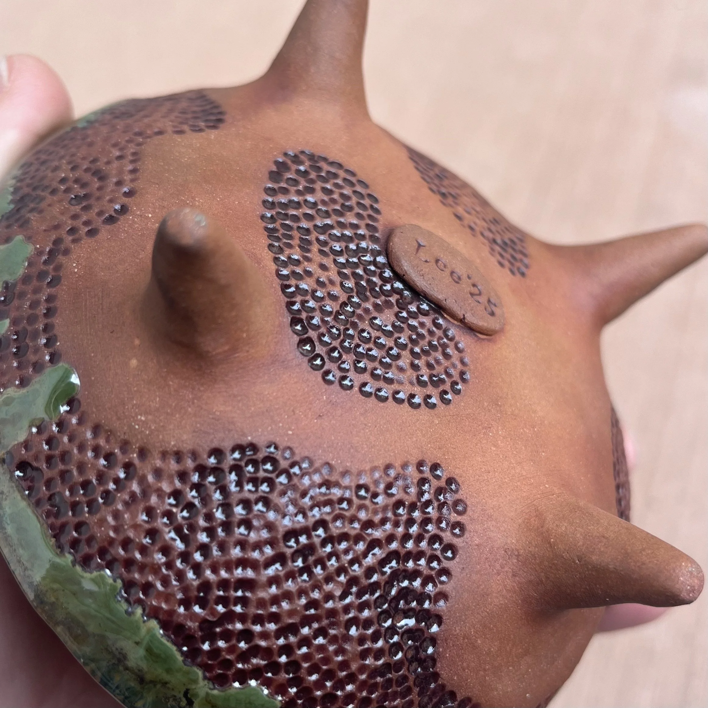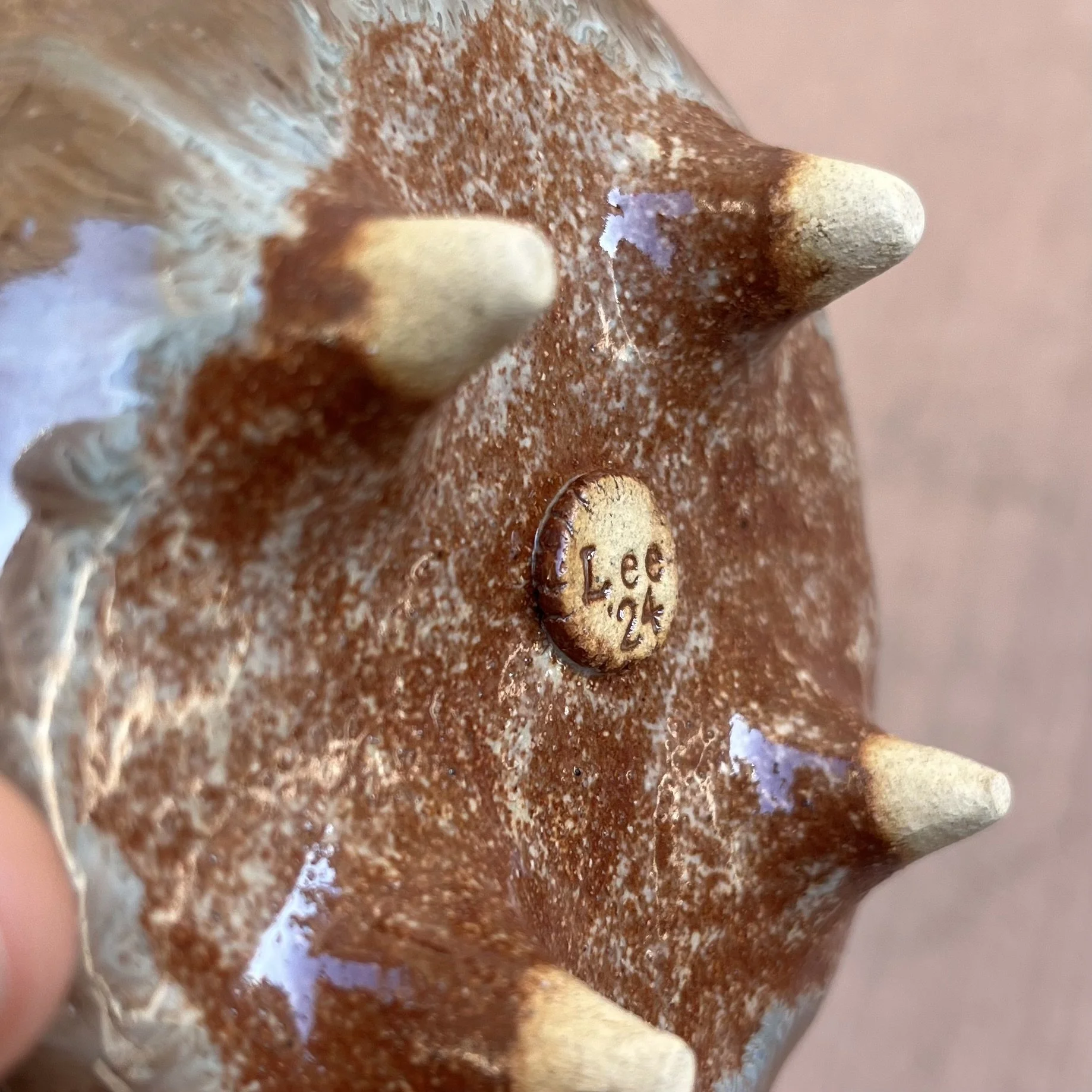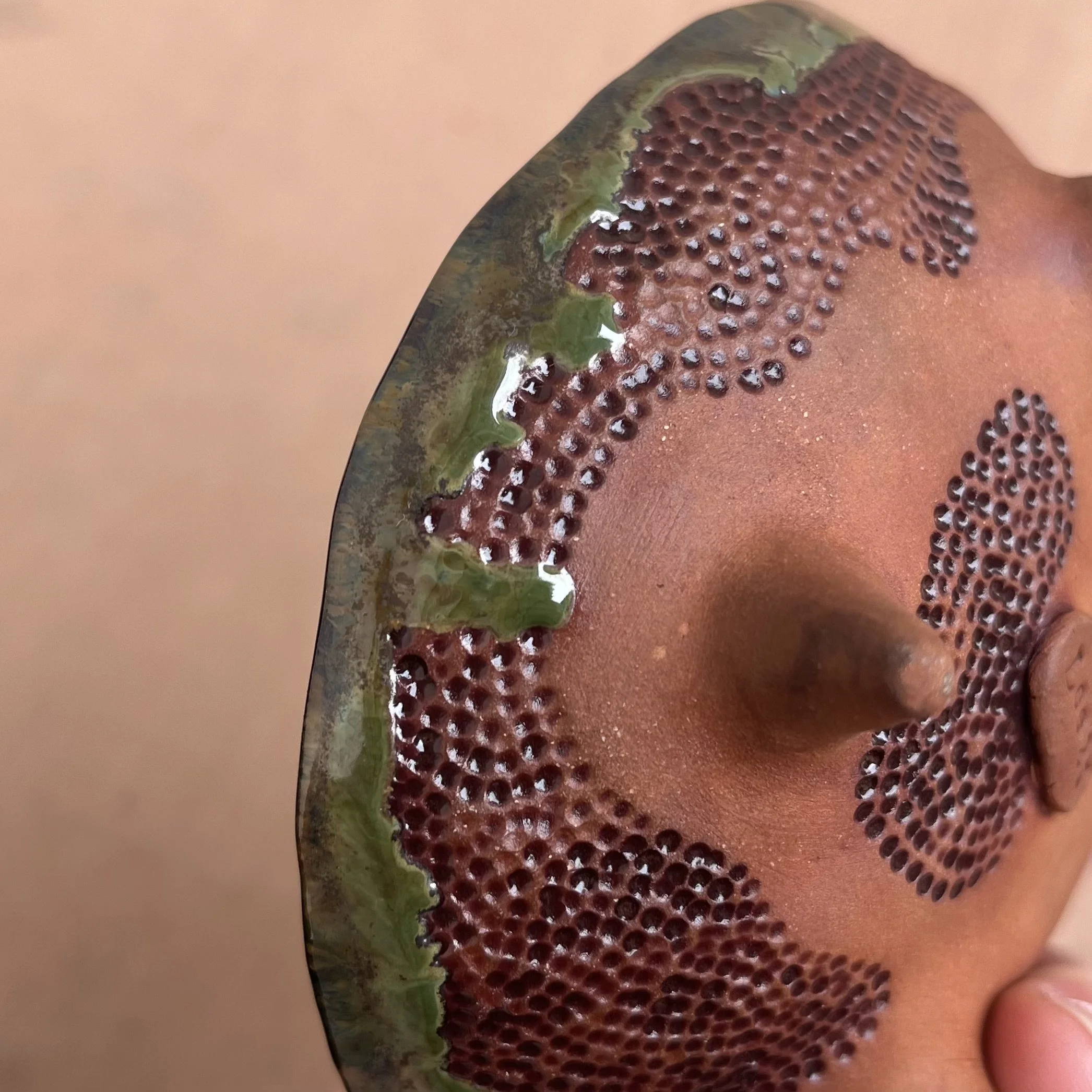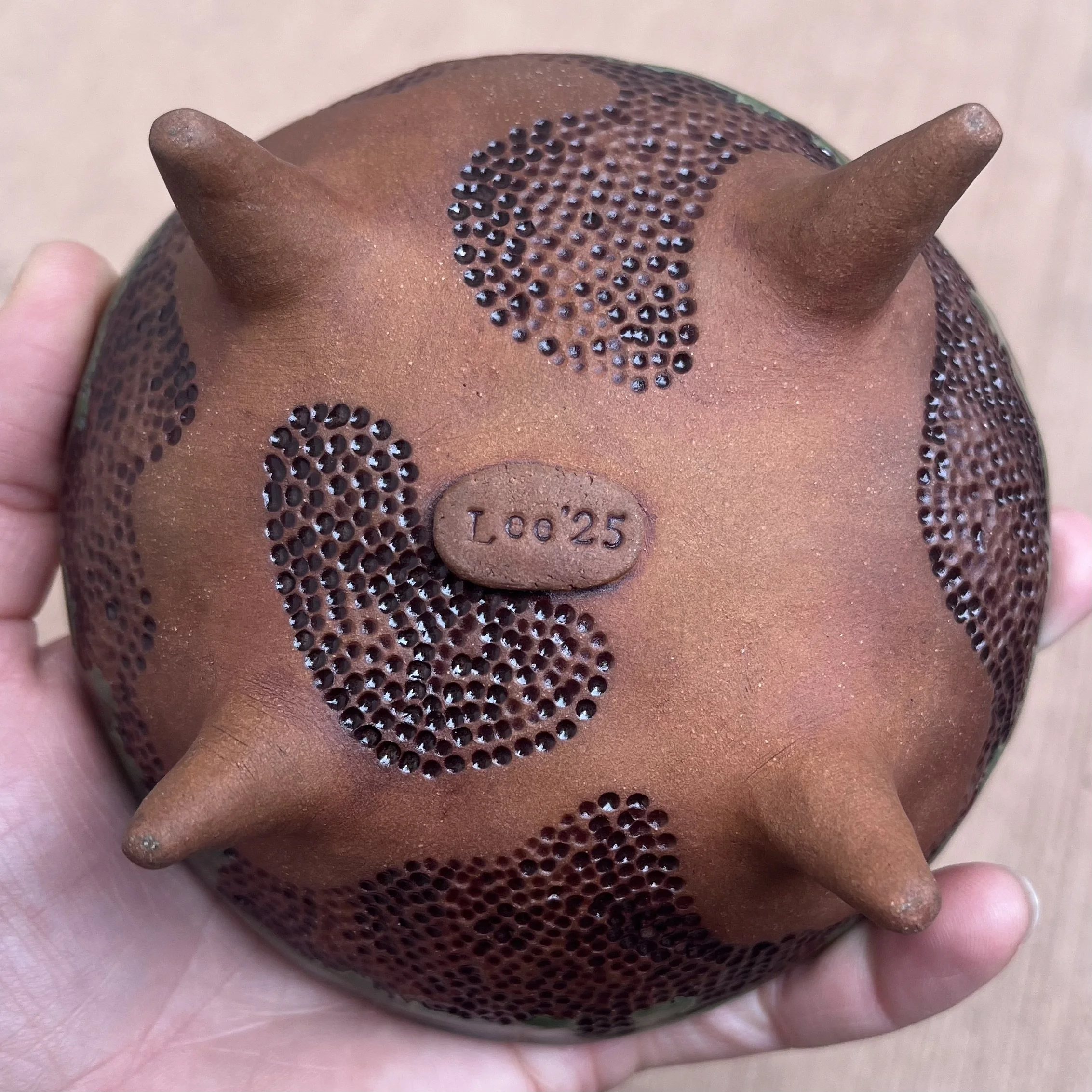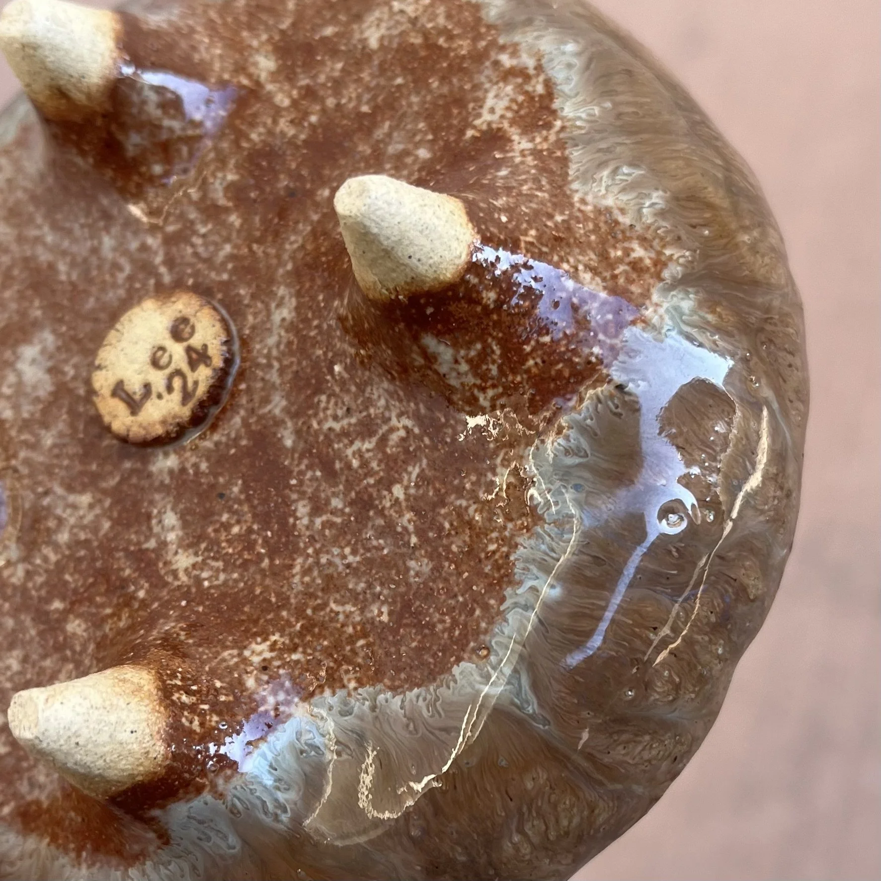 Using a hand pinch technique to create an imperfect aesthetic, this dish sits atop 4 pointed legs to elevate the piece. Red clay is fired with a semi-gloss speckled blue on white glaze. Dimples are added to the underside of the dish that form a clear design. The glaze settles into the dimples to further accentuate the design.