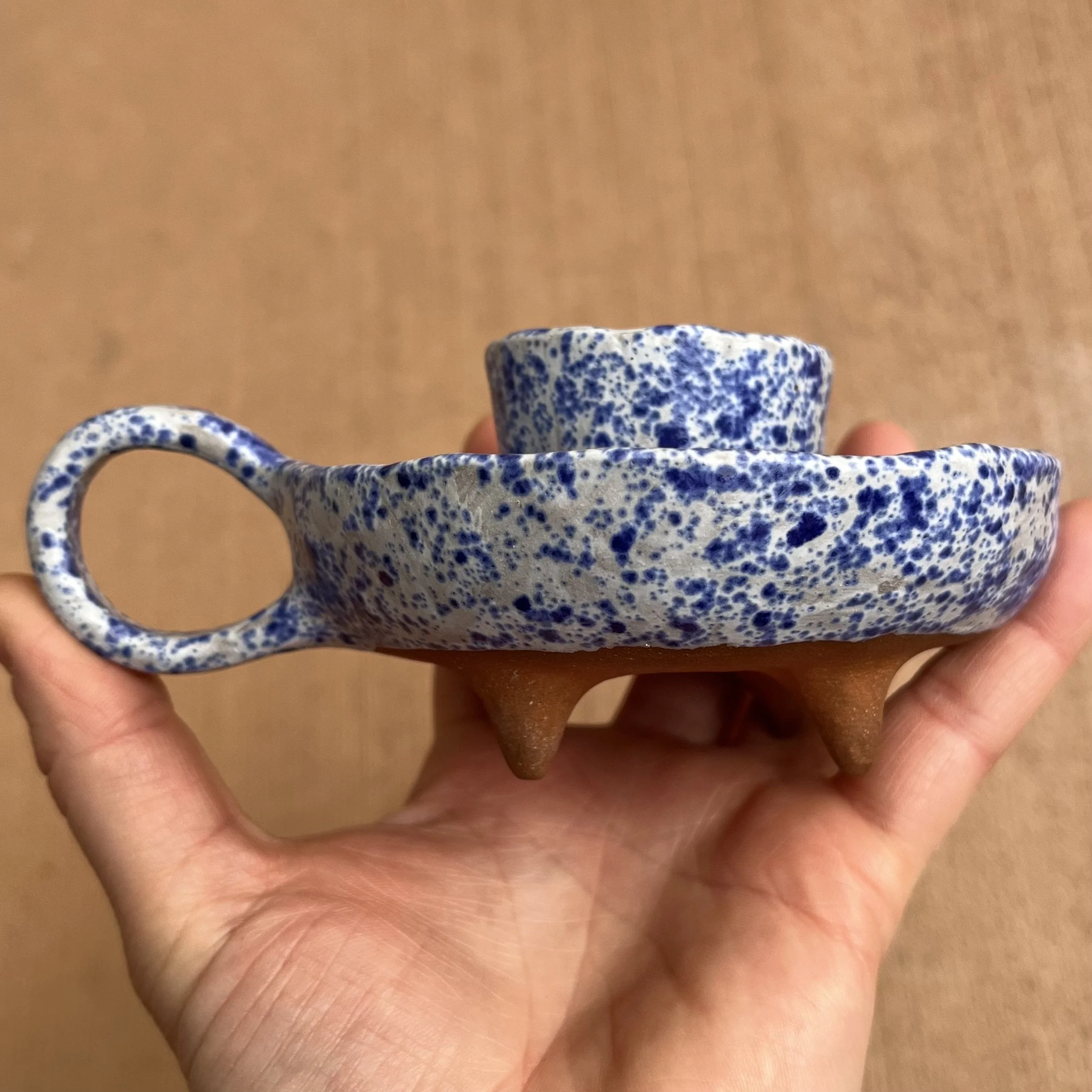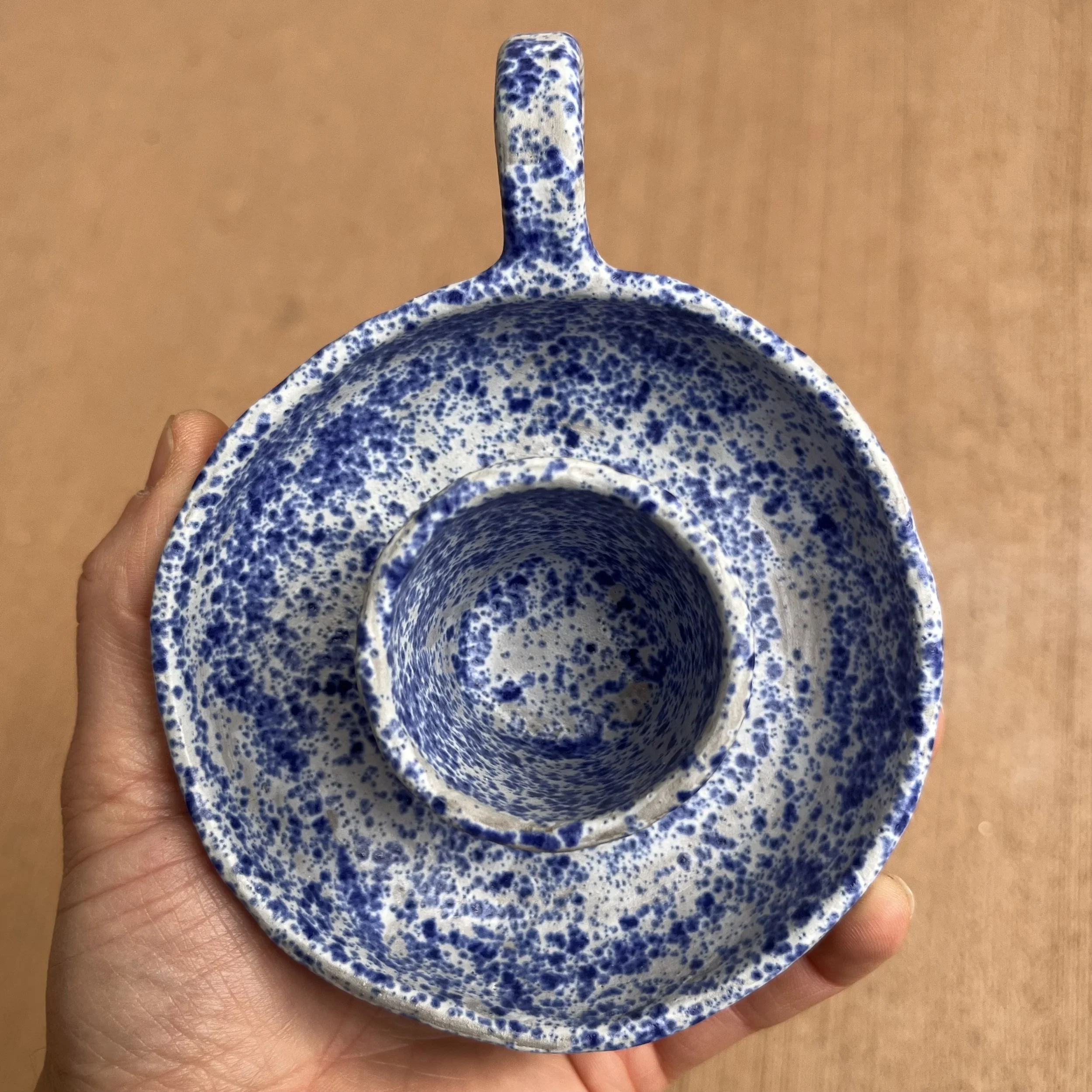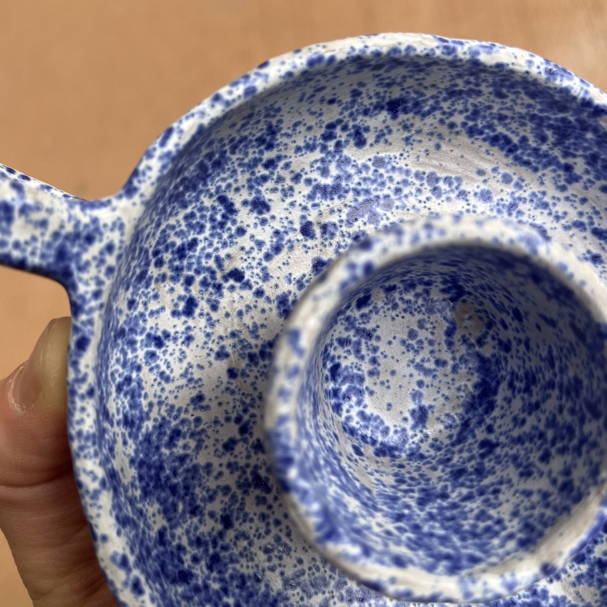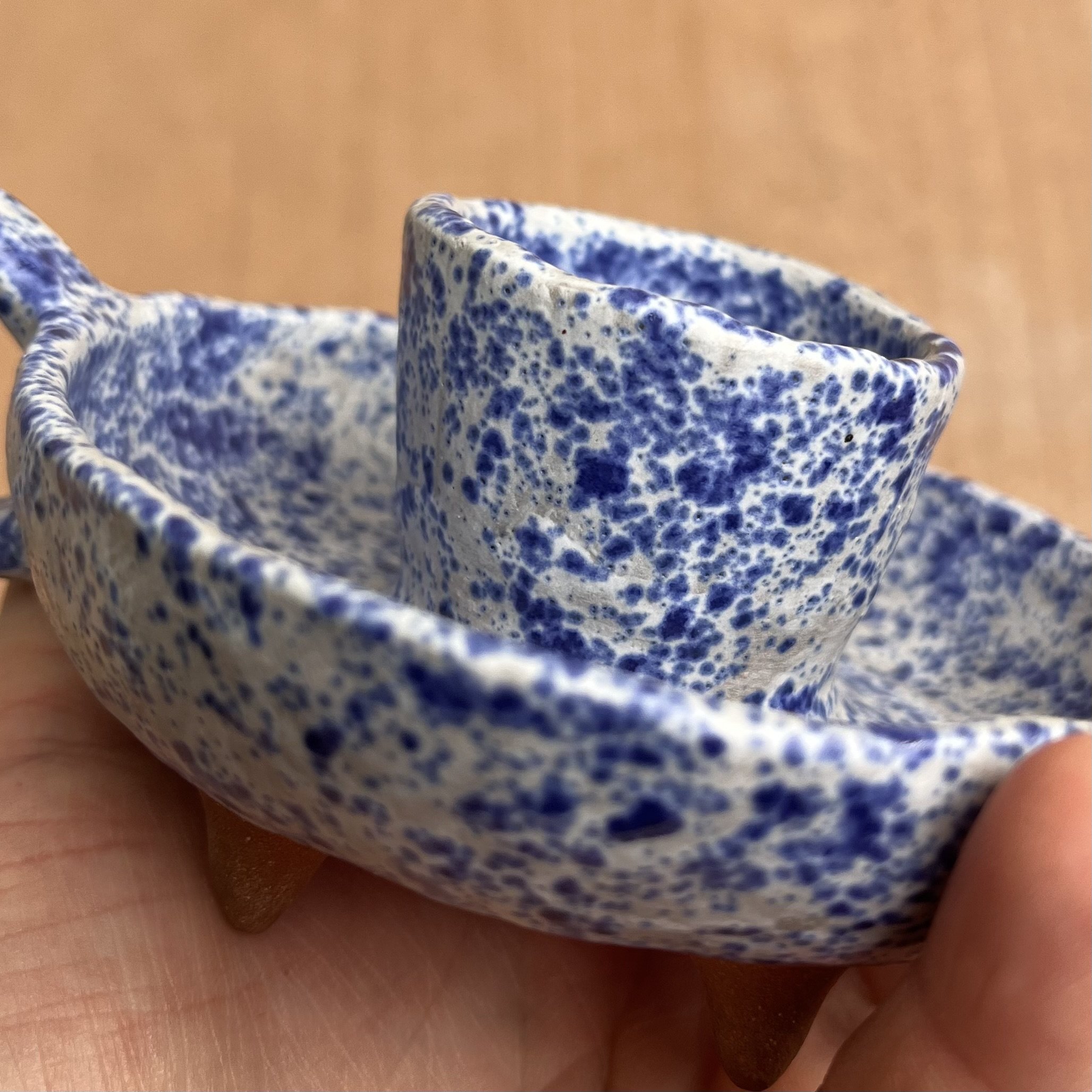 Made up of a larger shallow bowl and a cylinder in the center to hold any form of larger incense including sage, Palo Santo, and lavender in position as they burn. The piece is raised on 4 small legs to give a clean and clear placement on any surface and a small handle on one side to hold for additional handling support. The larger shallow bowl will collect ash from the incense as it breaks down. This piece has been glazed with a speckled orange base and added droplets of blue crystalline around the edges that create a beautiful soft blend of bubbly orange, white and blue hues where they combine. The glaze also reacts to form a small crystalline structure where the glaze pools.