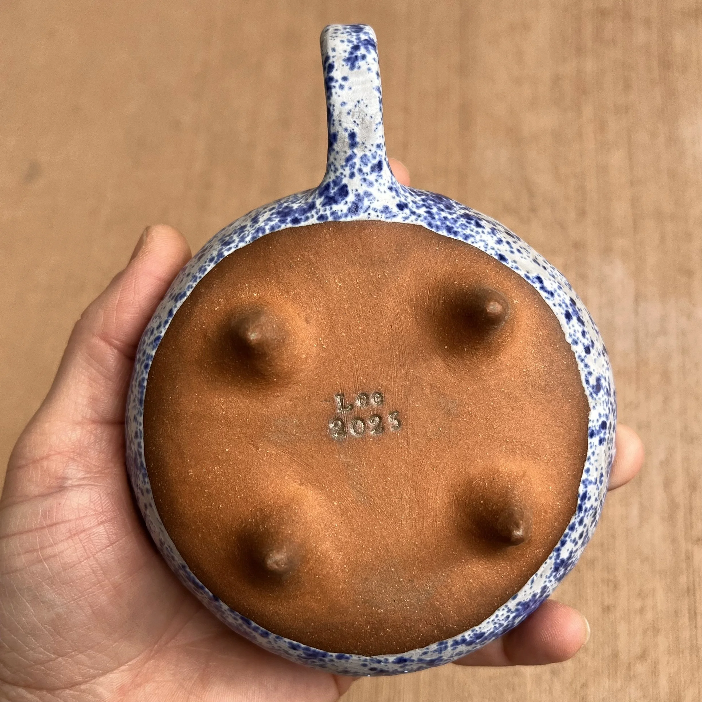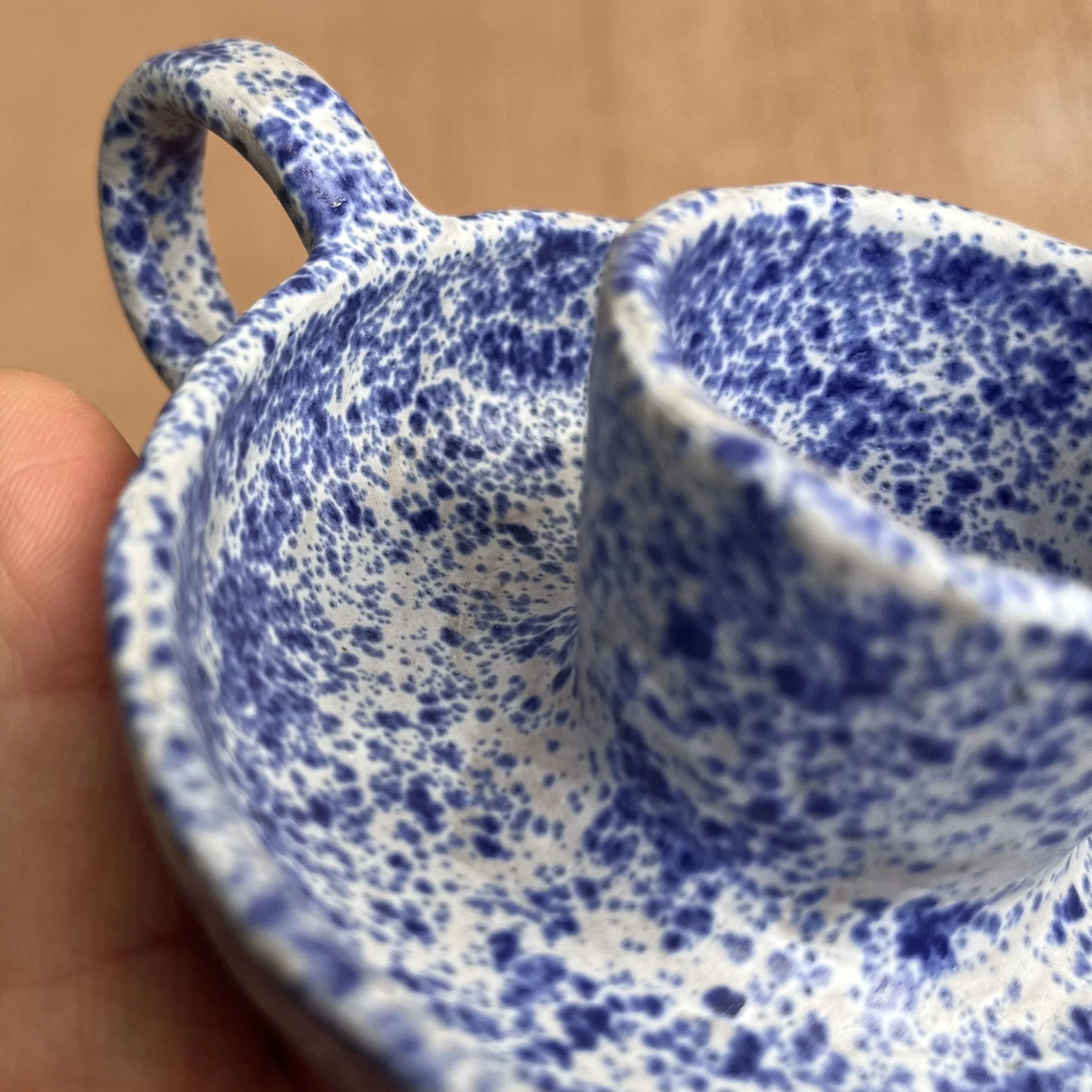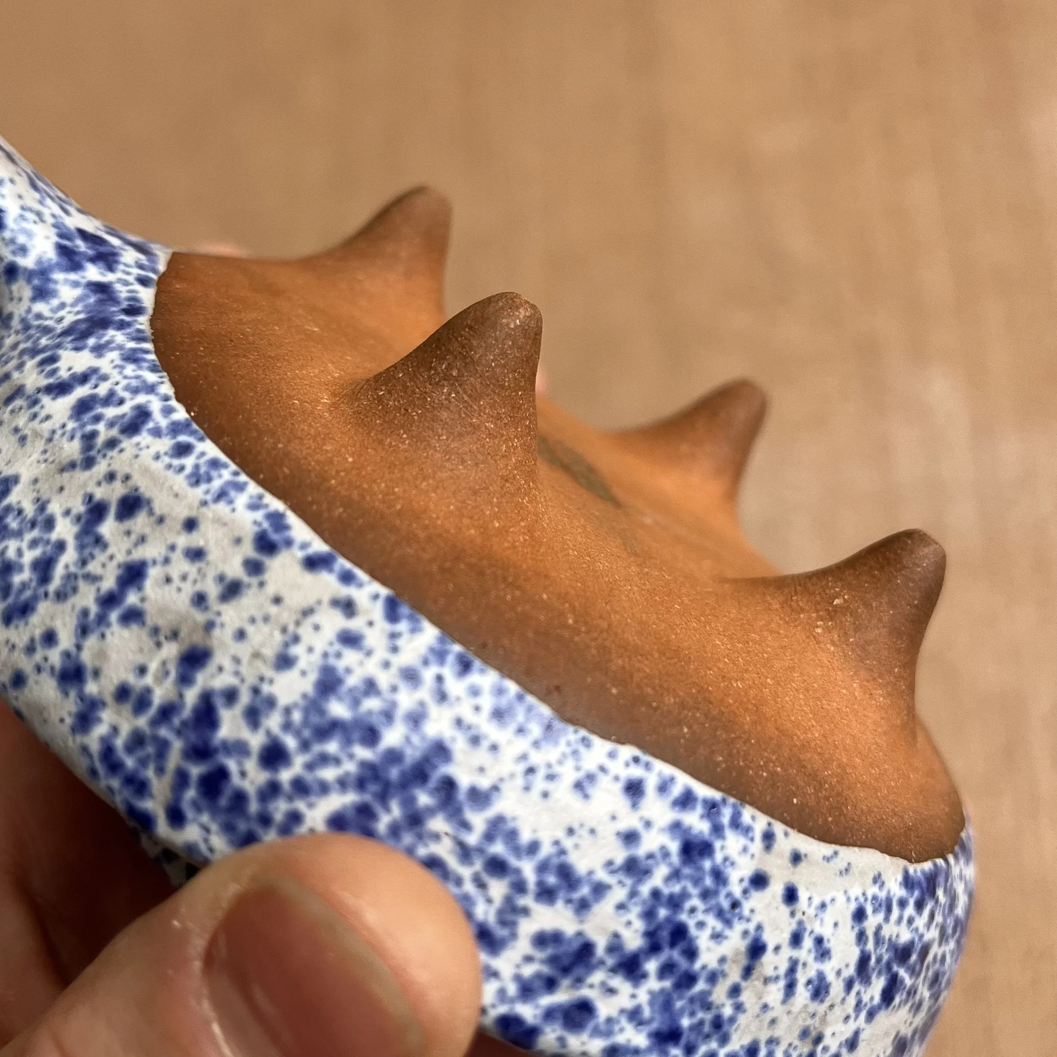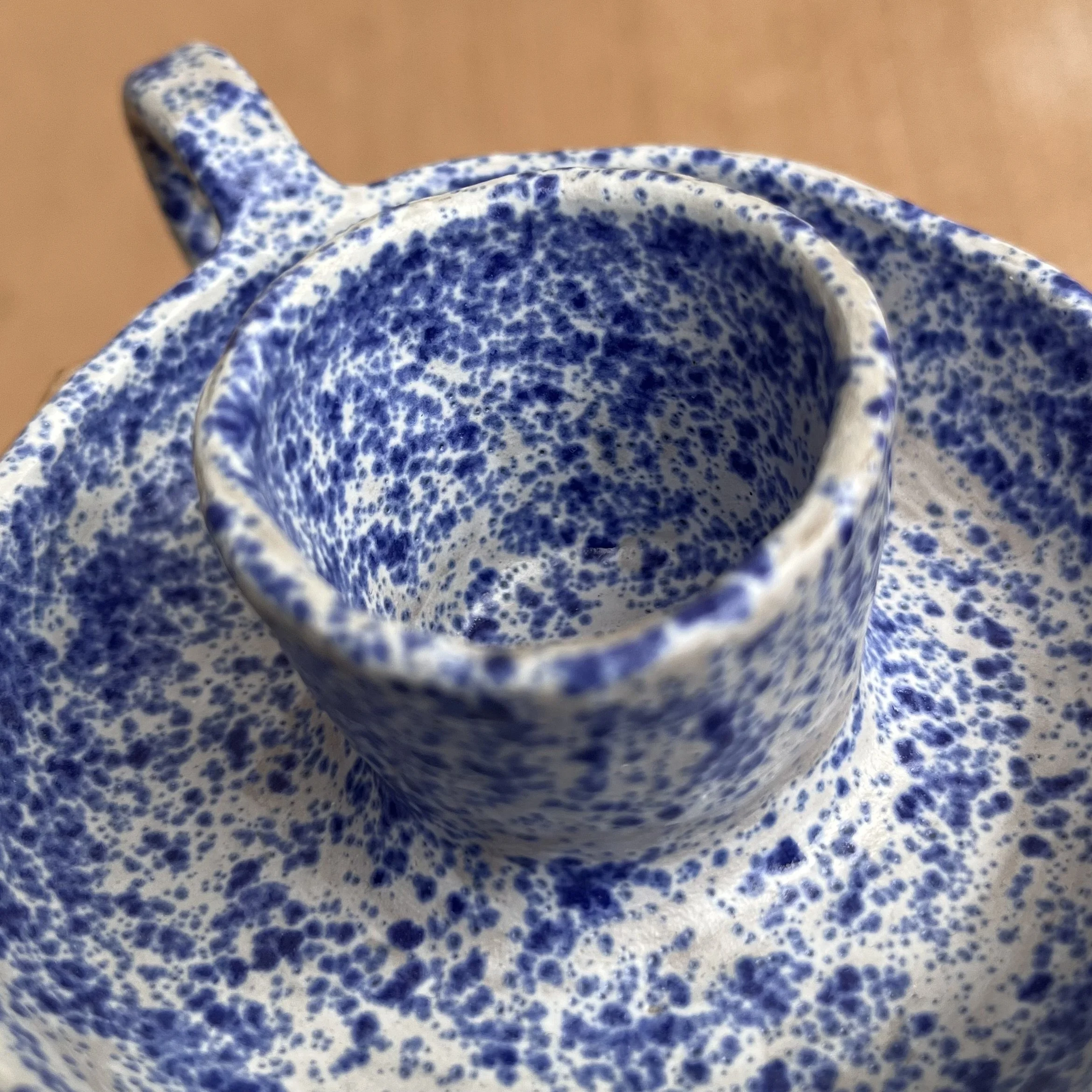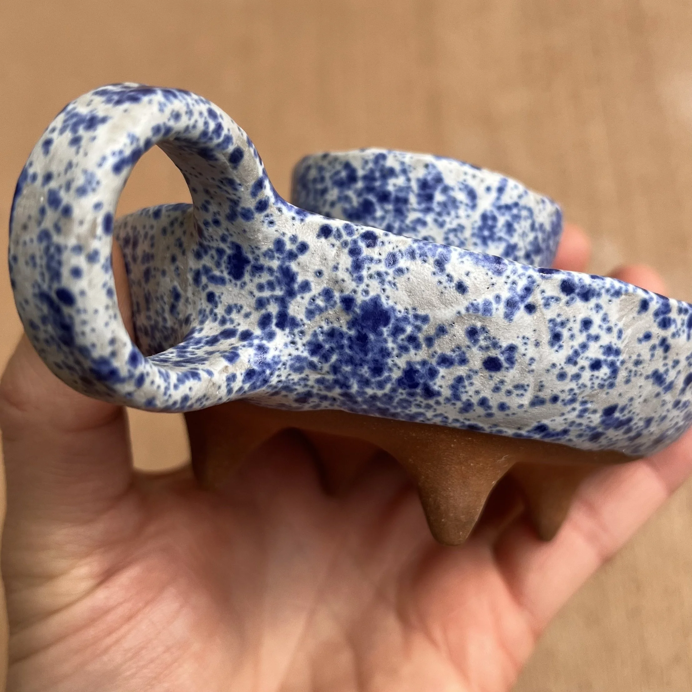 Made up of a larger shallow bowl and a cylinder in the center to hold any form of larger incense including sage, Palo Santo, and lavender in position as they burn. The piece is raised on 4 small legs to give a clean and clear placement on any surface and a small handle on one side to hold for additional handling support. The larger shallow bowl will collect ash from the incense as it breaks down. This piece has been glazed with a speckled orange base and added droplets of blue crystalline around the edges that create a beautiful soft blend of bubbly orange, white and blue hues where they combine. The glaze also reacts to form a small crystalline structure where the glaze pools.