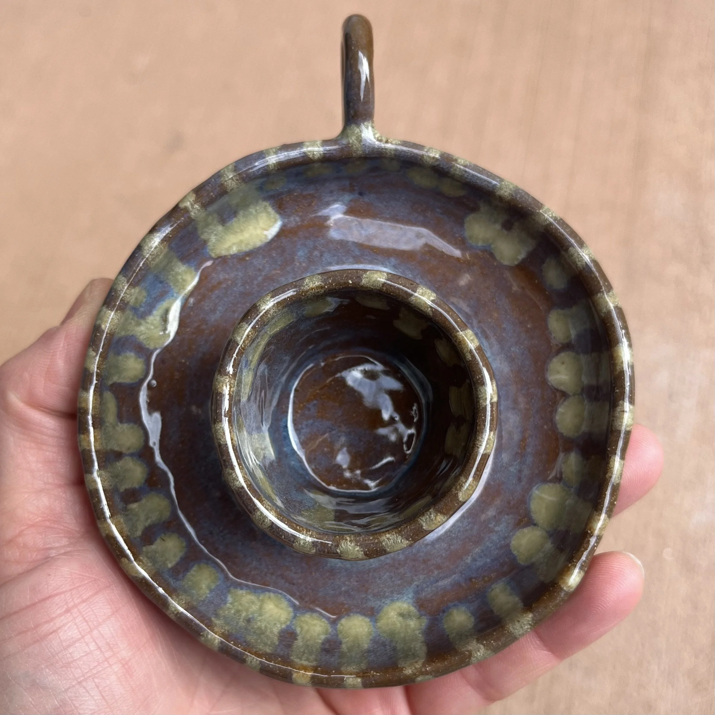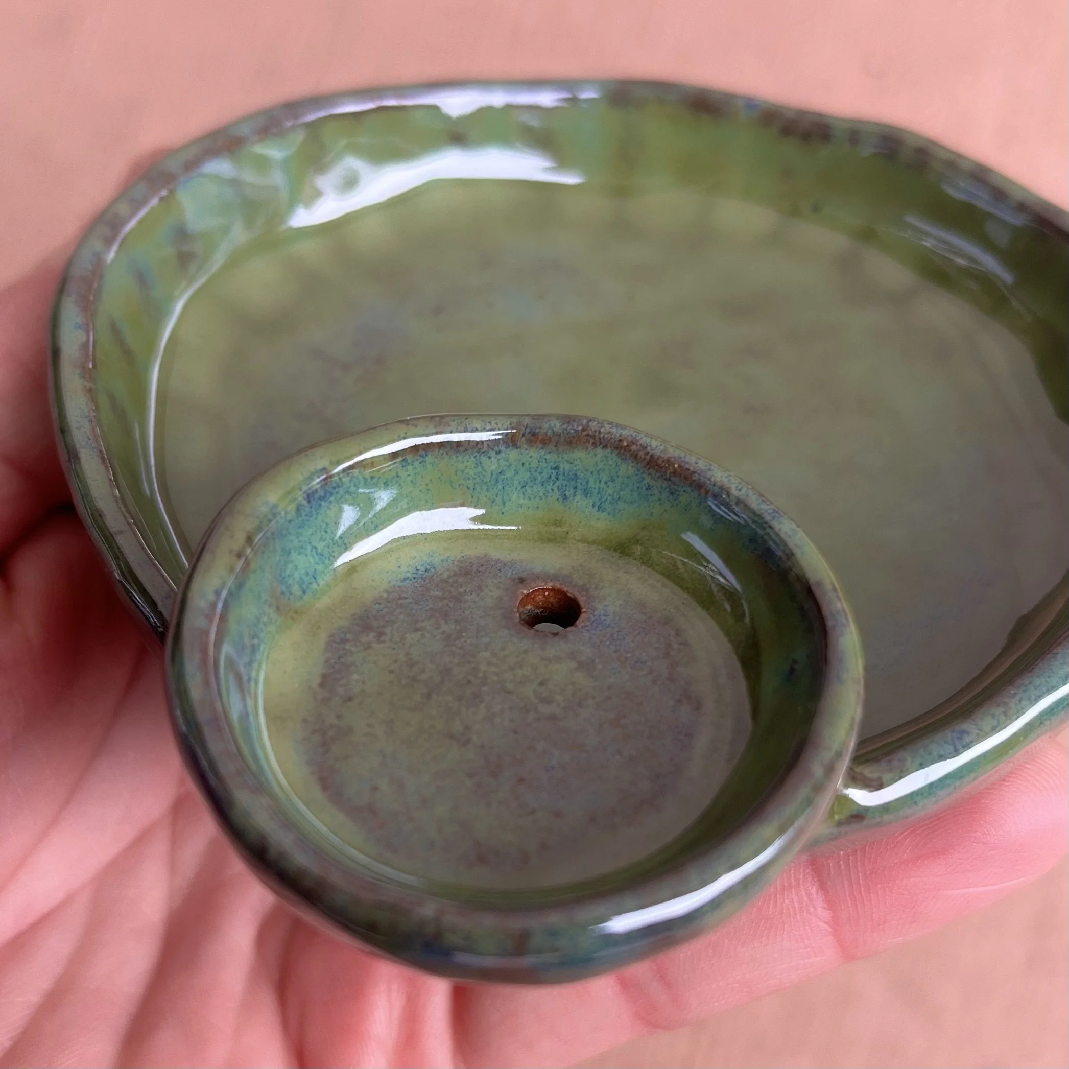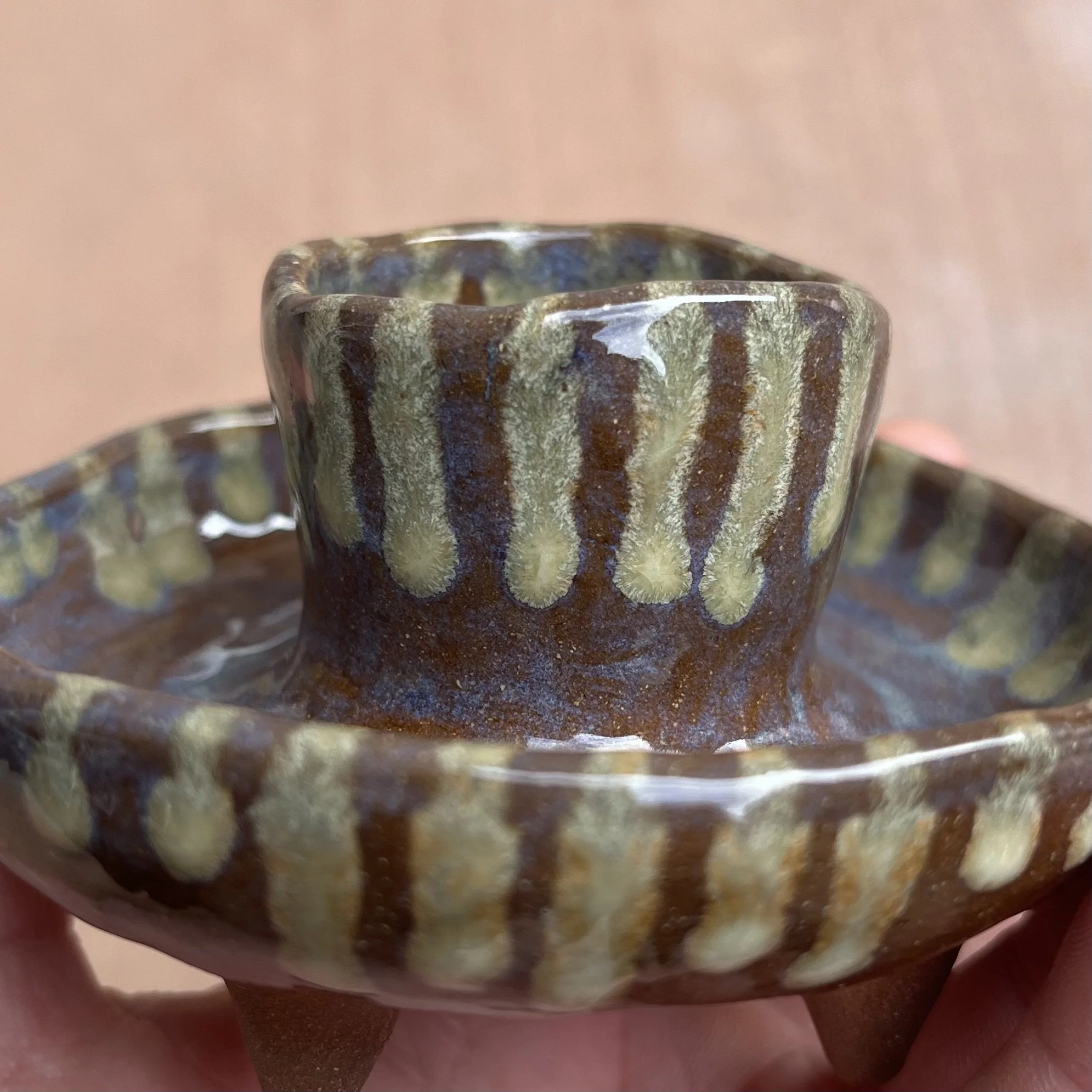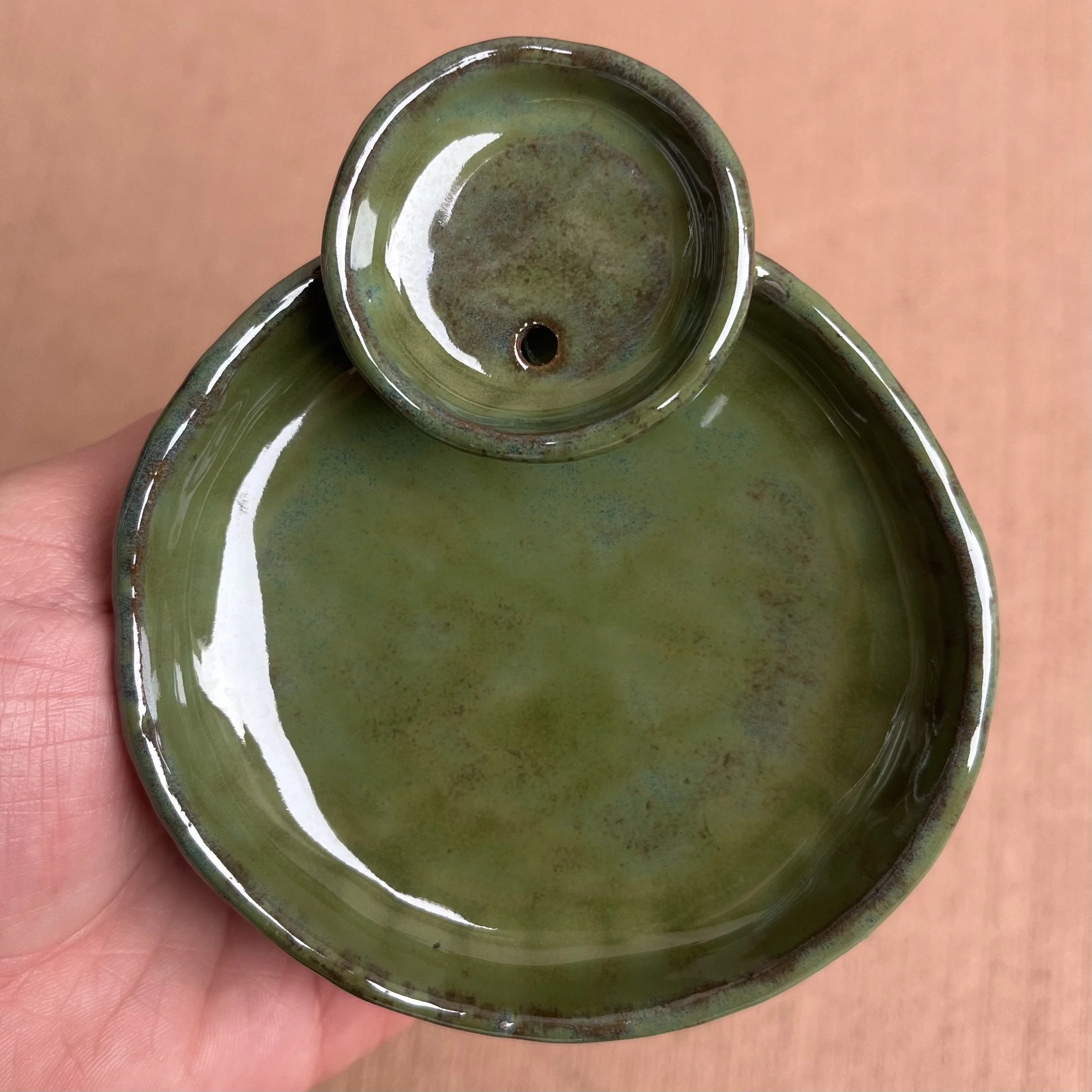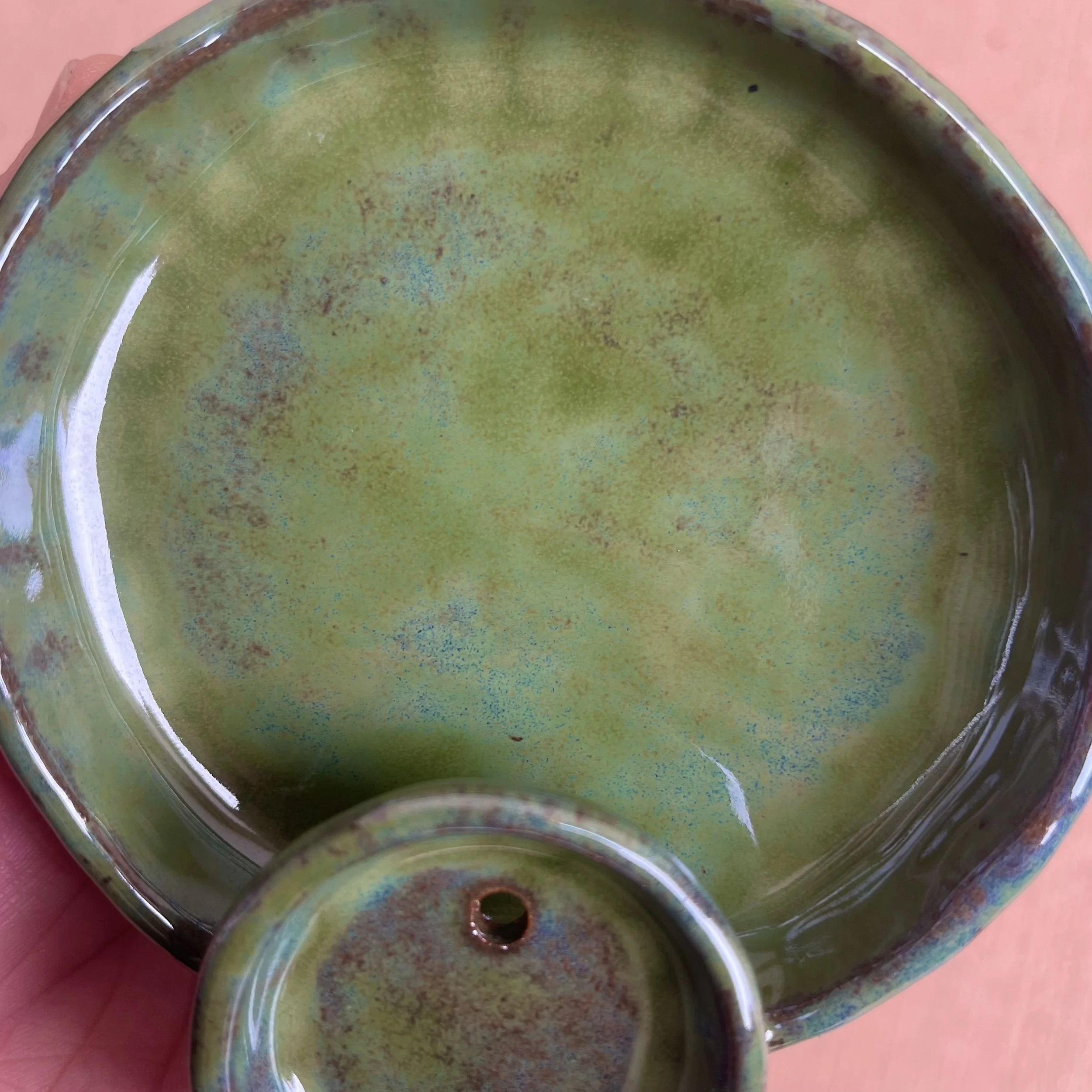 A small raised piece has been punched with a hole to support a stick incense and is attached to an elongated half cylinder that will collect dropping ash. The piece is raised on 4 small legs to give a clean and clear placement on any surface. This piece has been glazed with a subtle blue speckled glossy base and added droplets of speckled orange around the edges that create a beautiful mixture of pale yellow hues where they combine.