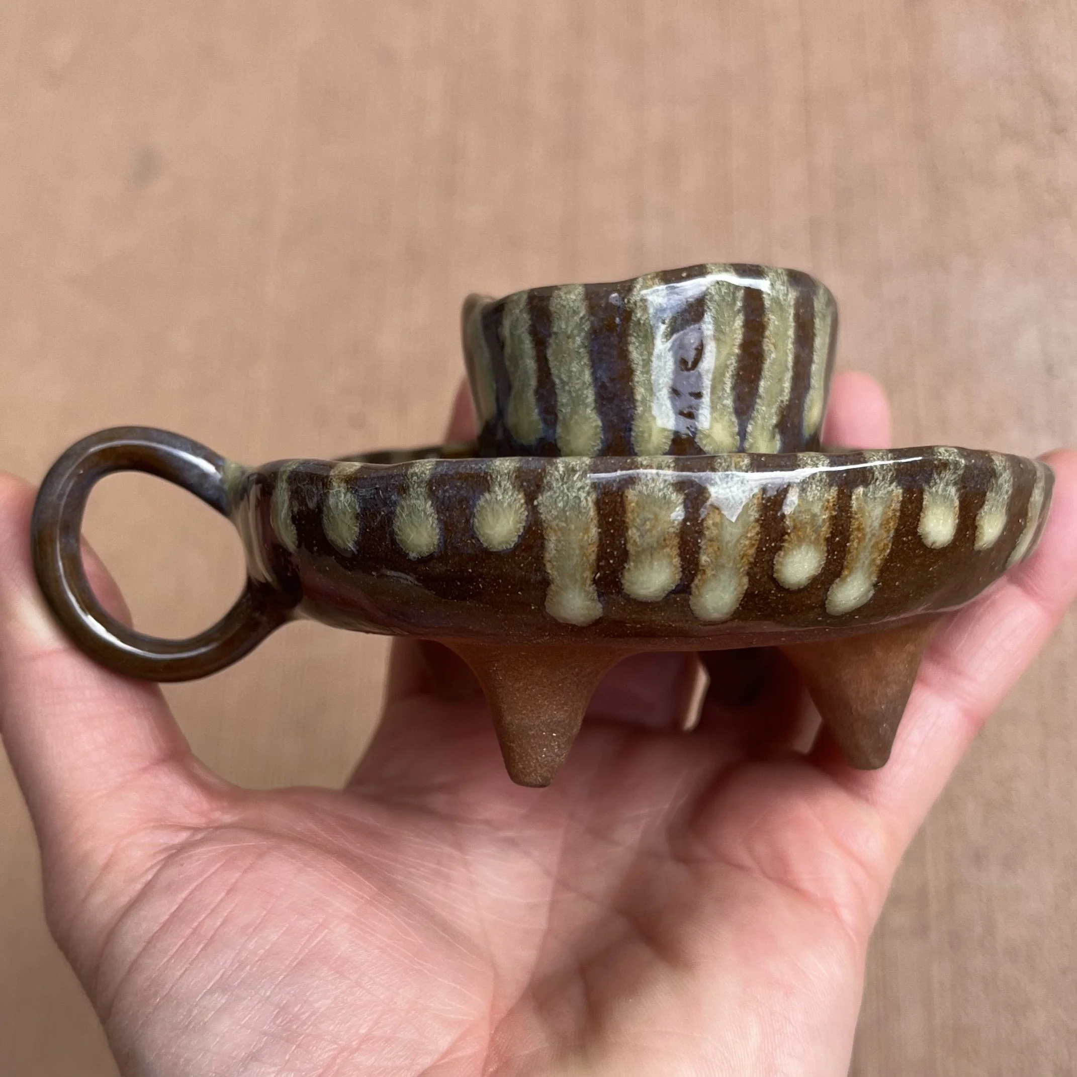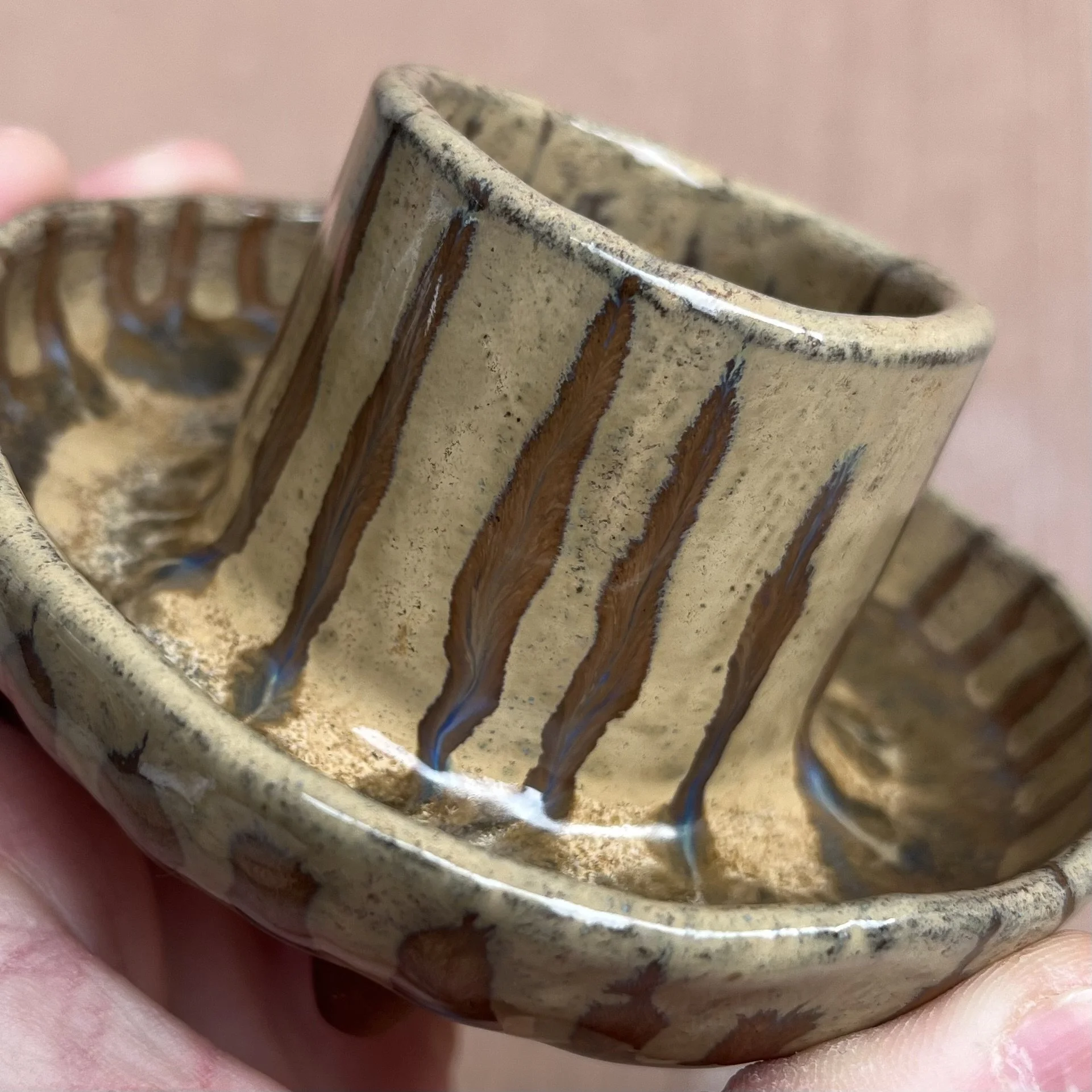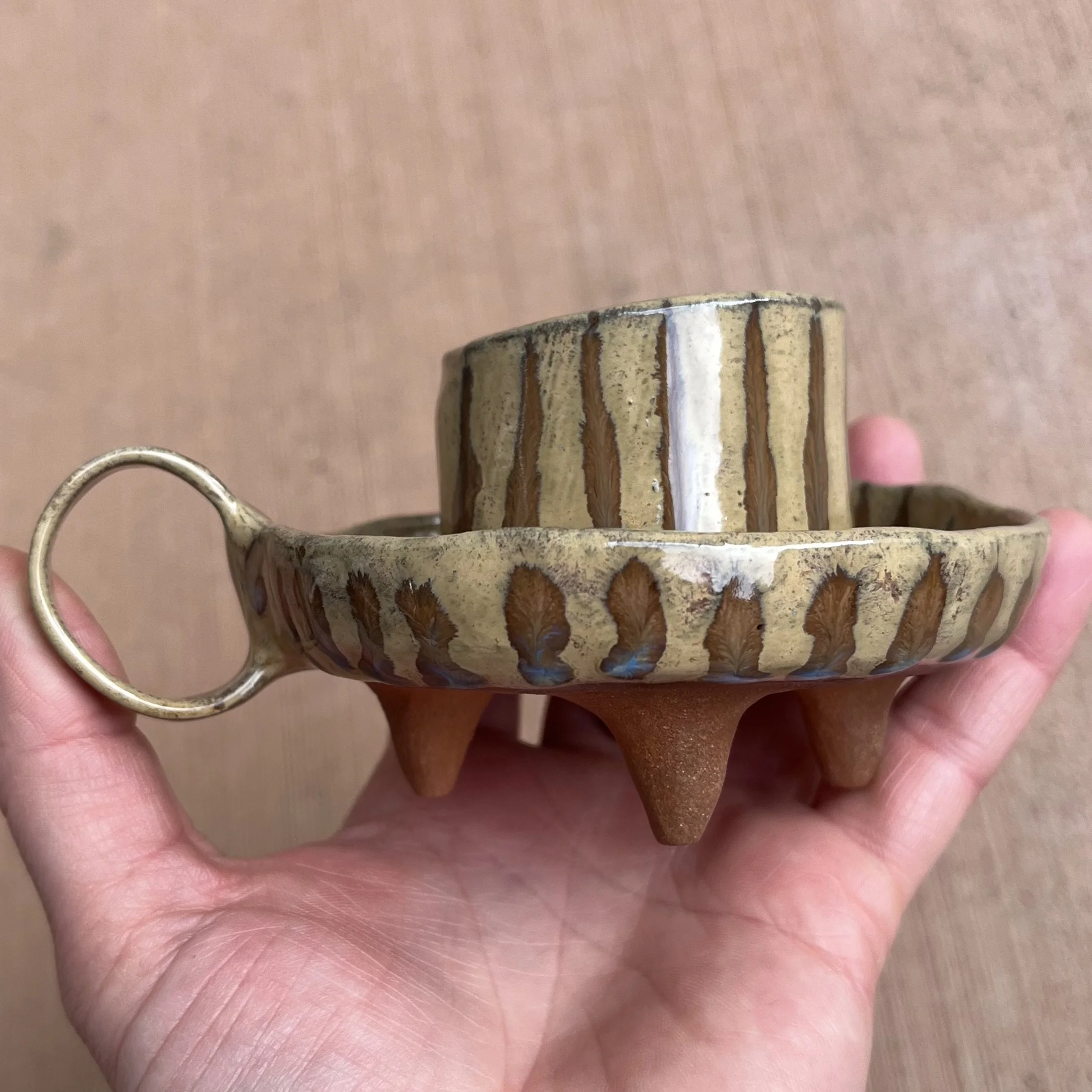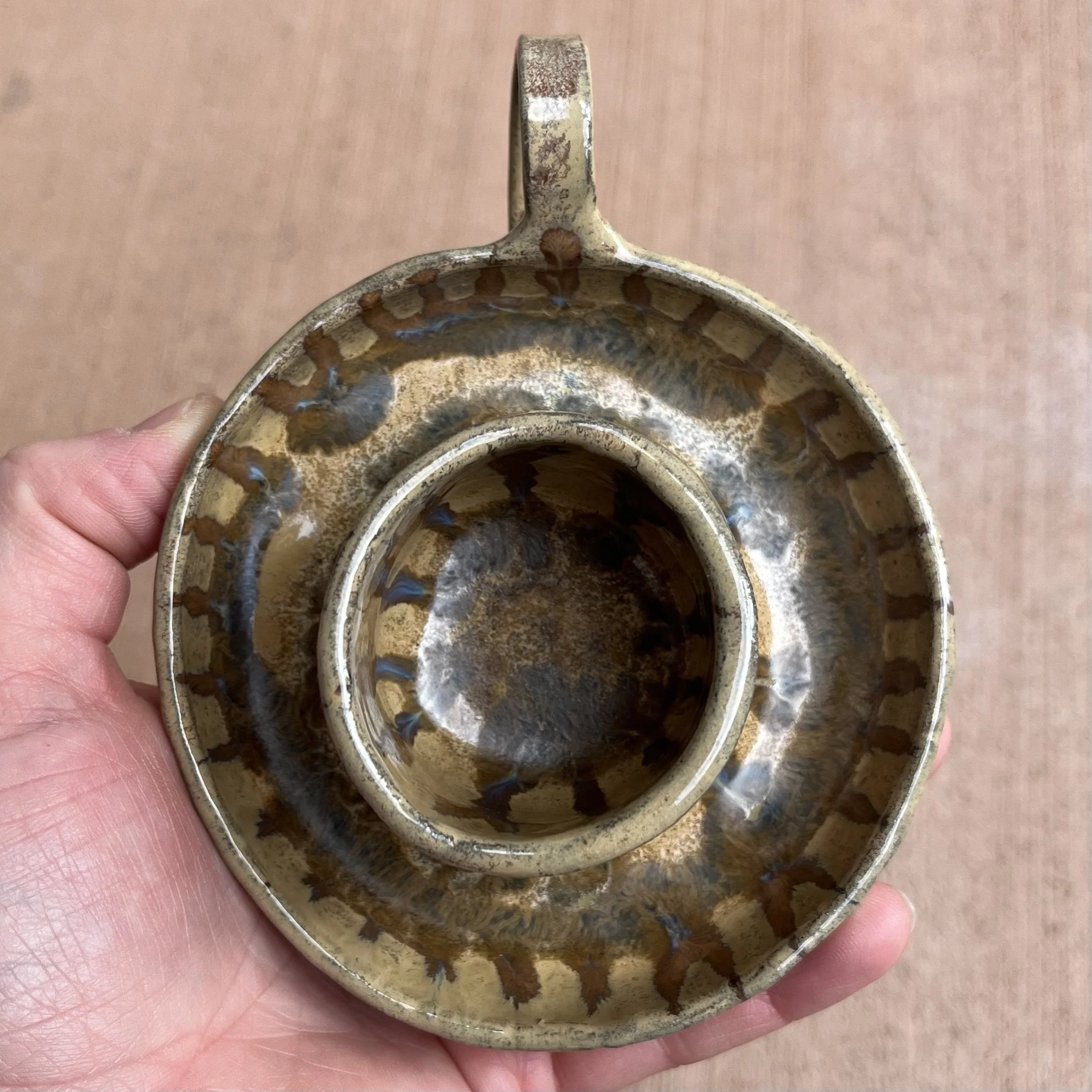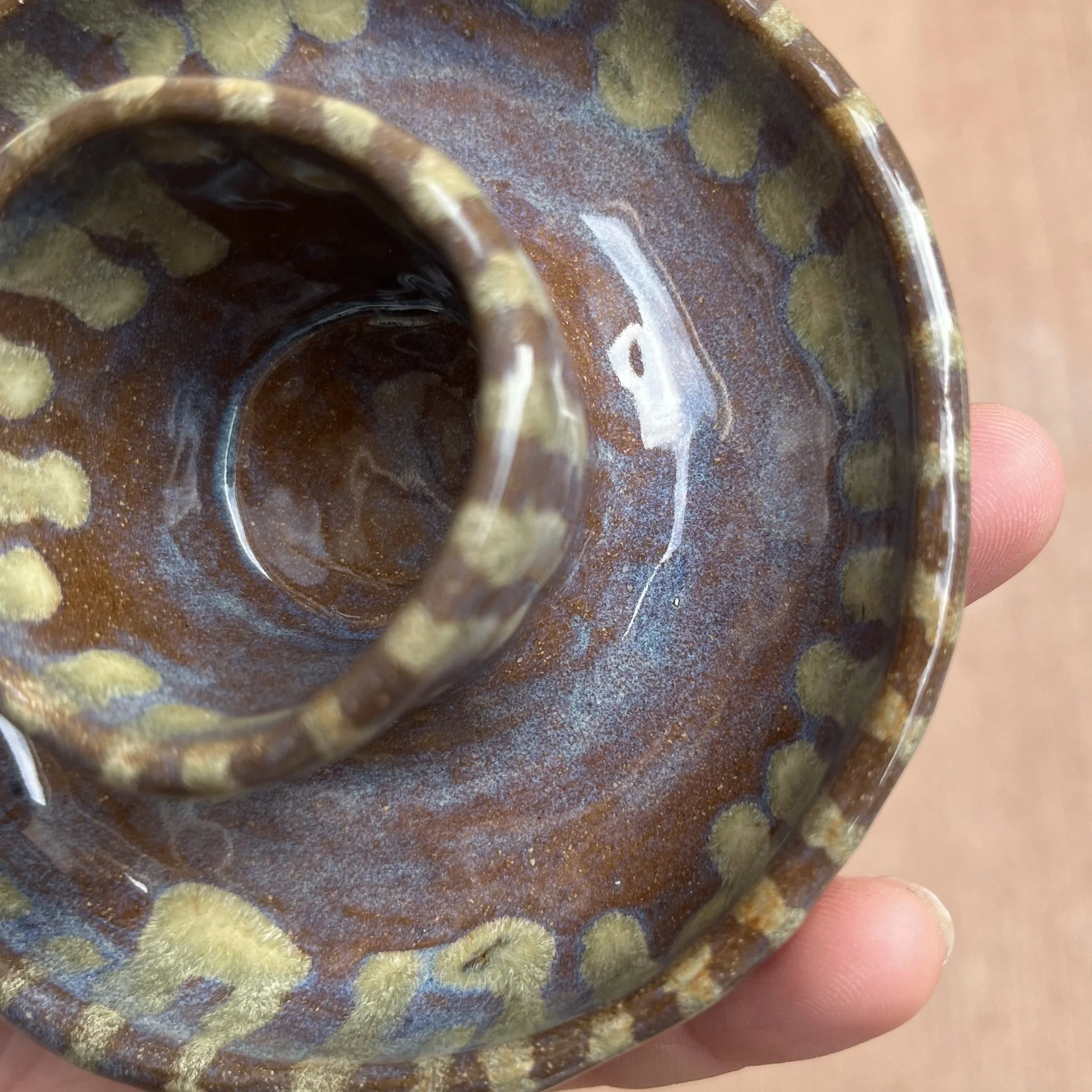 A small raised piece has been punched with a hole to support a stick incense and is attached to an elongated half cylinder that will collect dropping ash. The piece is raised on 4 small legs to give a clean and clear placement on any surface. This piece has been glazed with a subtle blue speckled glossy base and added droplets of speckled orange around the edges that create a beautiful mixture of pale yellow hues where they combine.