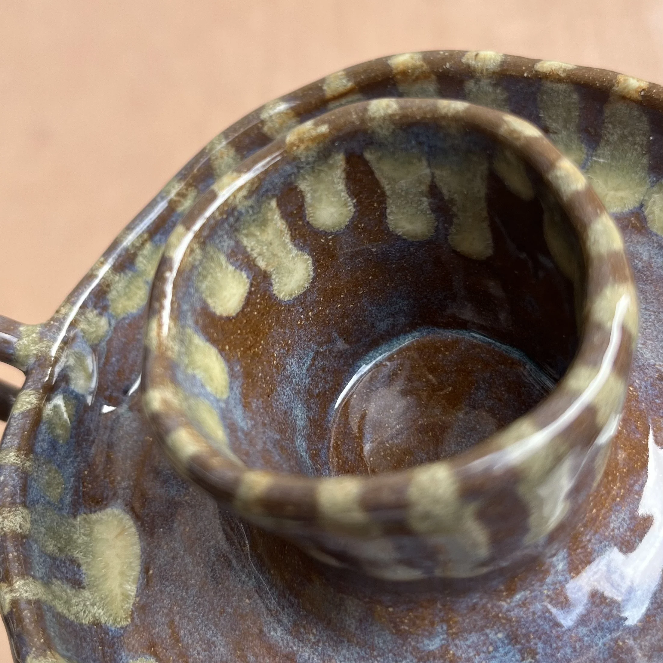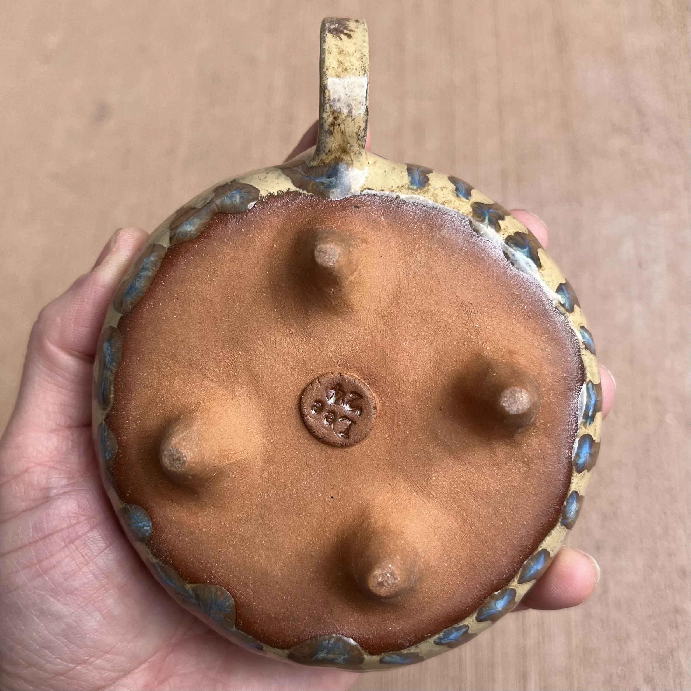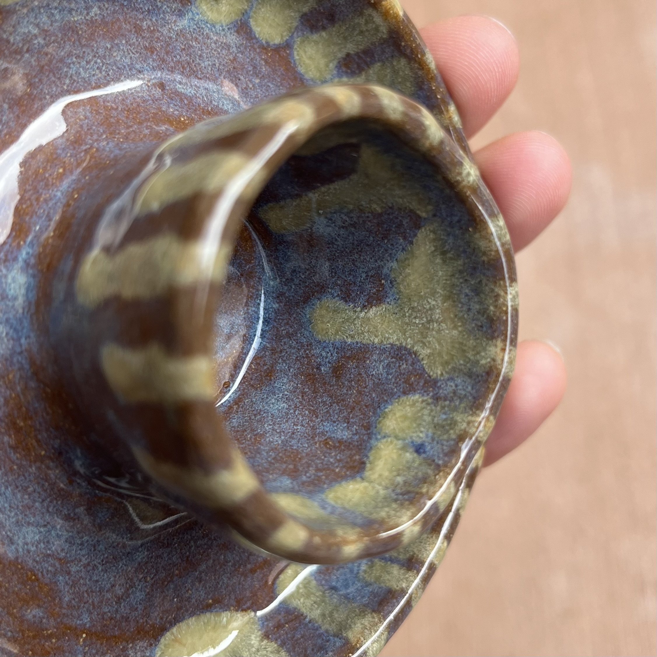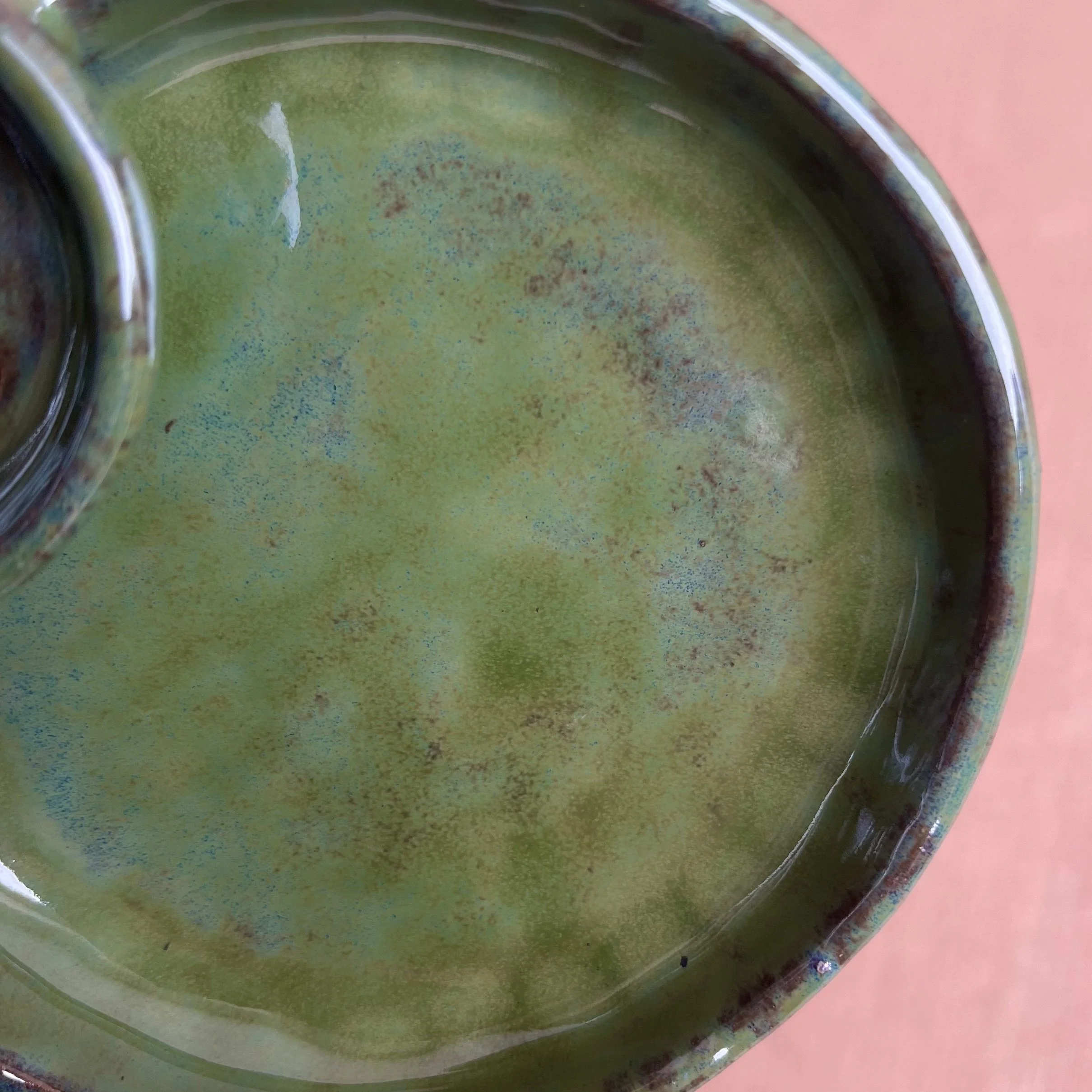 A small raised piece has been punched with a hole to support a stick incense and is attached to an elongated half cylinder that will collect dropping ash. The piece is raised on 4 small legs to give a clean and clear placement on any surface. This piece has been glazed with a subtle blue speckled glossy base and added droplets of speckled orange around the edges that create a beautiful mixture of pale yellow hues where they combine.