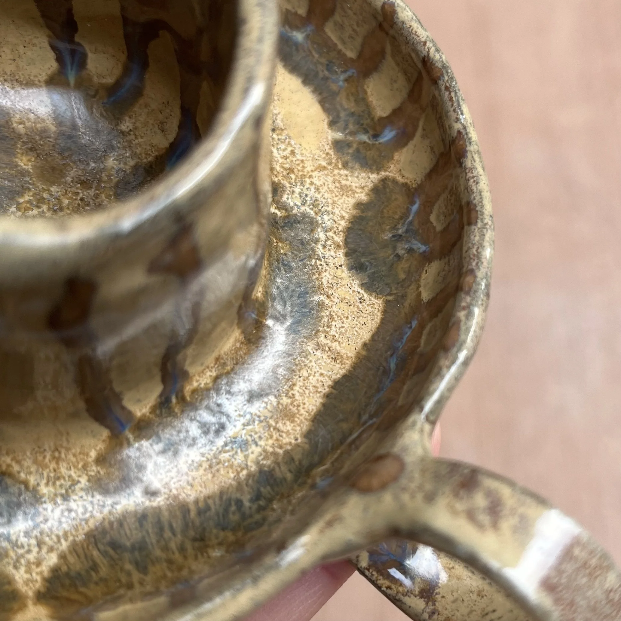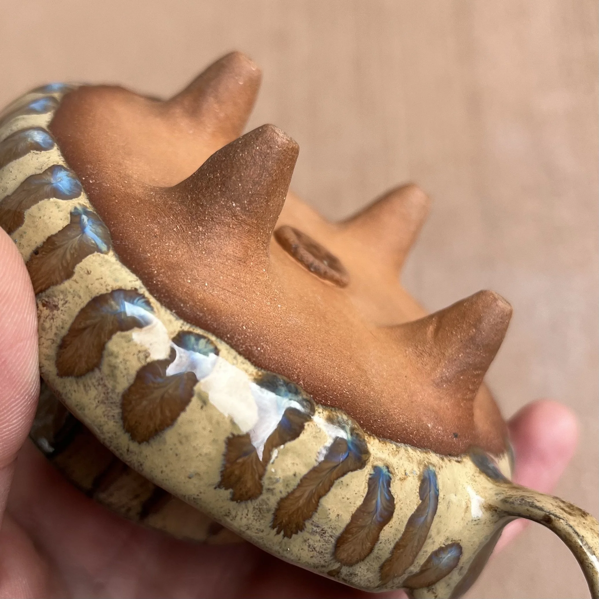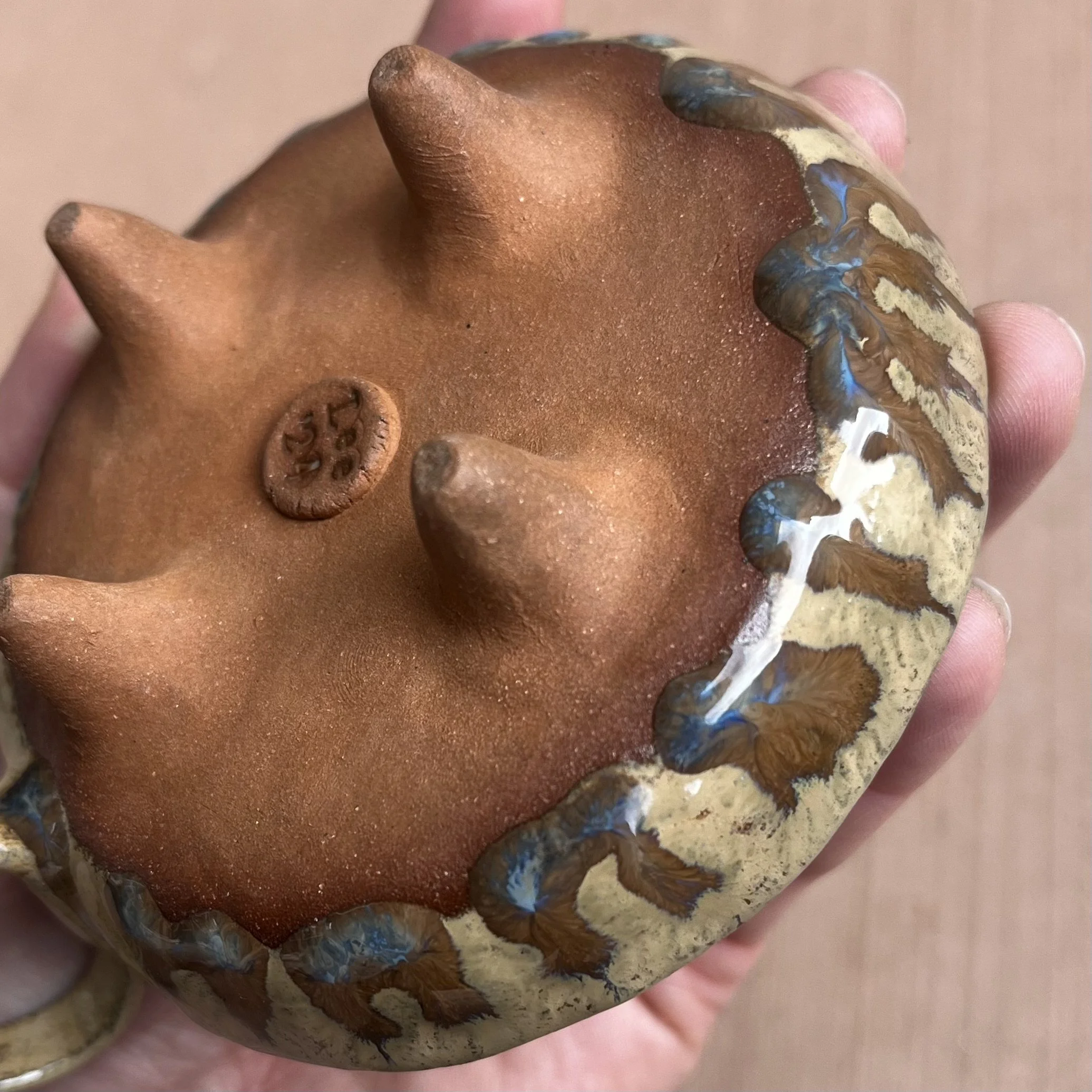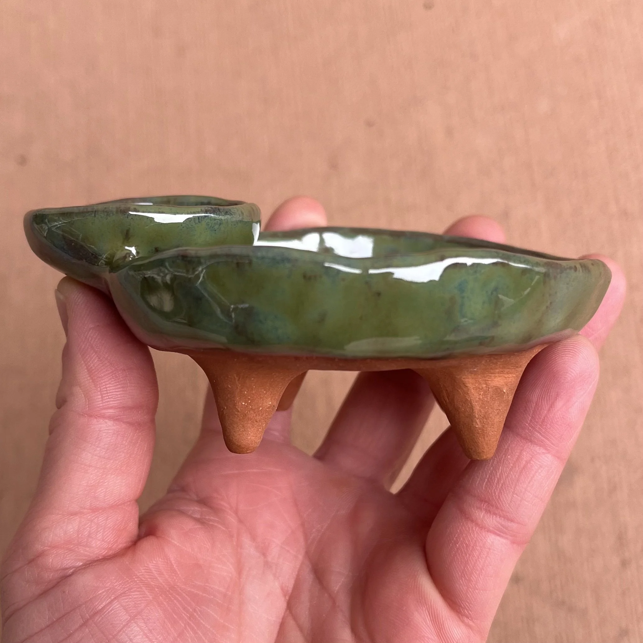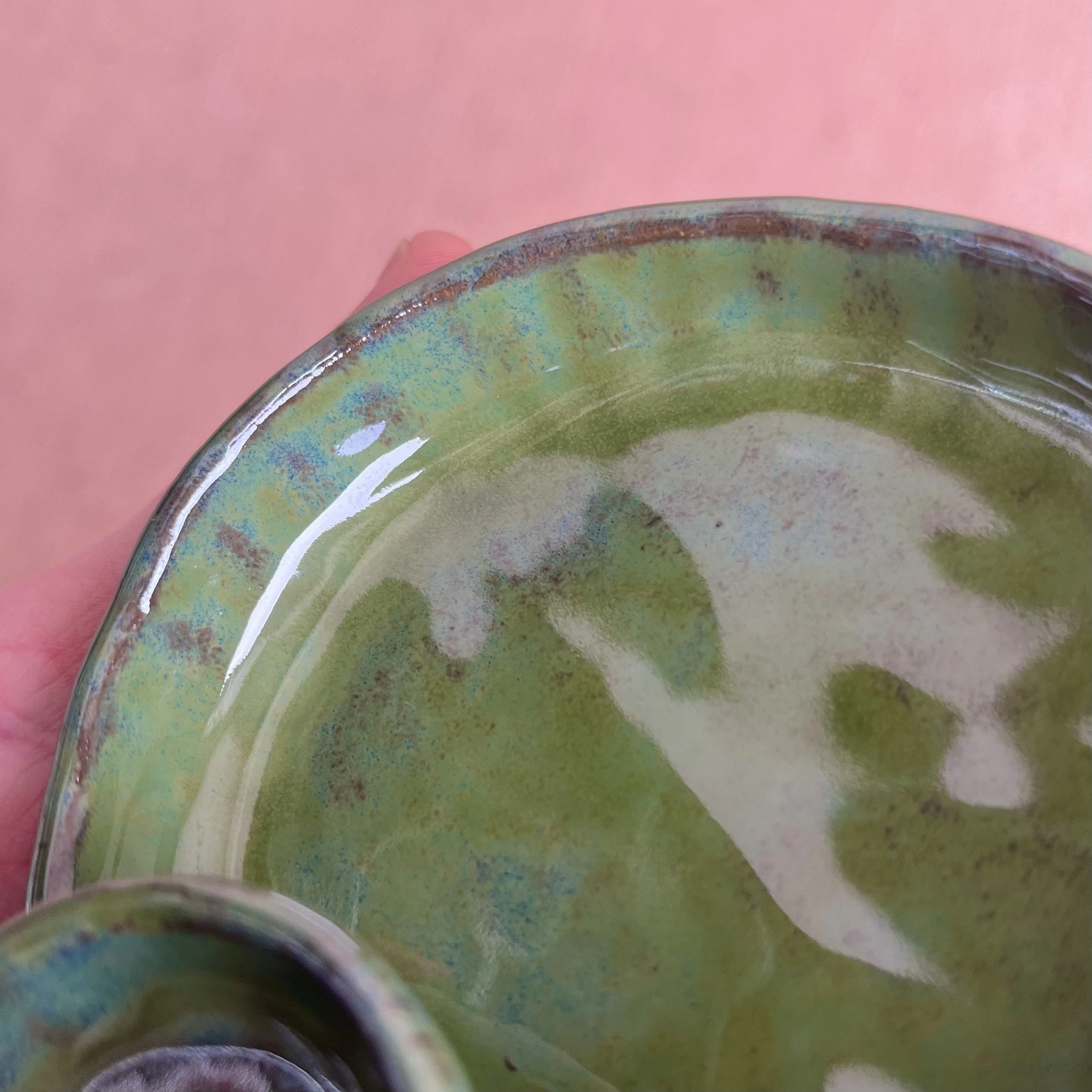 A small raised piece has been punched with a hole to support a stick incense and is attached to an elongated half cylinder that will collect dropping ash. The piece is raised on 4 small legs to give a clean and clear placement on any surface. This piece has been glazed with a subtle blue speckled glossy base and added droplets of speckled orange around the edges that create a beautiful mixture of pale yellow hues where they combine.