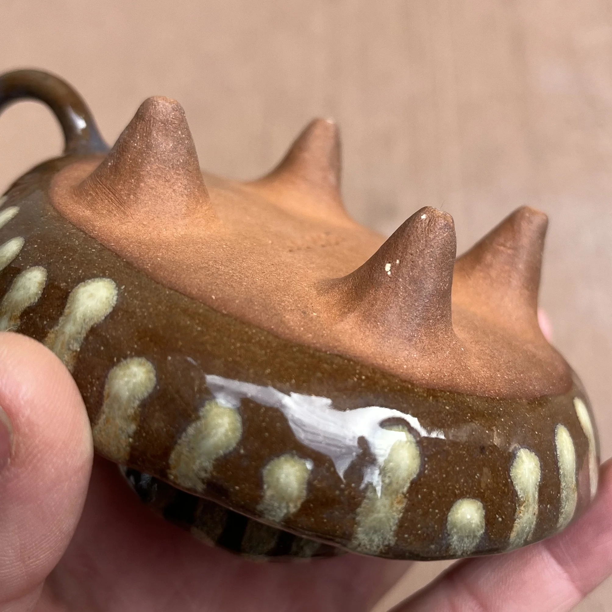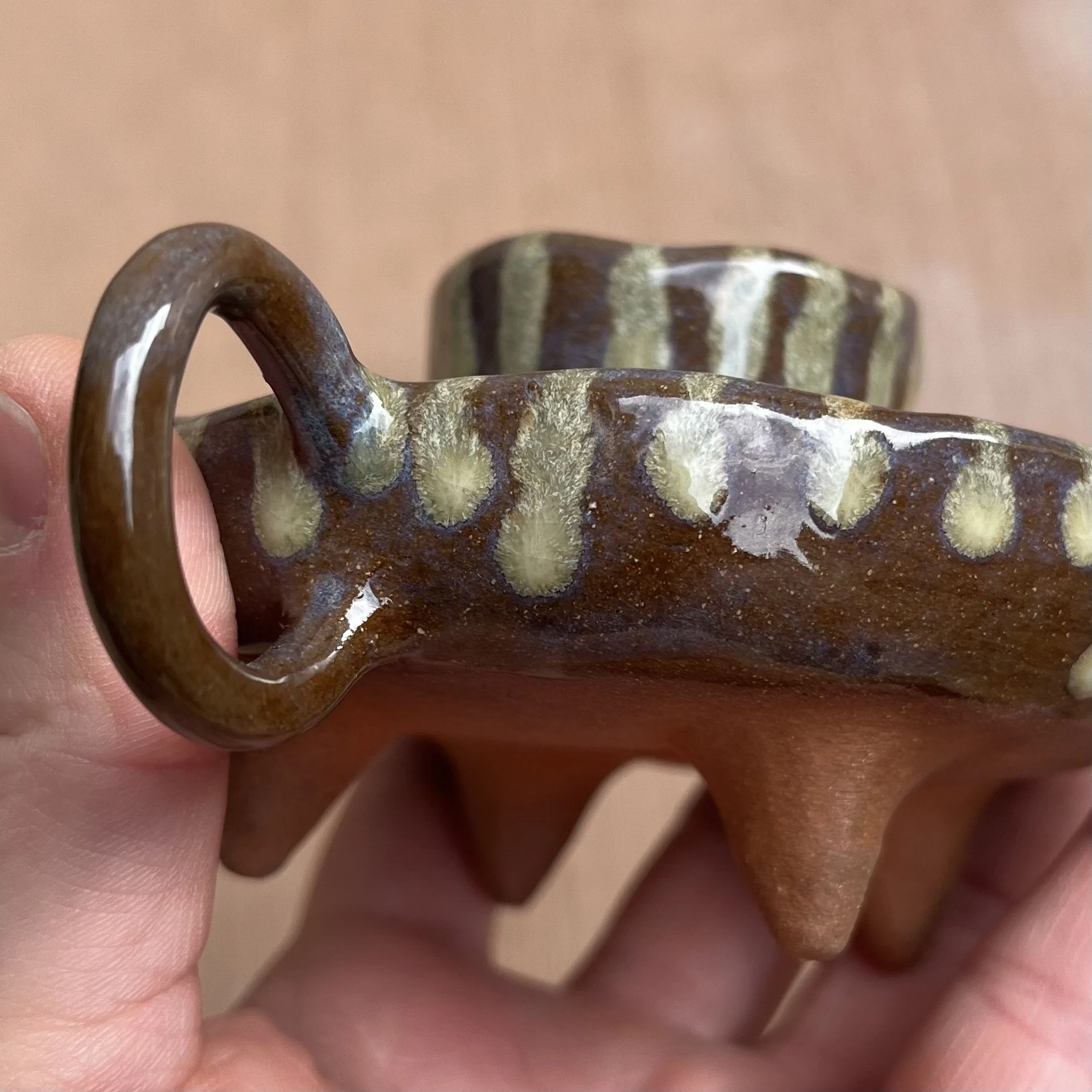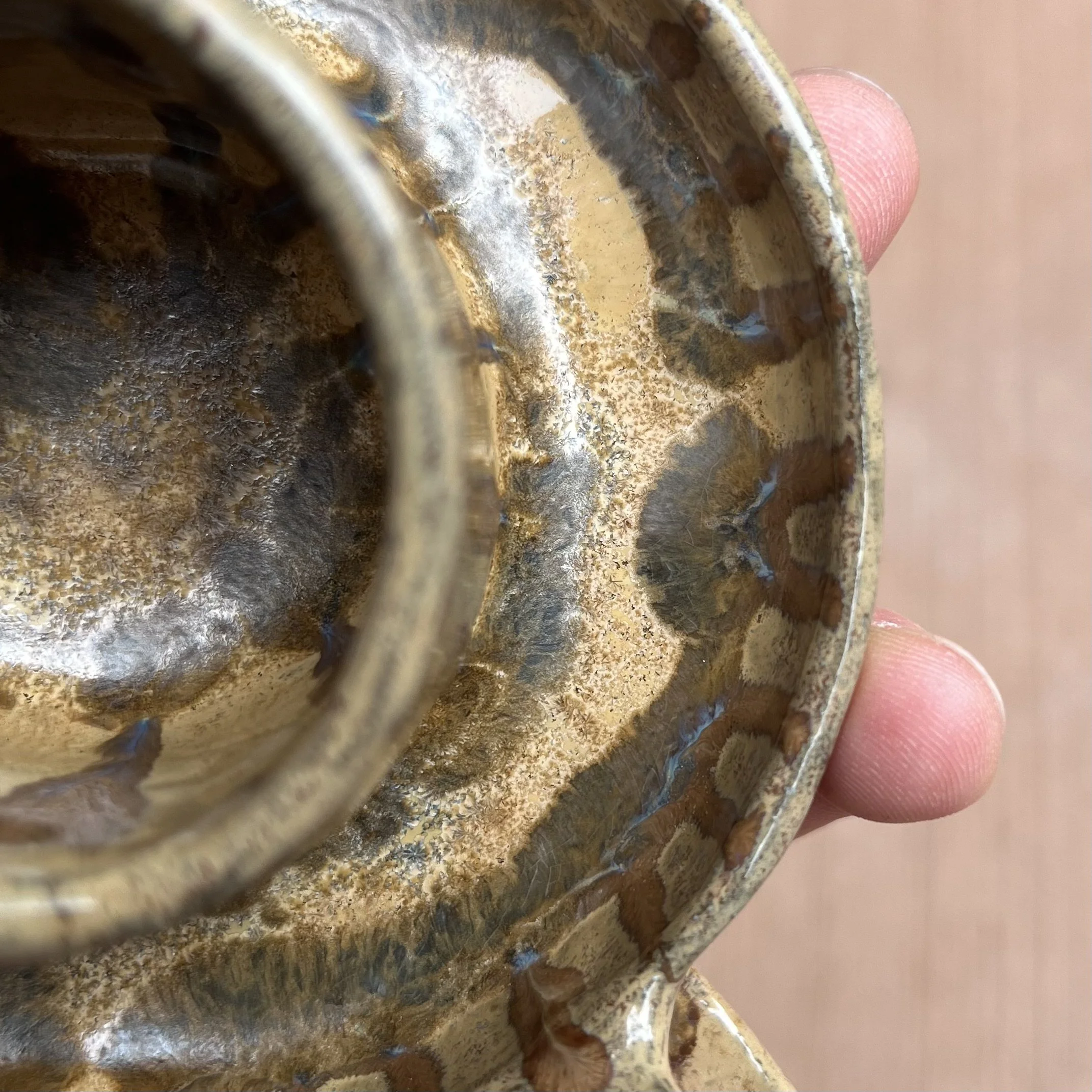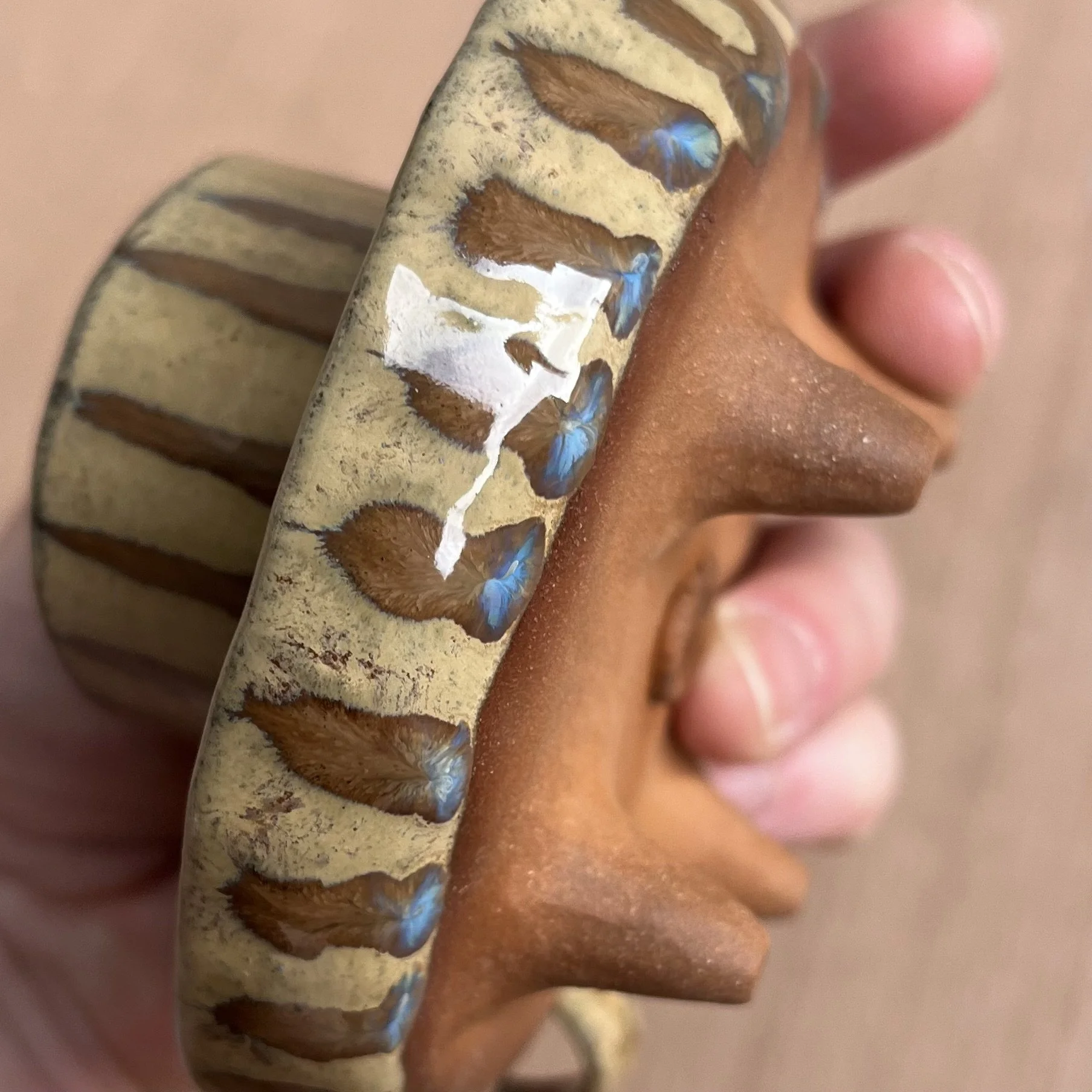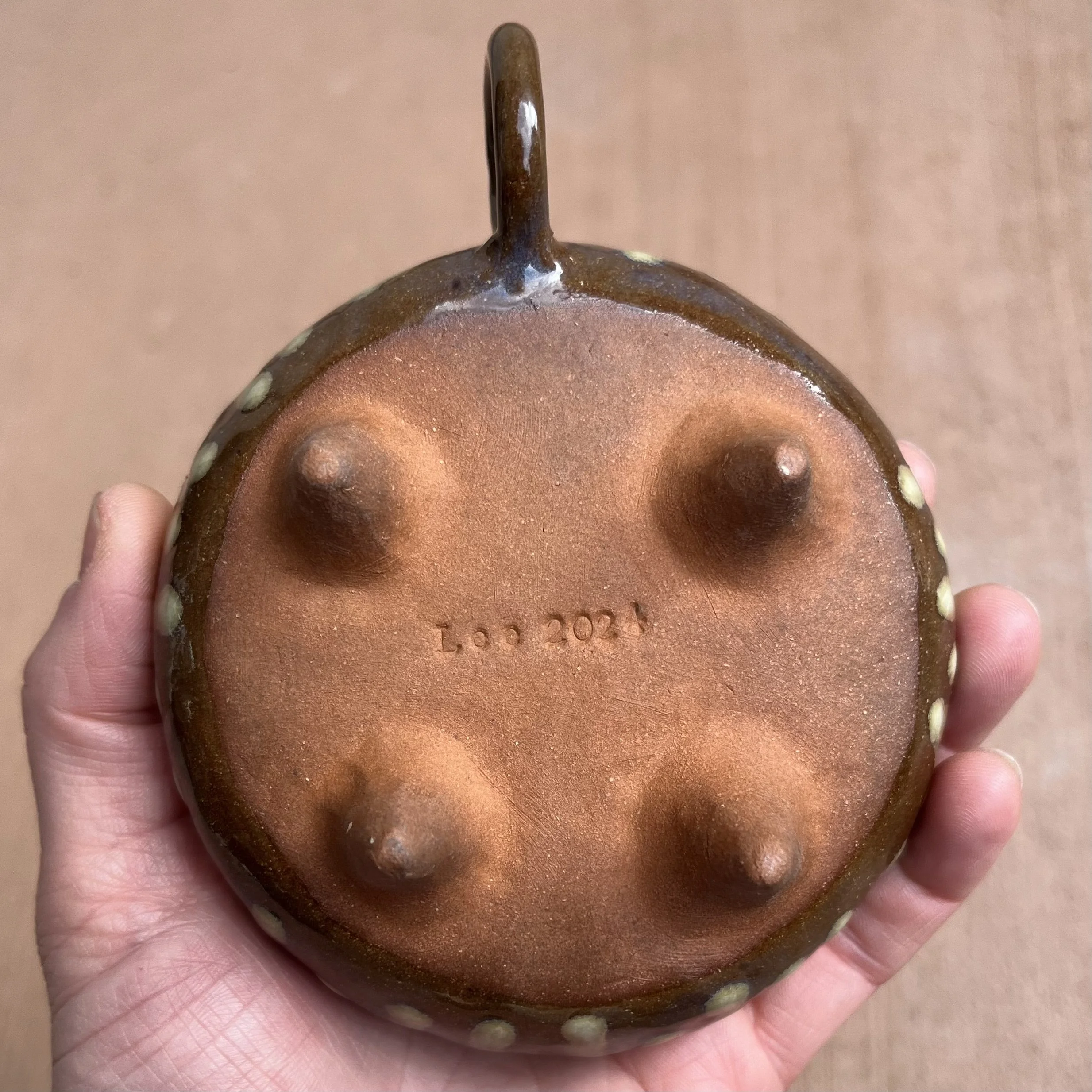 A small raised piece has been punched with a hole to support a stick incense and is attached to an elongated half cylinder that will collect dropping ash. The piece is raised on 4 small legs to give a clean and clear placement on any surface. This piece has been glazed with a subtle blue speckled glossy base and added droplets of speckled orange around the edges that create a beautiful mixture of pale yellow hues where they combine.