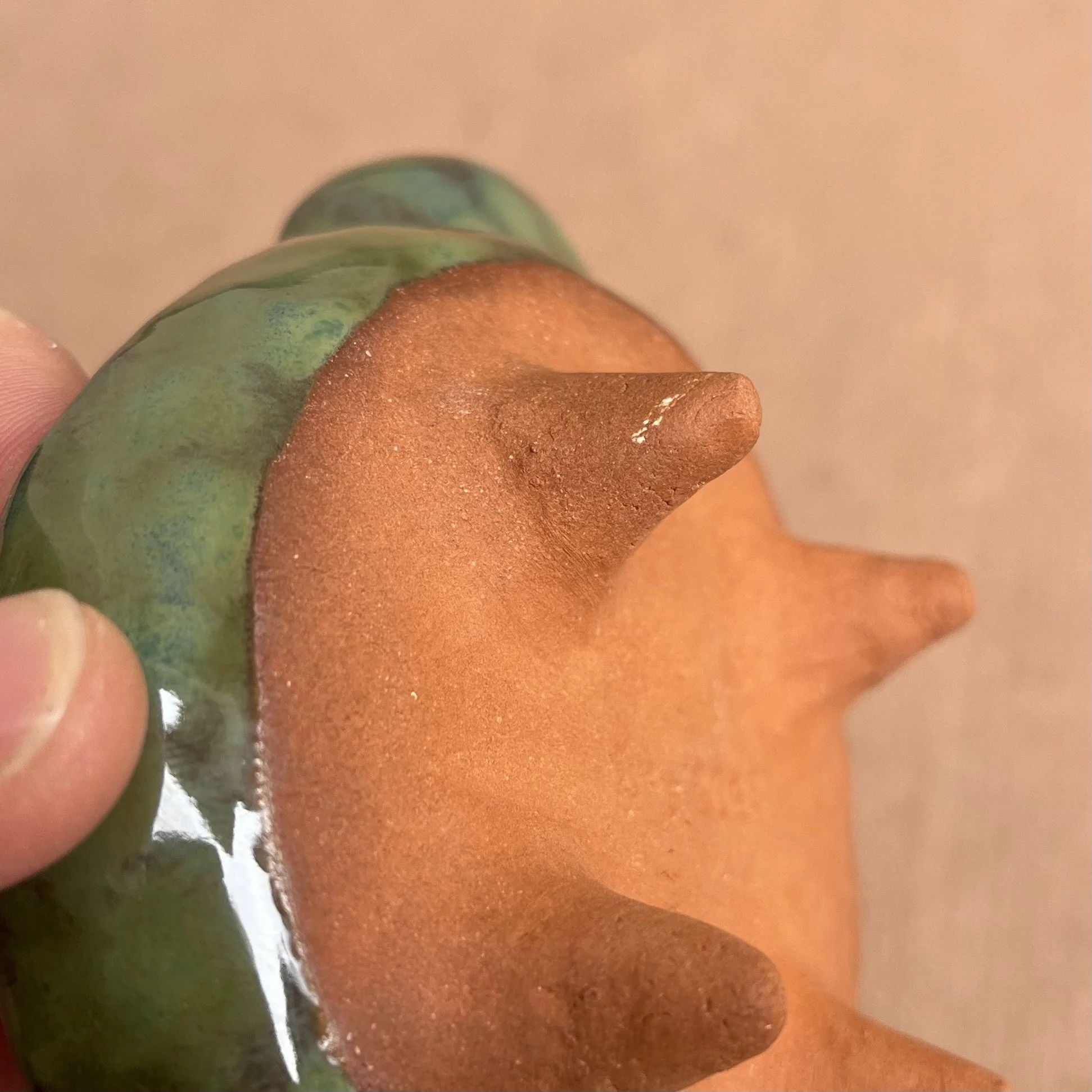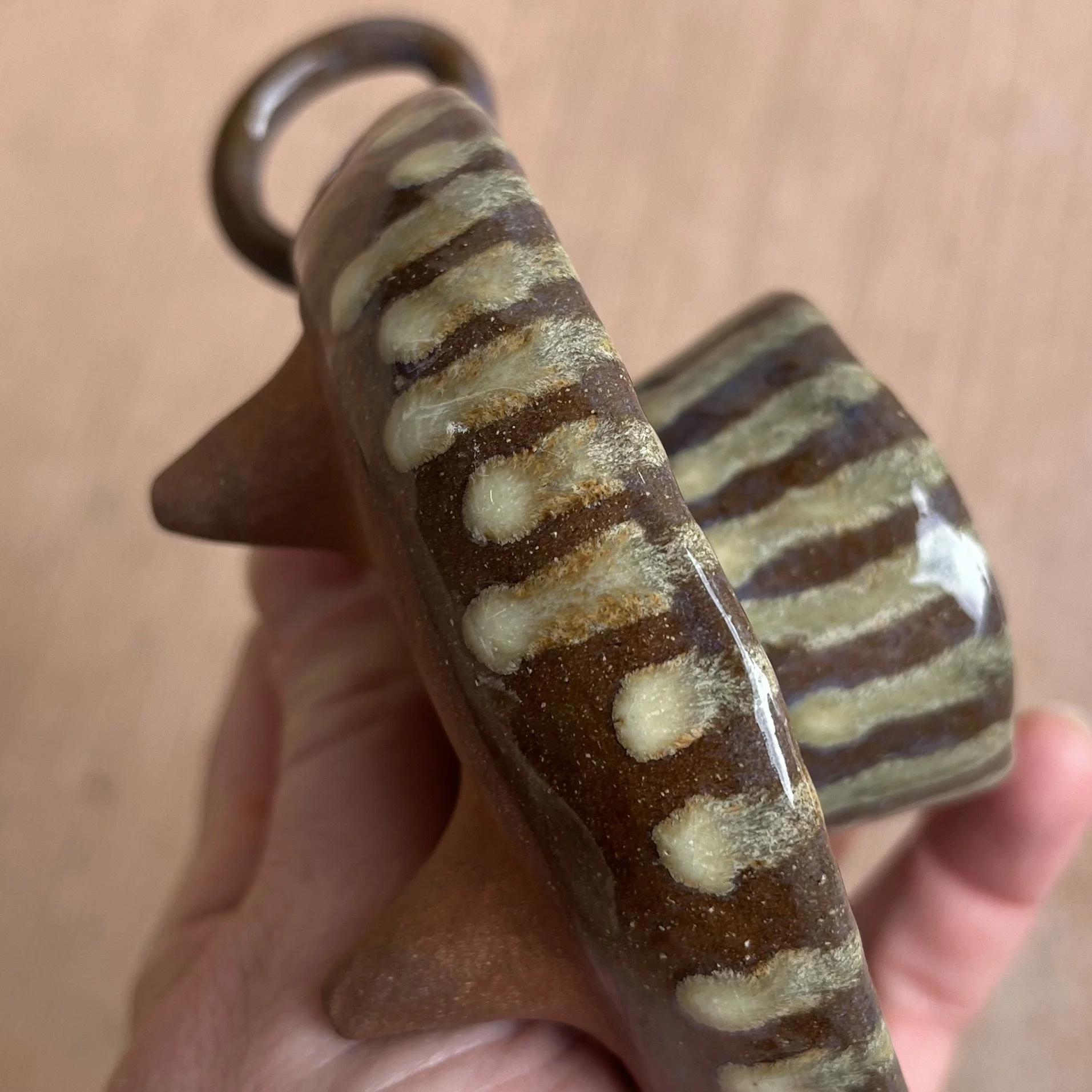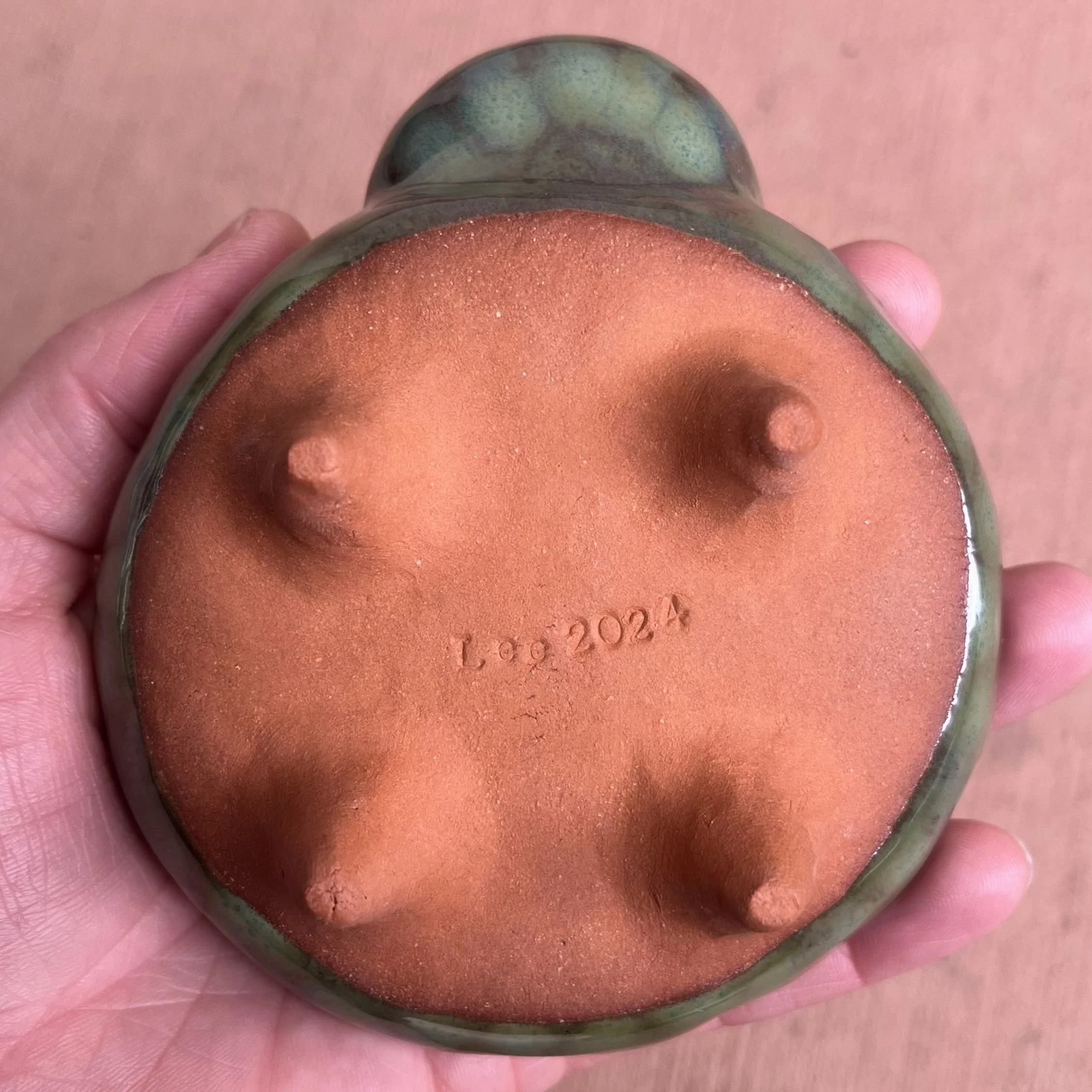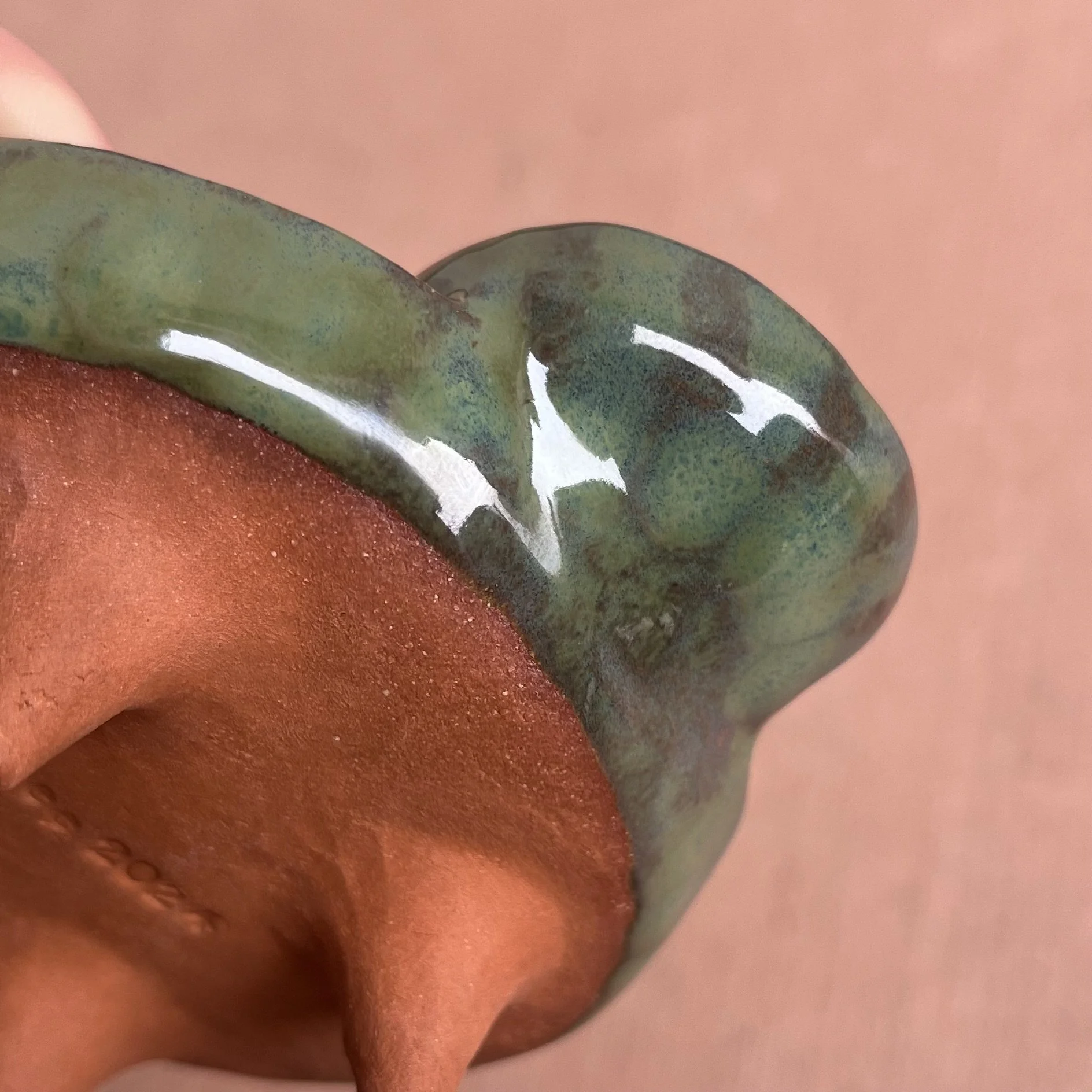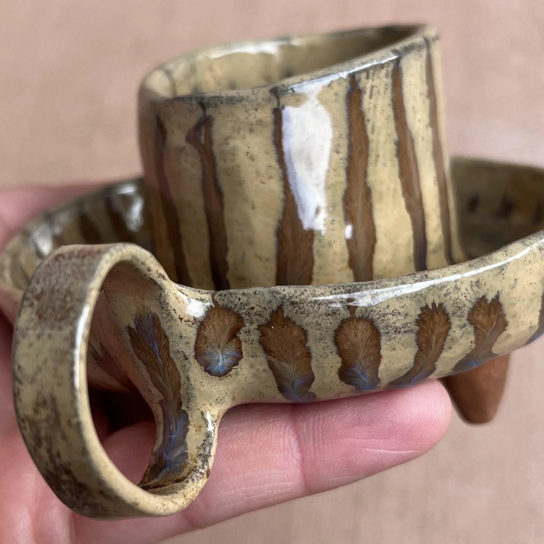A small raised piece has been punched with a hole to support a stick incense and is attached to an elongated half cylinder that will collect dropping ash. The piece is raised on 4 small legs to give a clean and clear placement on any surface. This piece has been glazed with a subtle blue speckled glossy base and added droplets of speckled orange around the edges that create a beautiful mixture of pale yellow hues where they combine.