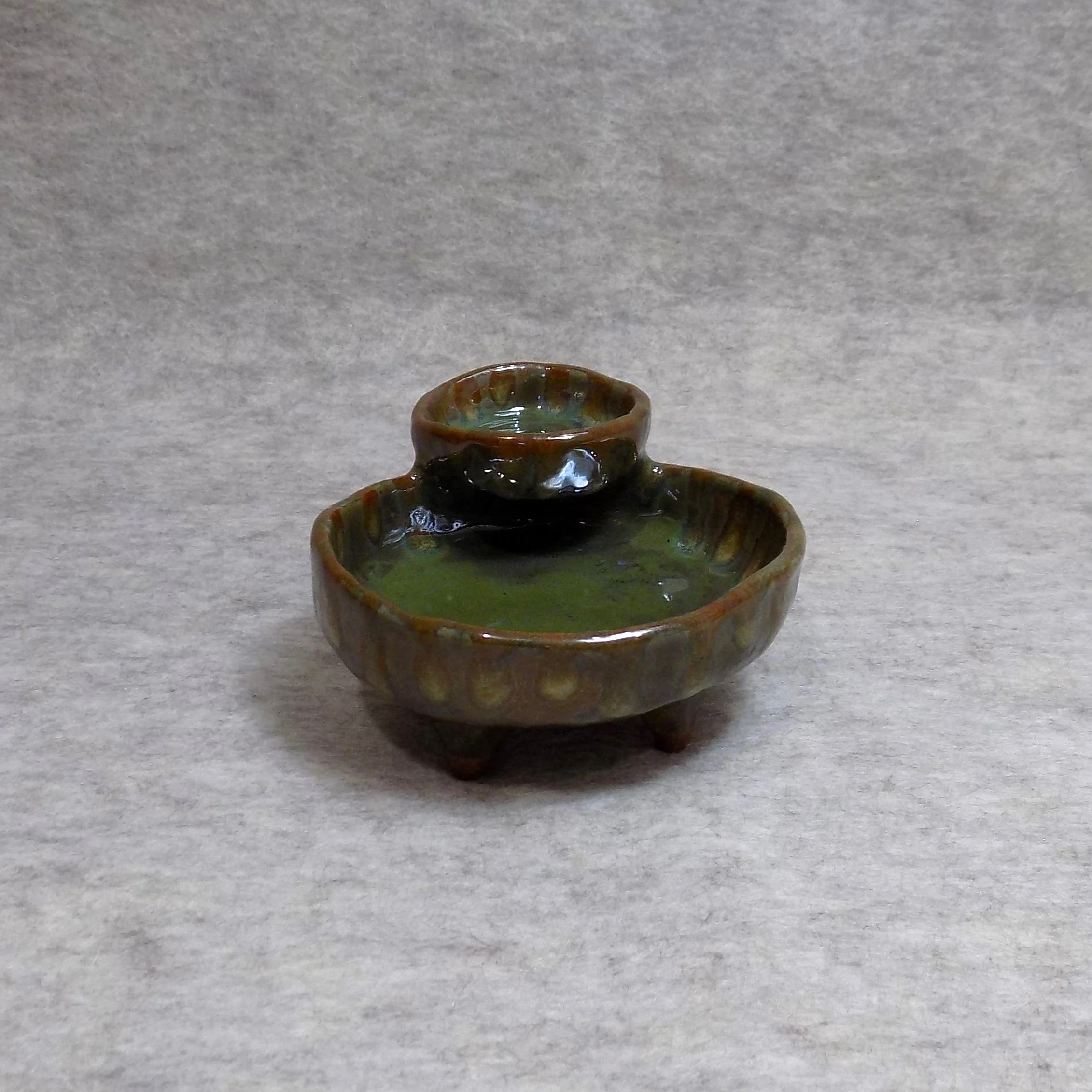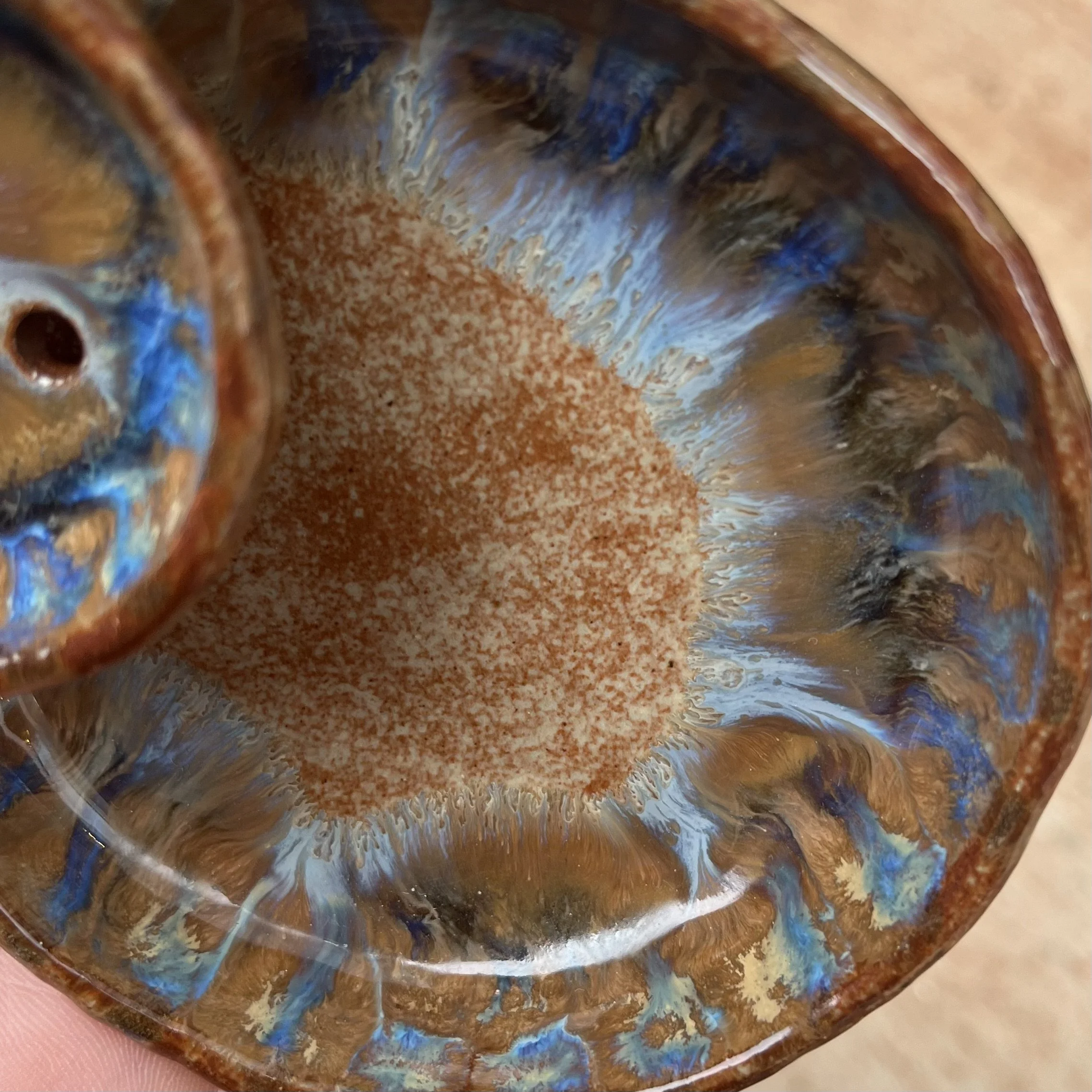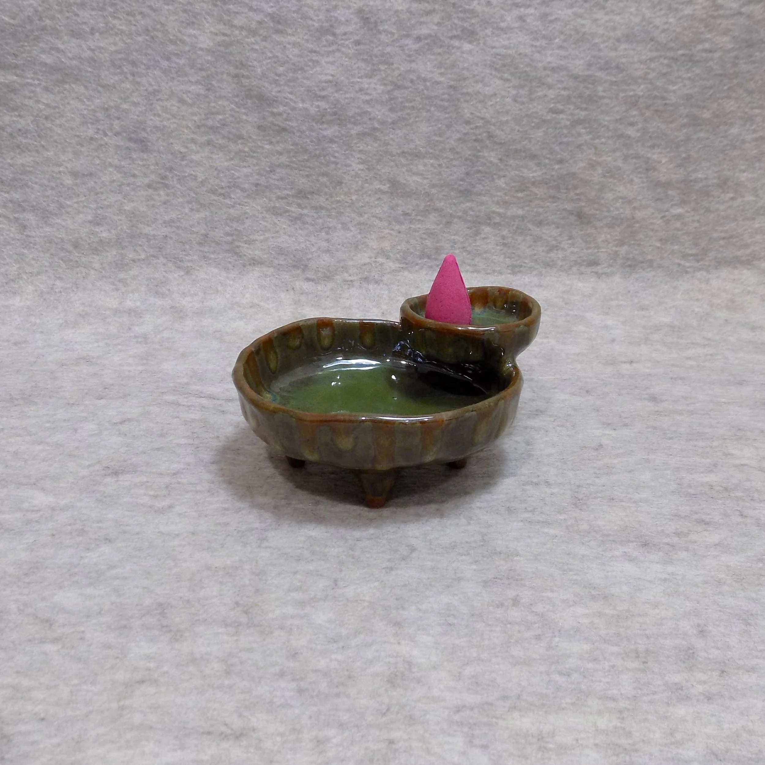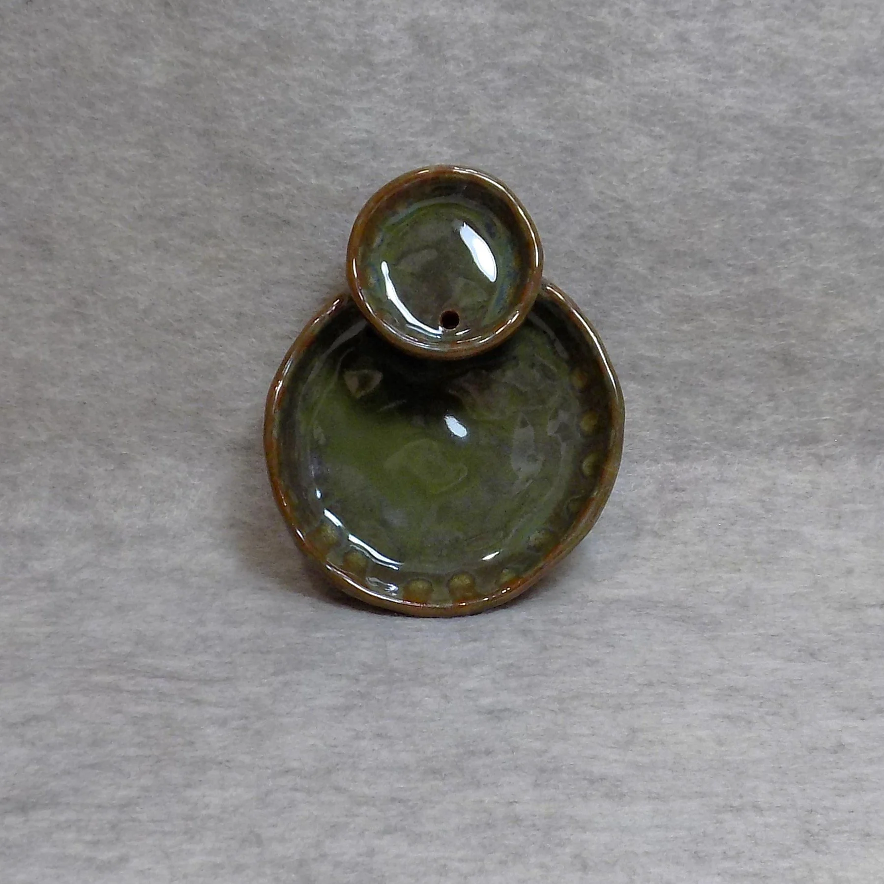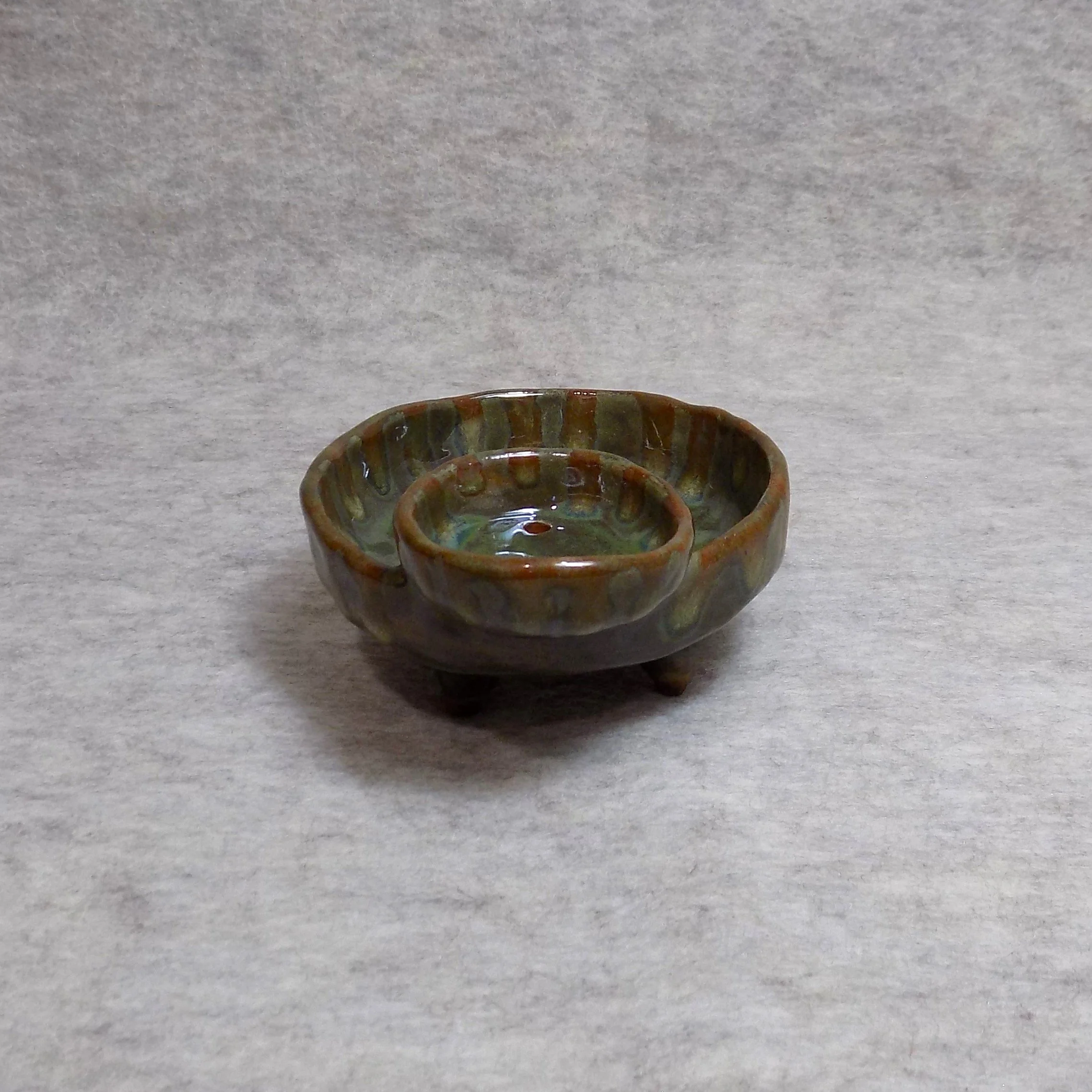 A small bowl has been punched with a hole to support a cone incense and is attached to a lower larger bowl that will collect pooling smoke for a visually pleasing effect. The smaller bowl will collect ash from the cone incense as it breaks down. The piece is raised on 4 small legs to give a clean and clear placement on any surface. This piece has not been glazed to show off the vibrant red color of the stoneware along with the intriguing textures of unglazed clay.