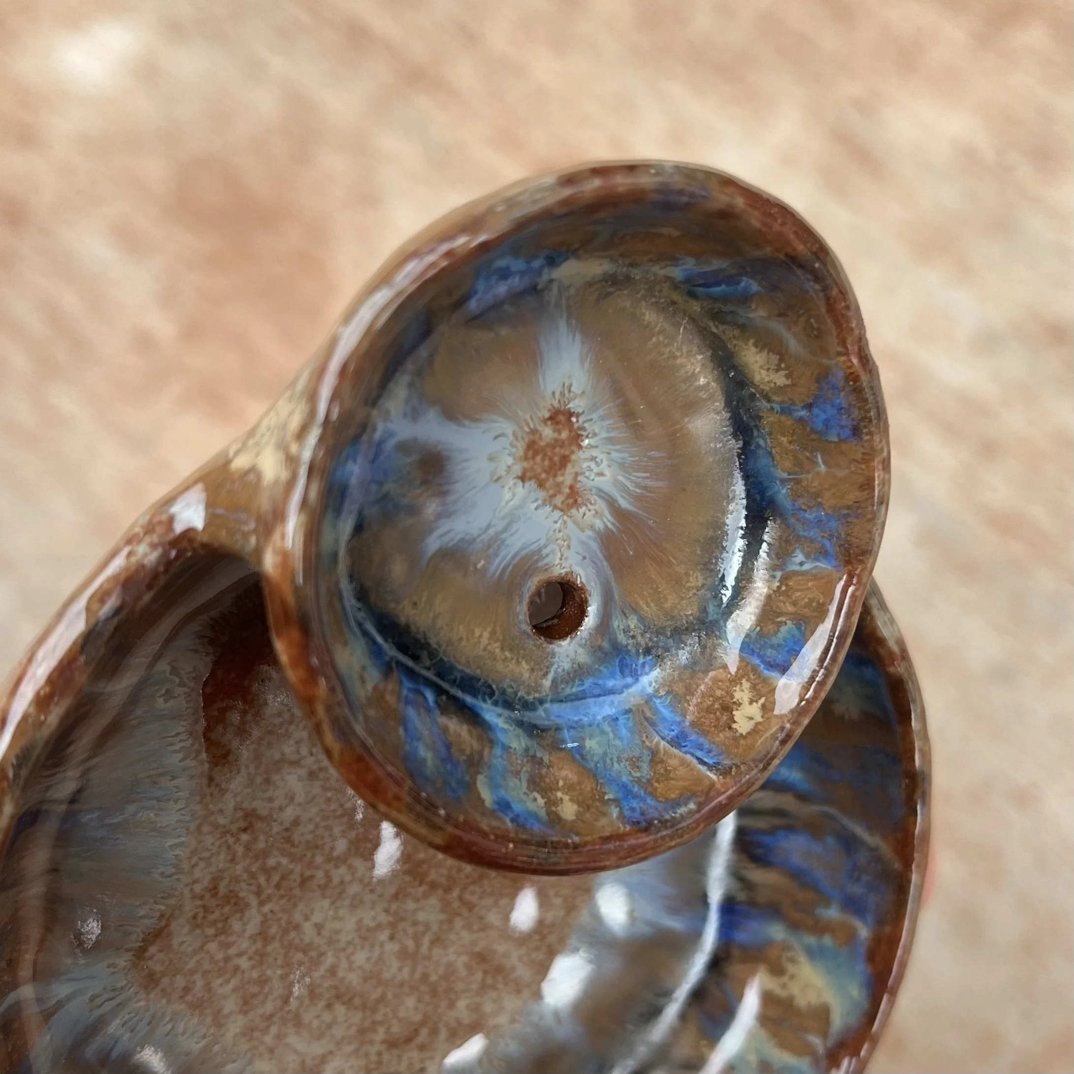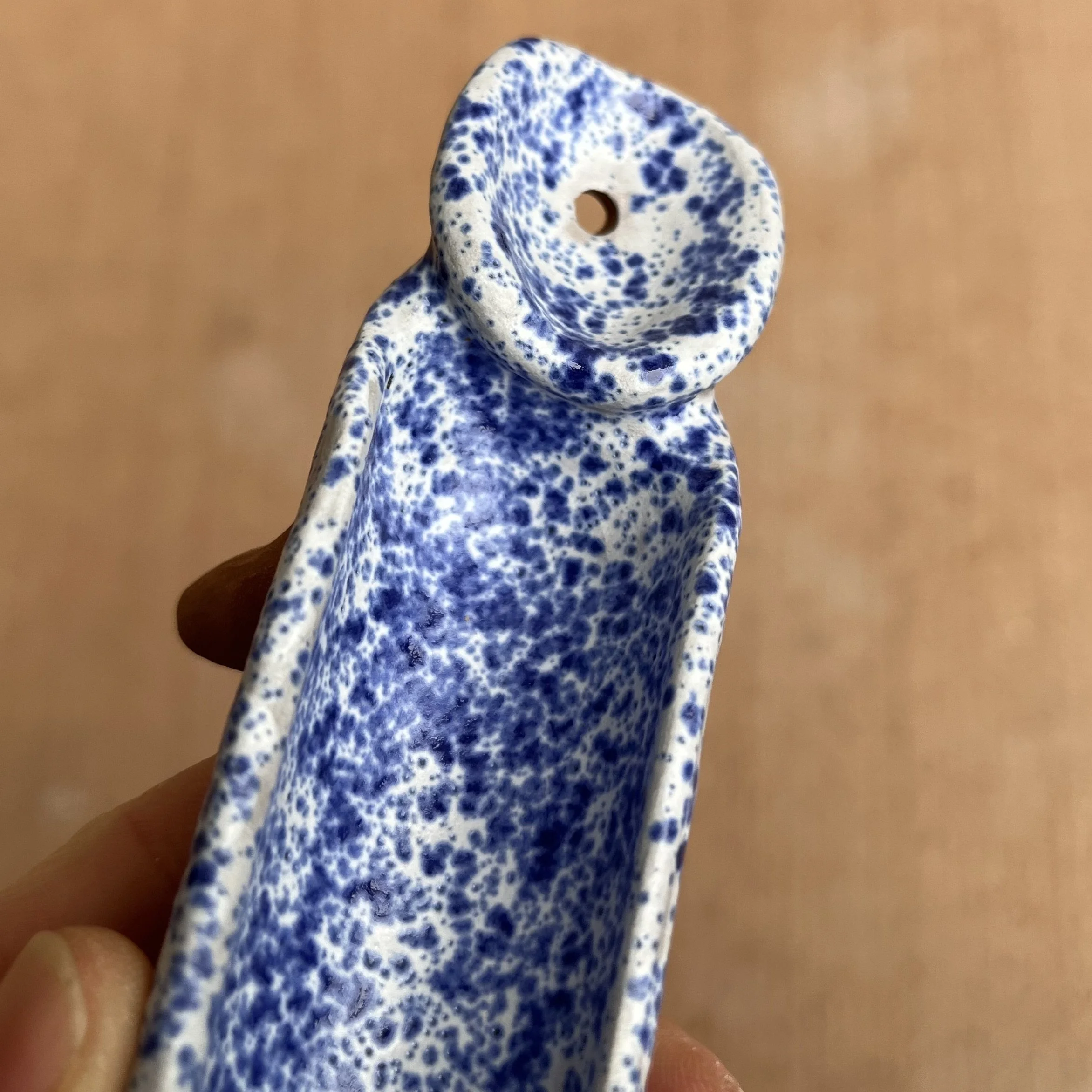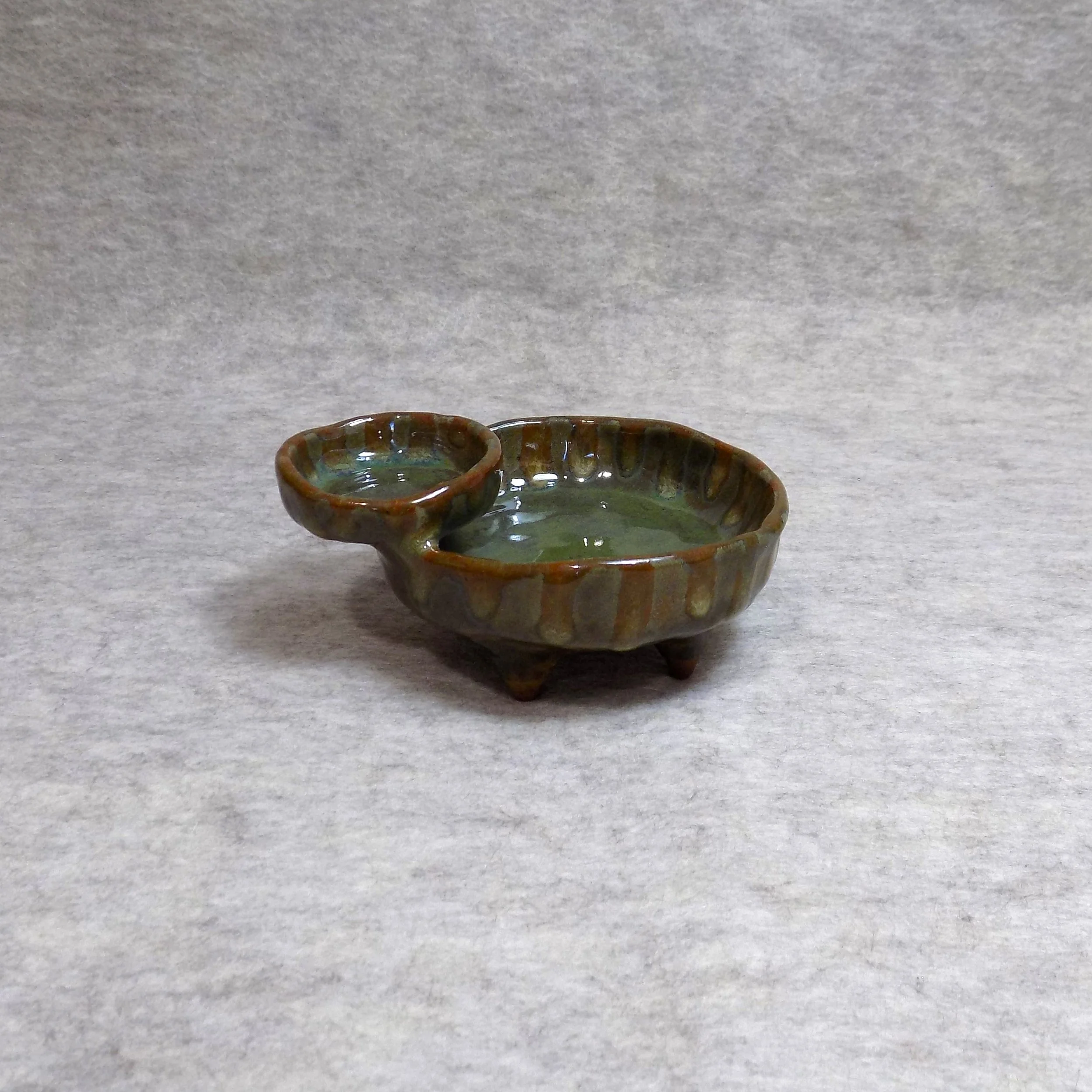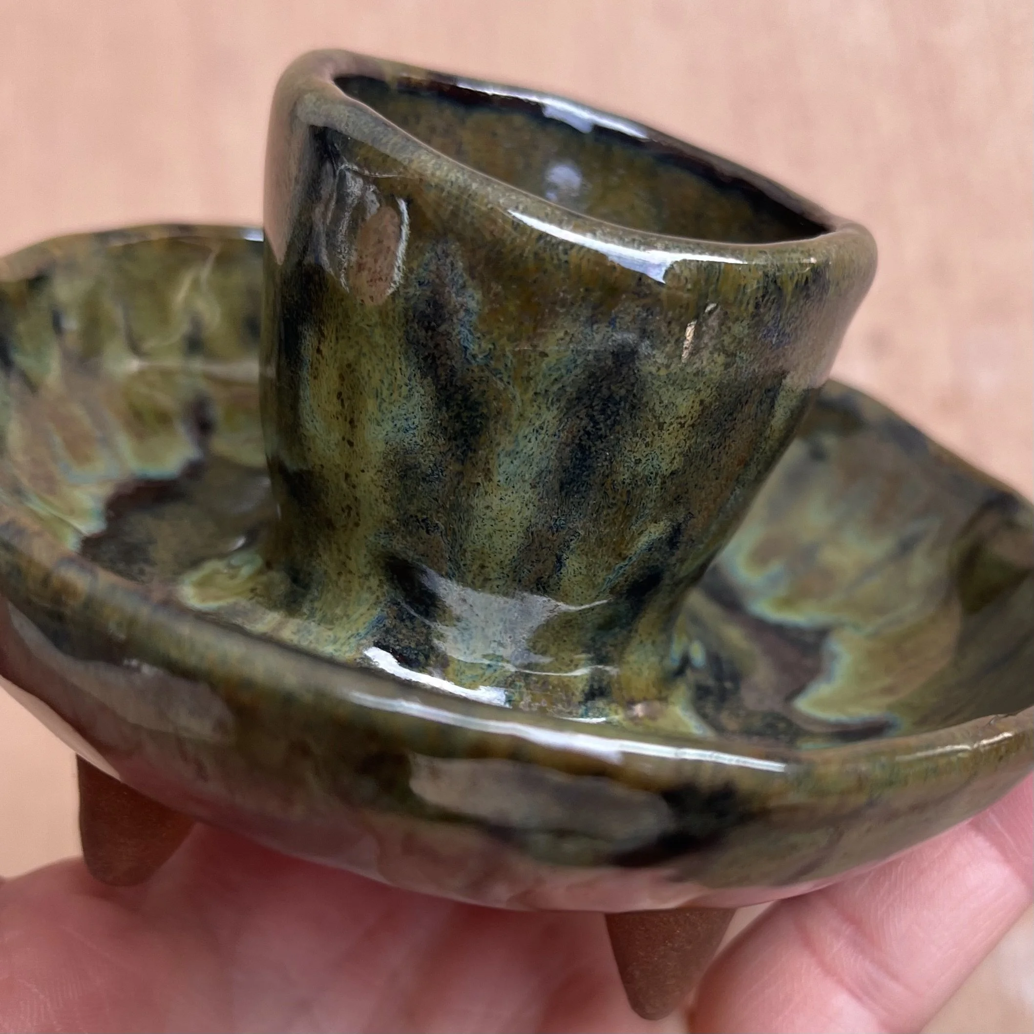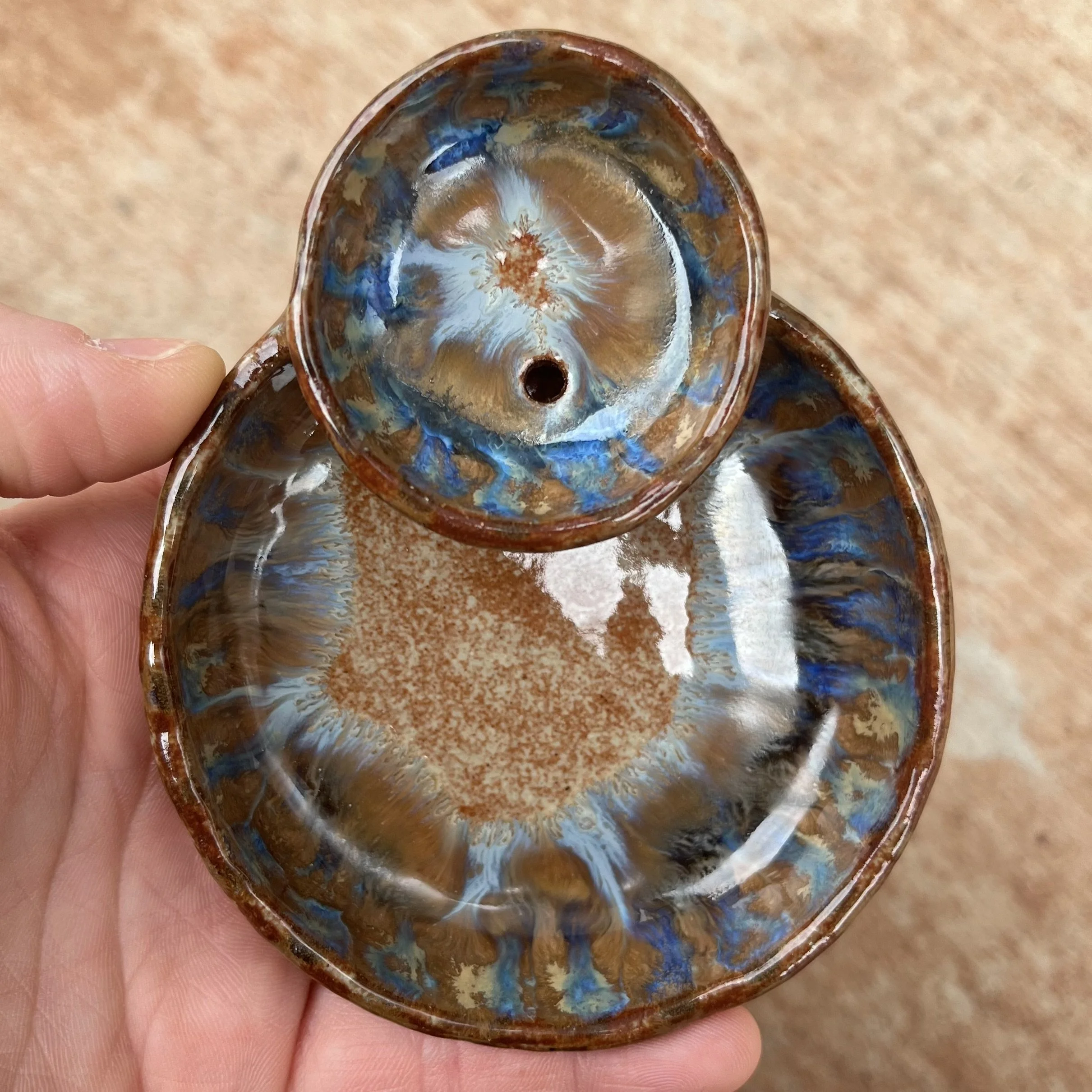 A small bowl has been punched with a hole to support a cone incense and is attached to a lower larger bowl that will collect pooling smoke for a visually pleasing effect. The smaller bowl will collect ash from the cone incense as it breaks down. The piece is raised on 4 small legs to give a clean and clear placement on any surface. This piece has not been glazed to show off the vibrant red color of the stoneware along with the intriguing textures of unglazed clay.