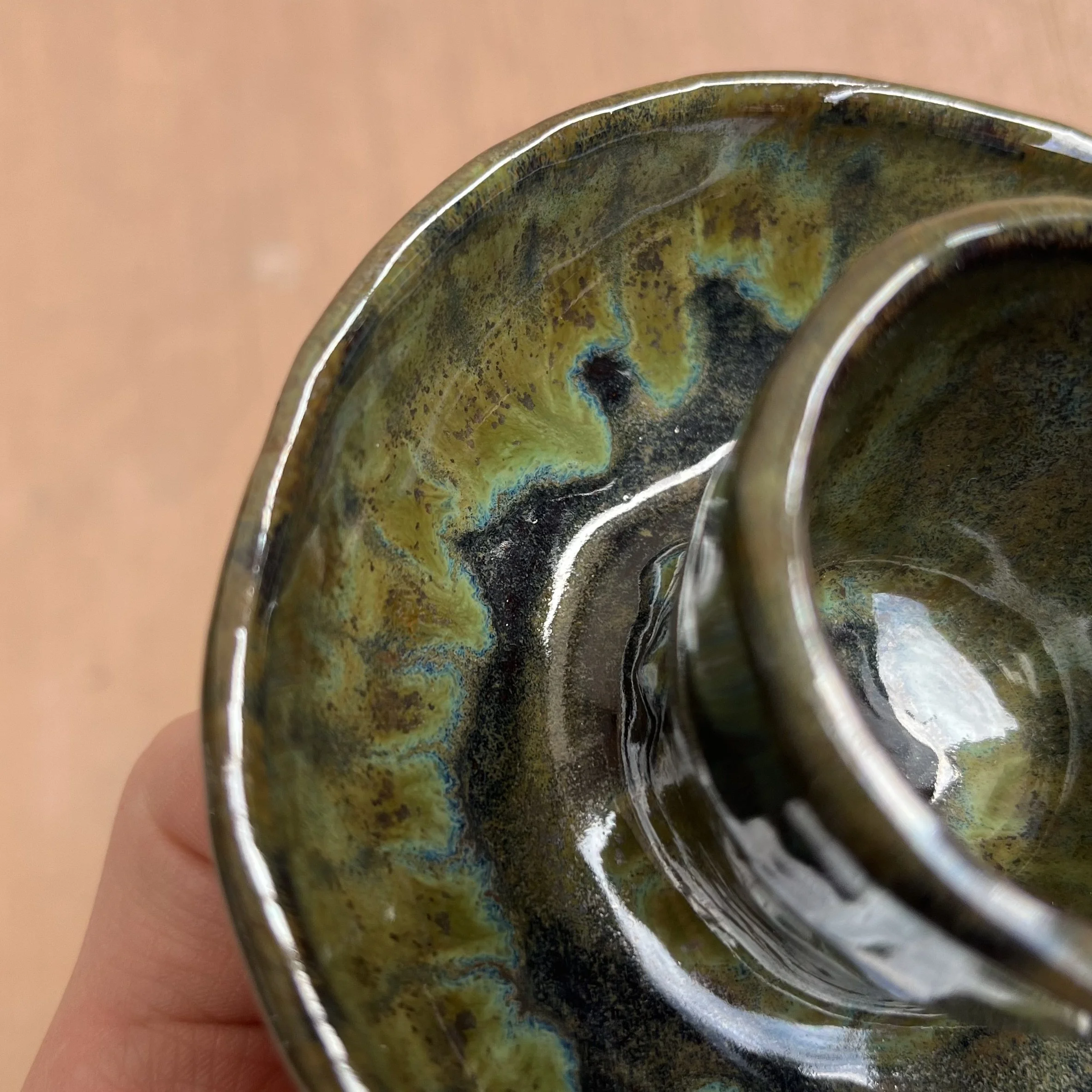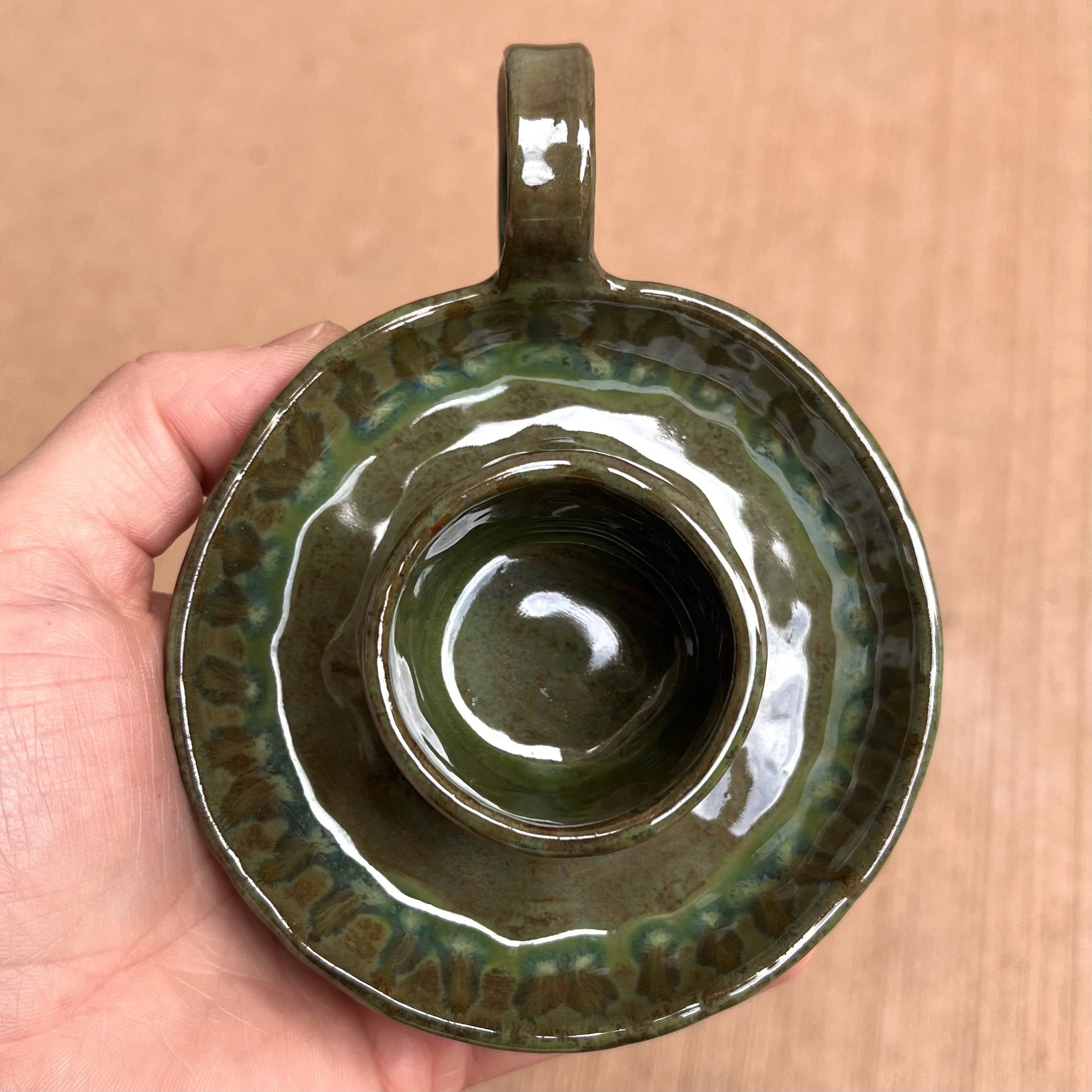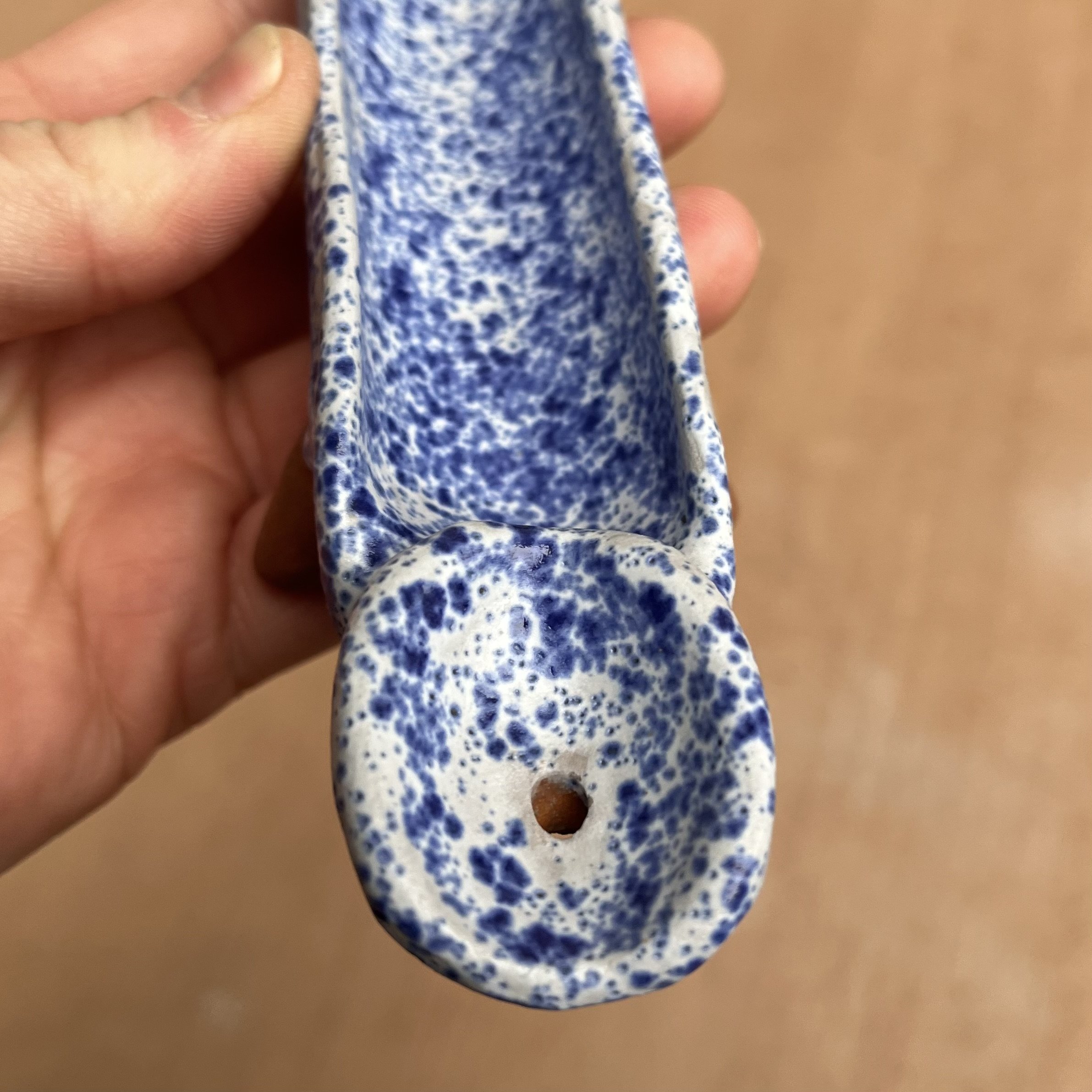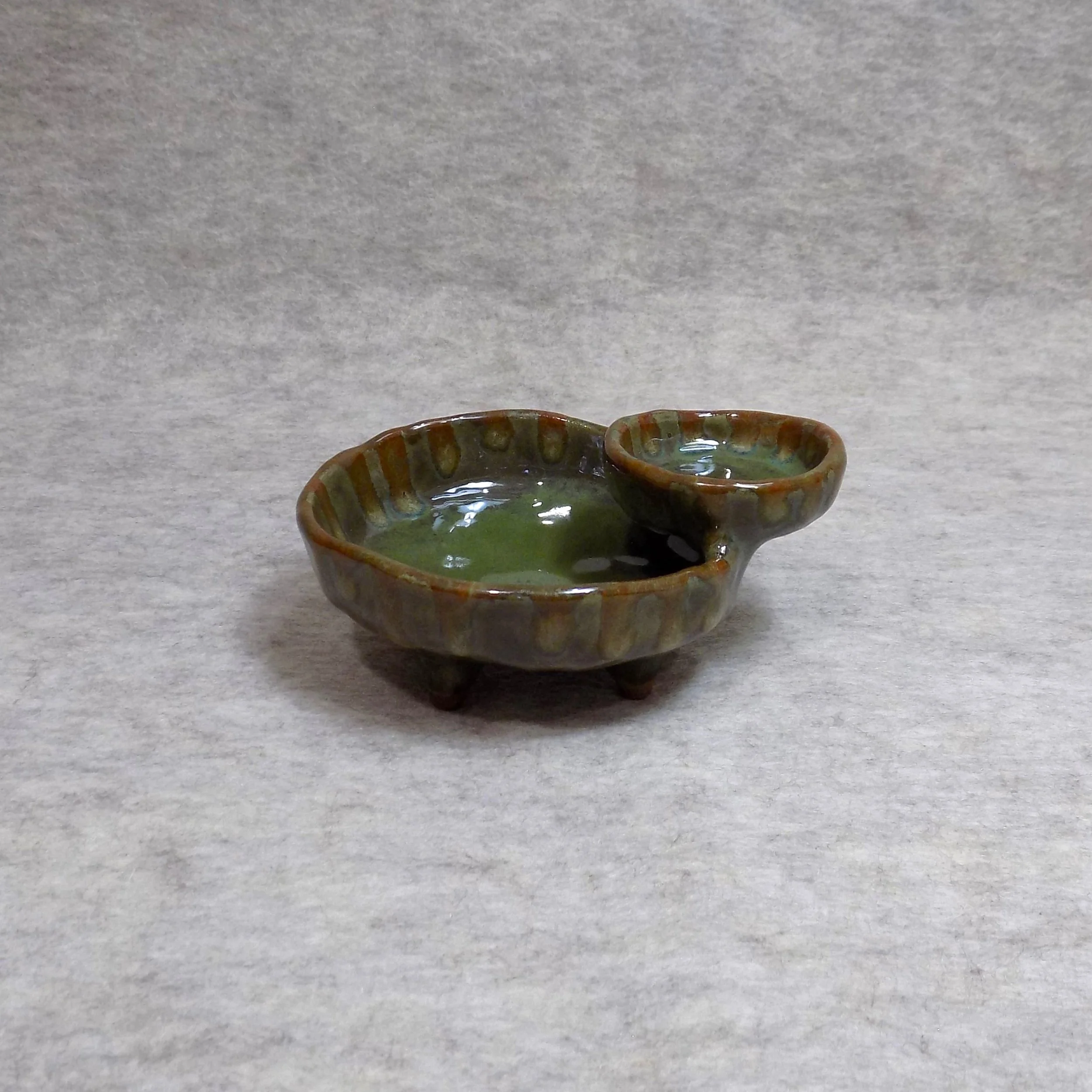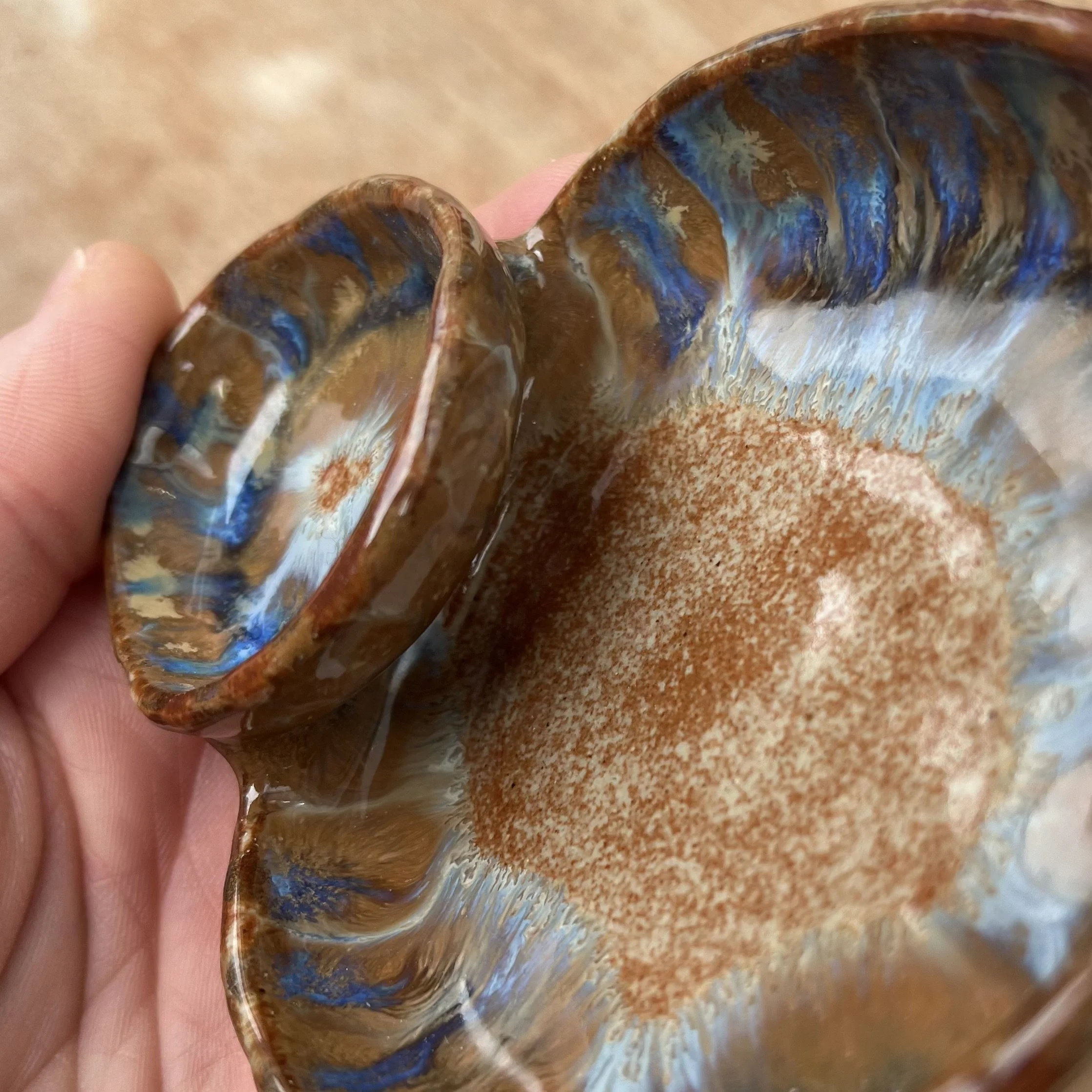 A small bowl has been punched with a hole to support a cone incense and is attached to a lower larger bowl that will collect pooling smoke for a visually pleasing effect. The smaller bowl will collect ash from the cone incense as it breaks down. The piece is raised on 4 small legs to give a clean and clear placement on any surface. This piece has not been glazed to show off the vibrant red color of the stoneware along with the intriguing textures of unglazed clay.