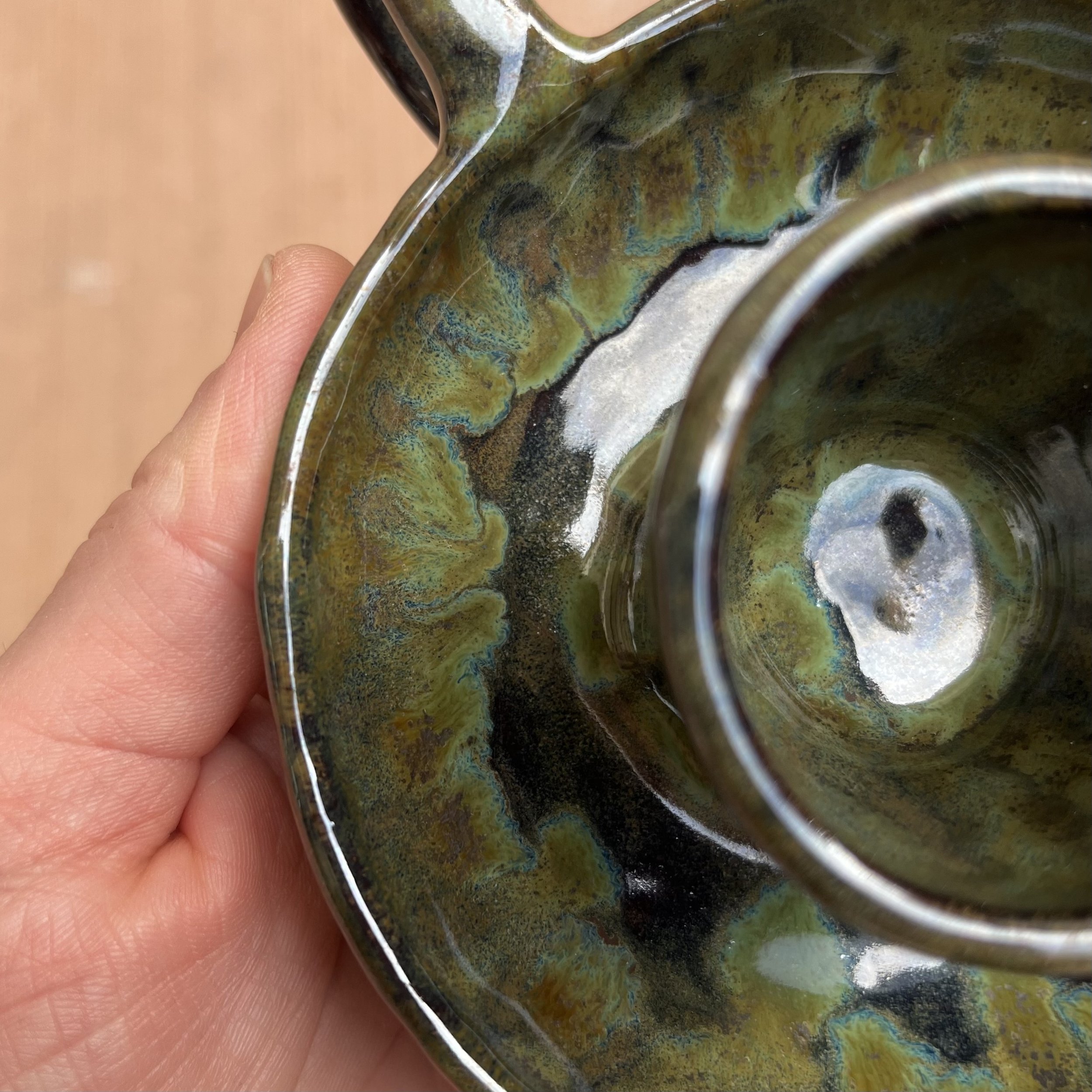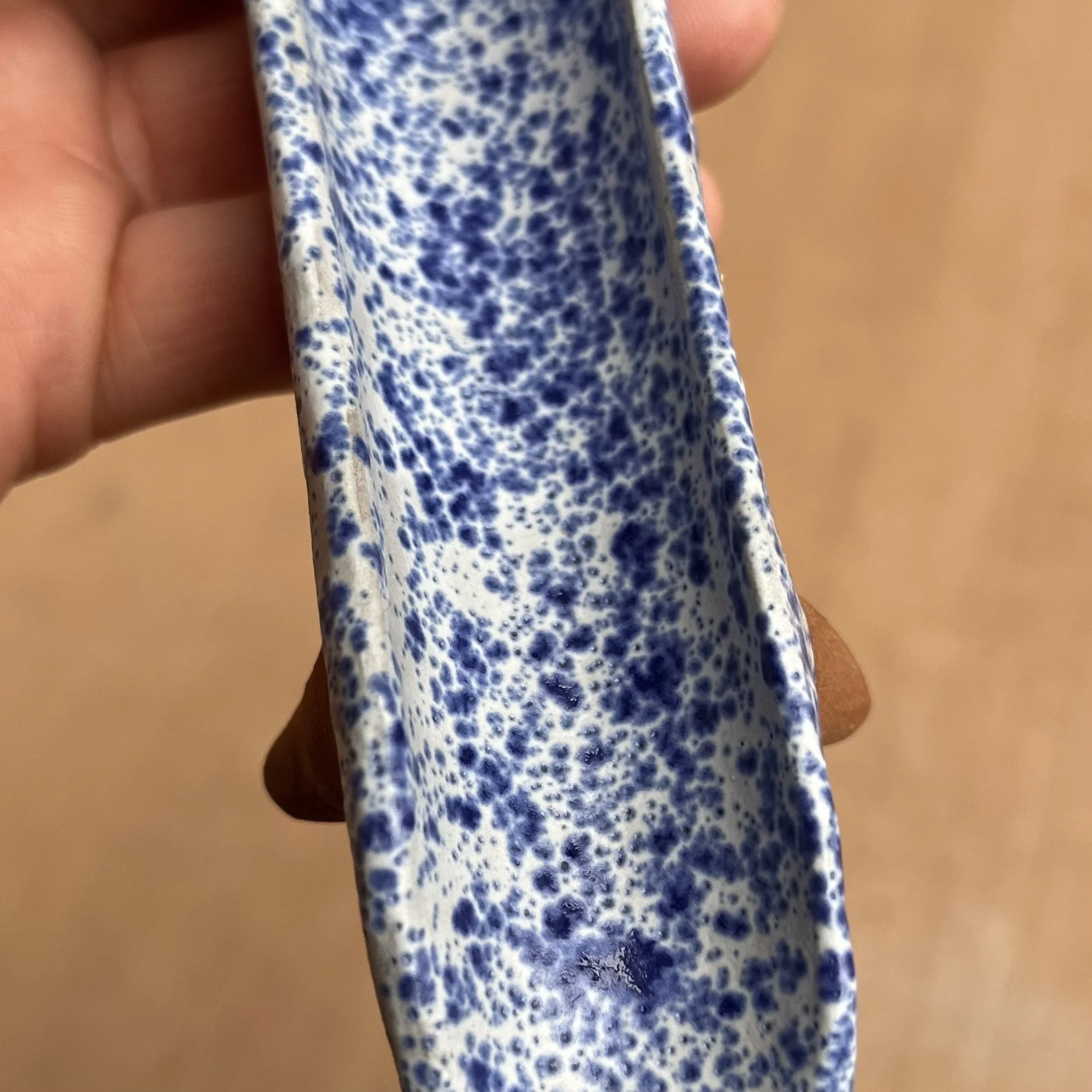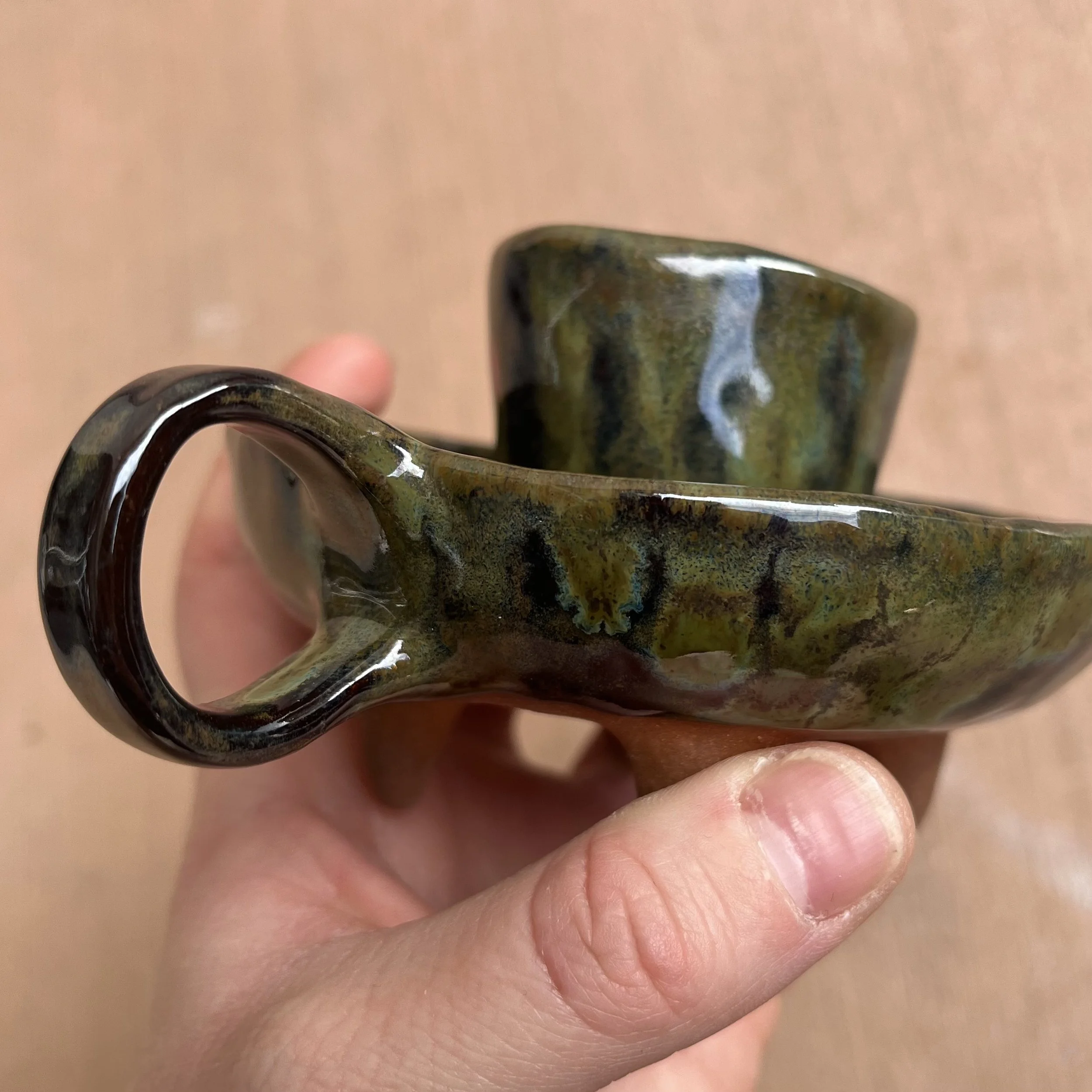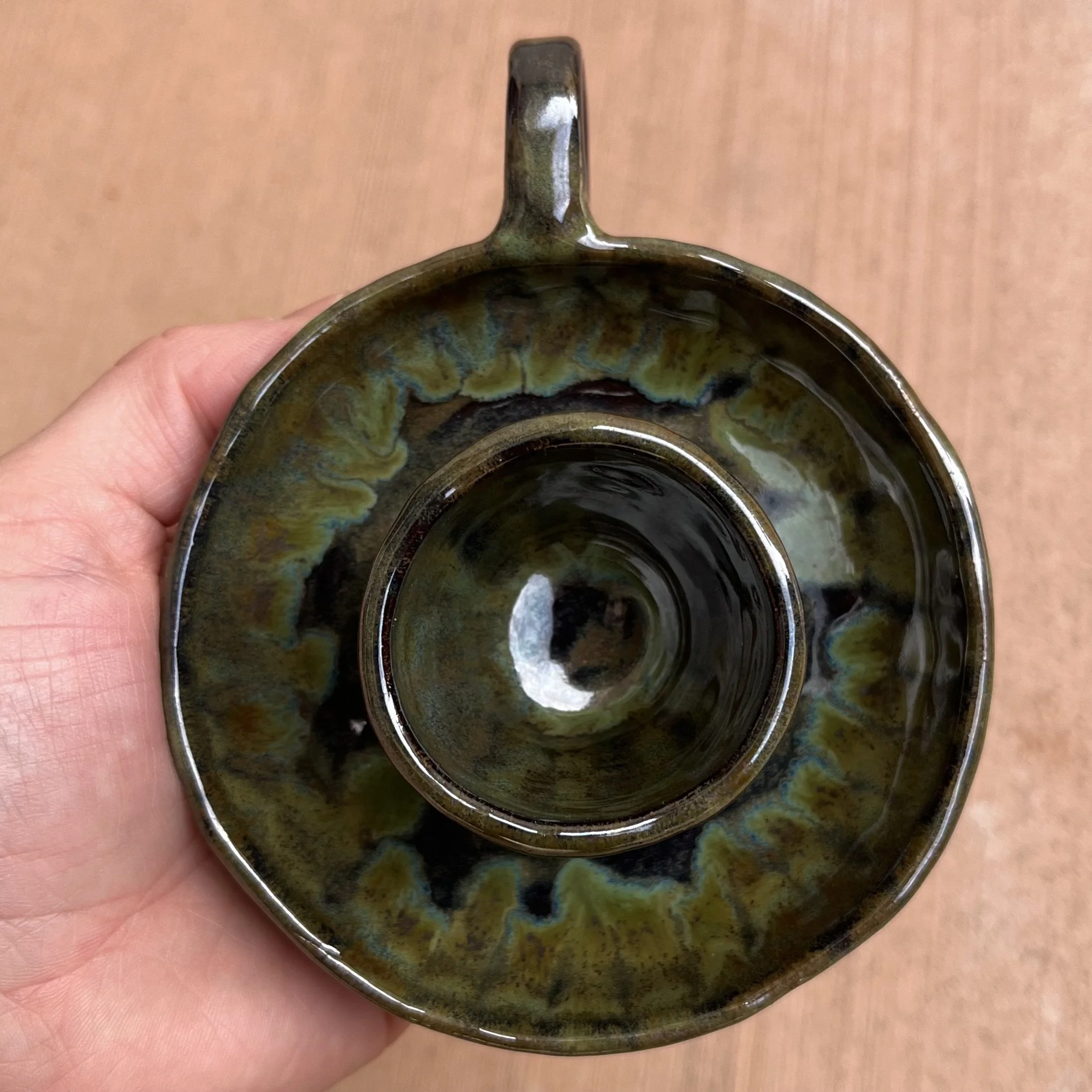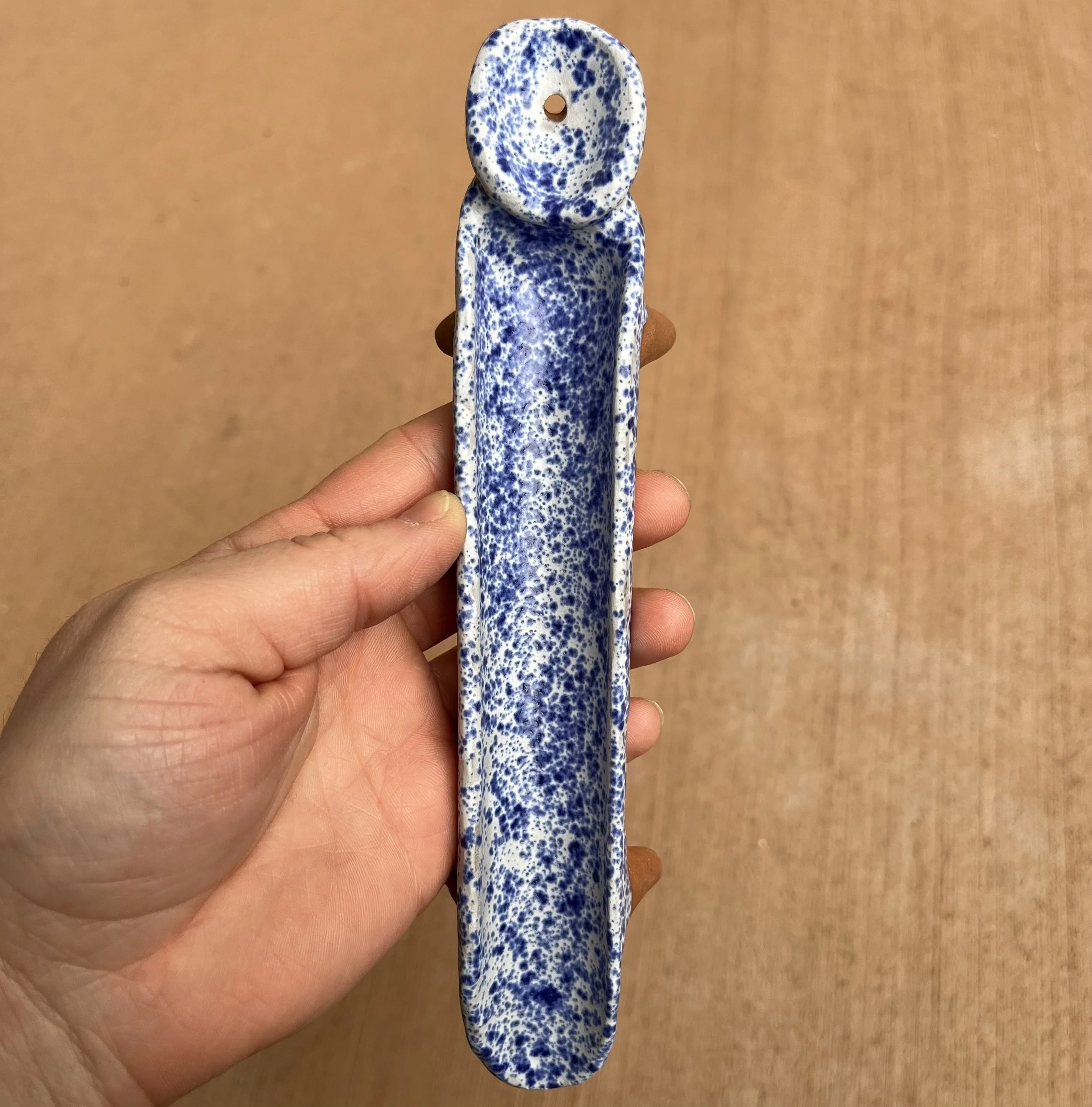 A small bowl has been punched with a hole to support a cone incense and is attached to a lower larger bowl that will collect pooling smoke for a visually pleasing effect. The smaller bowl will collect ash from the cone incense as it breaks down. The piece is raised on 4 small legs to give a clean and clear placement on any surface. This piece has not been glazed to show off the vibrant red color of the stoneware along with the intriguing textures of unglazed clay.