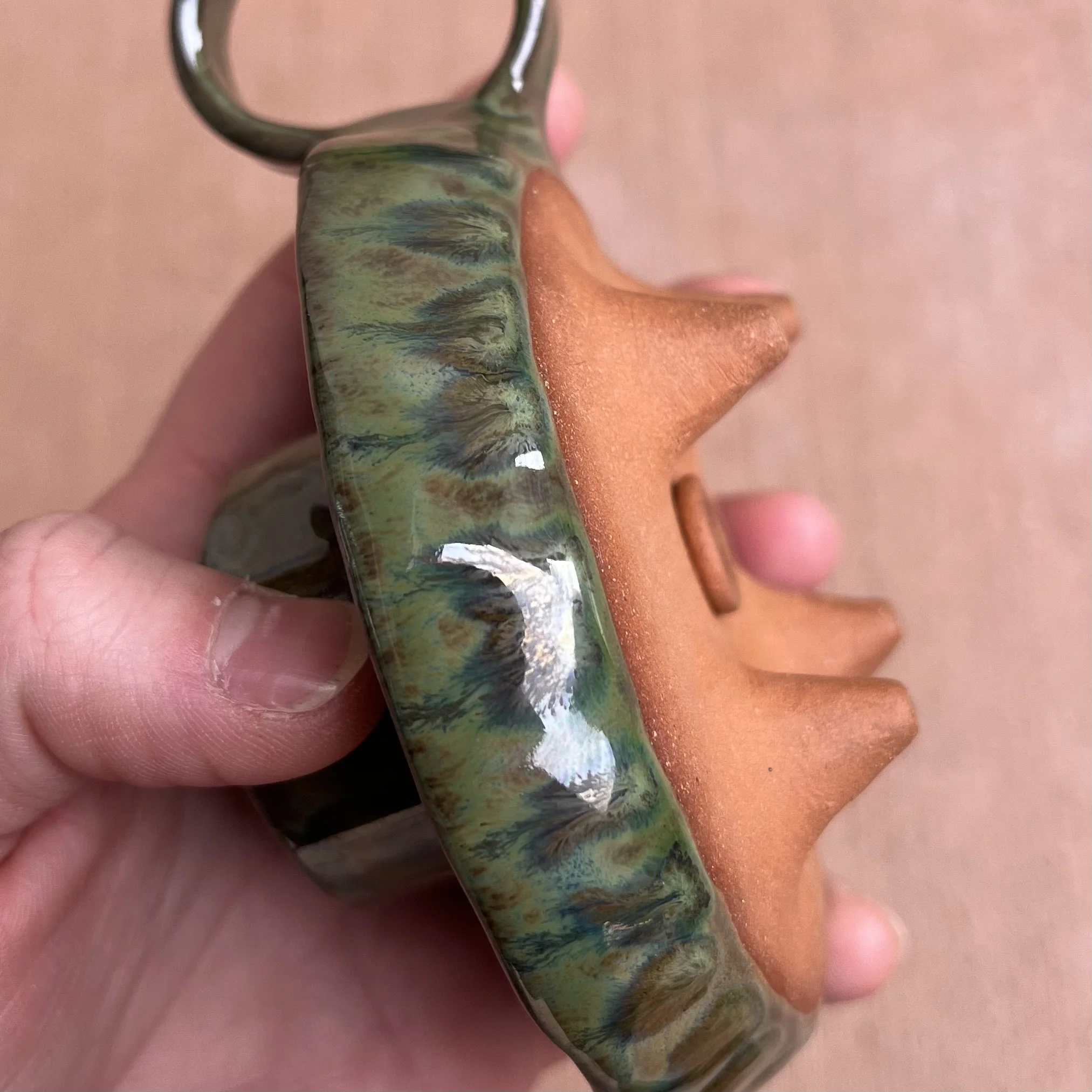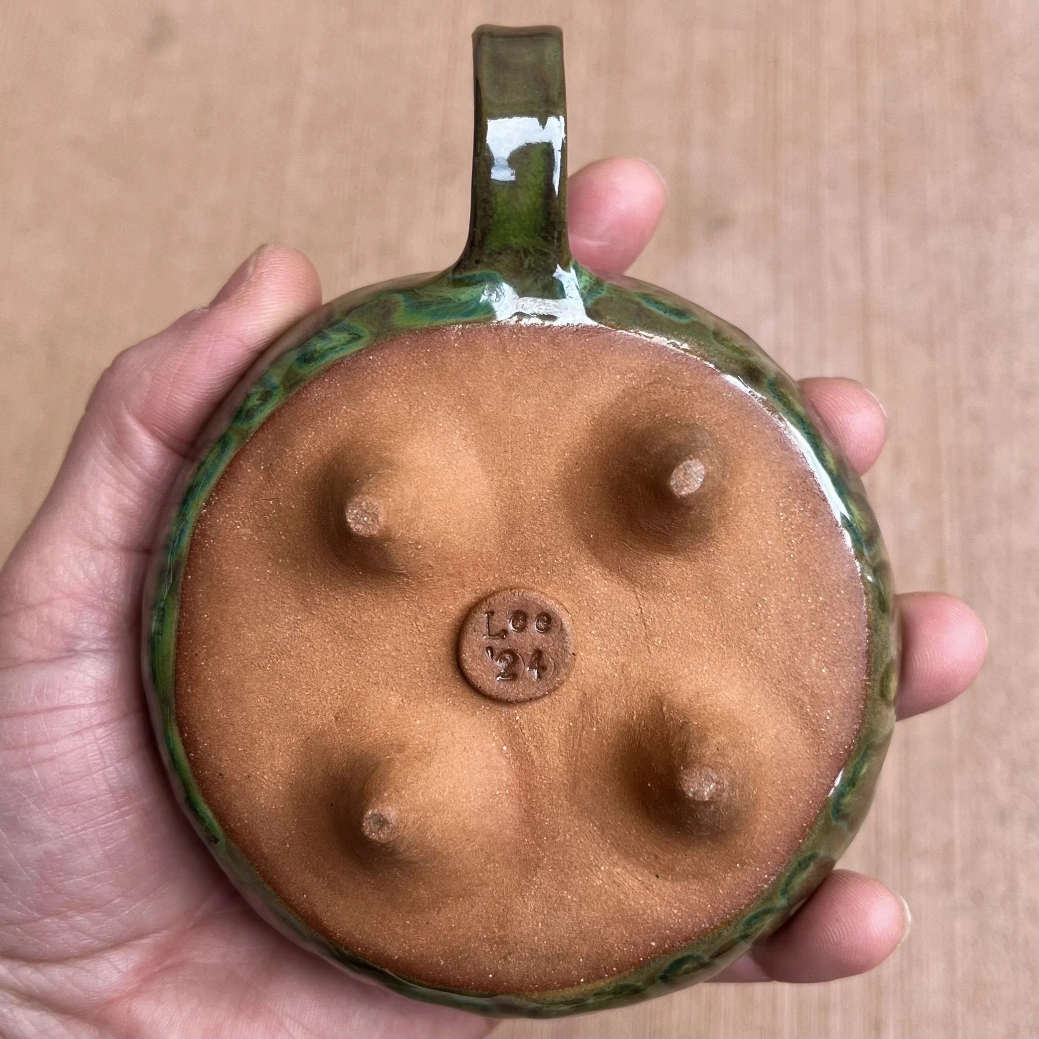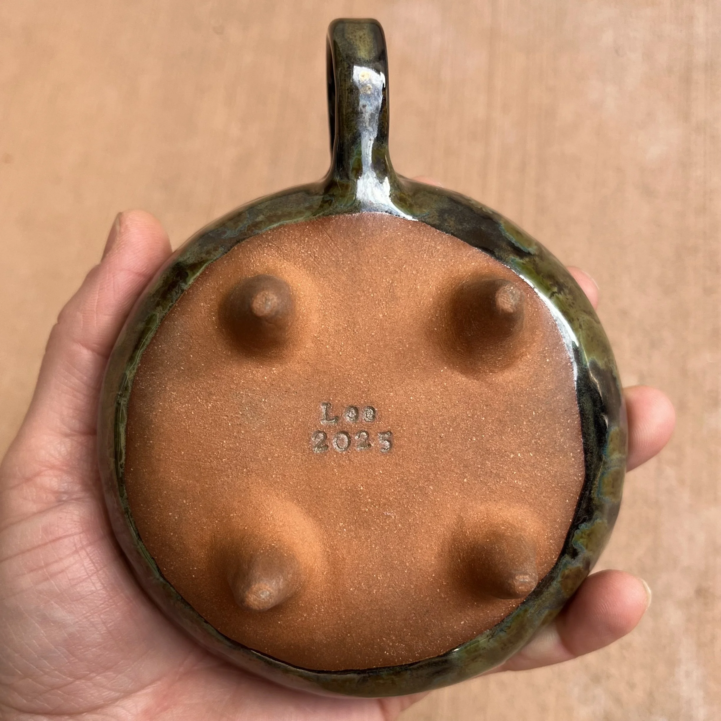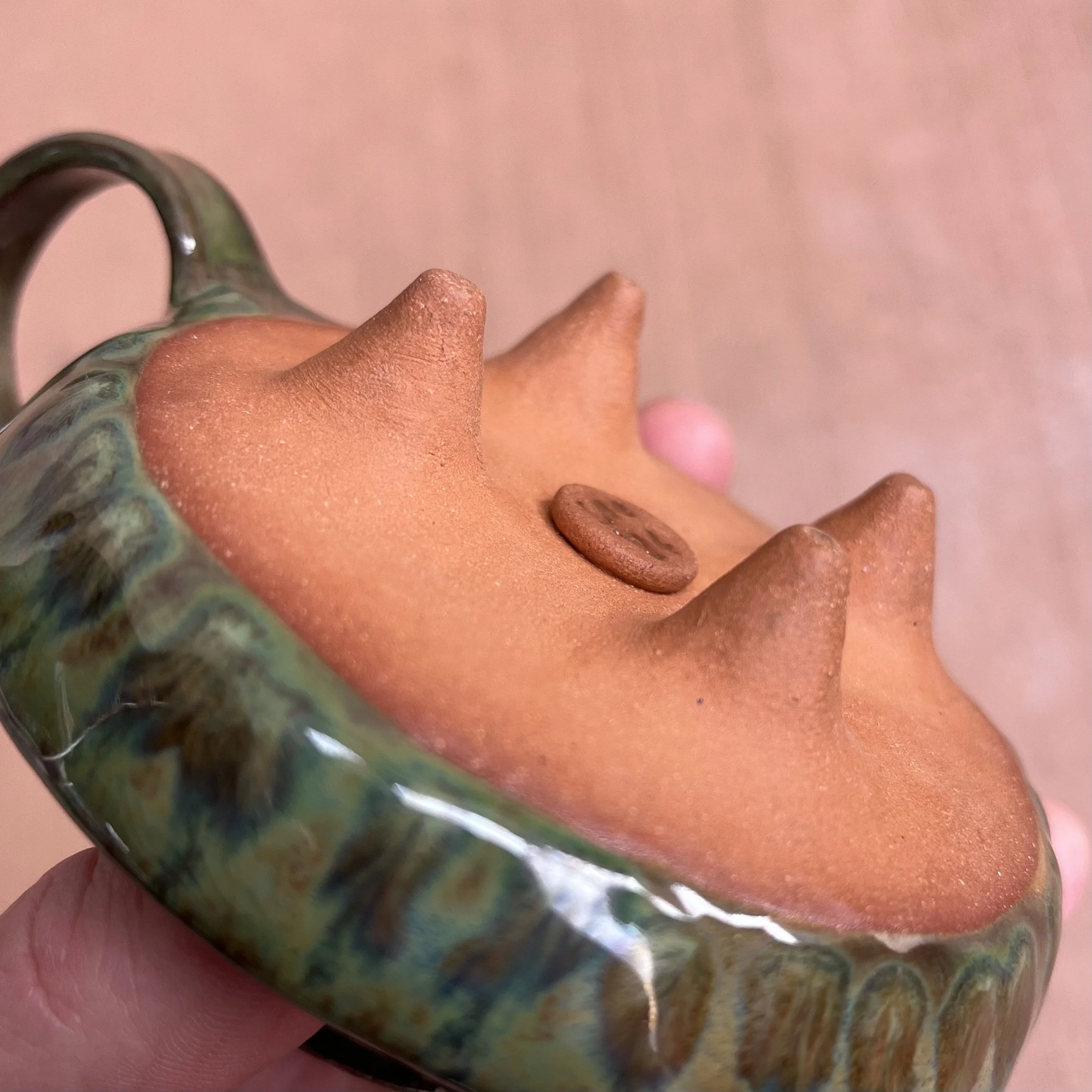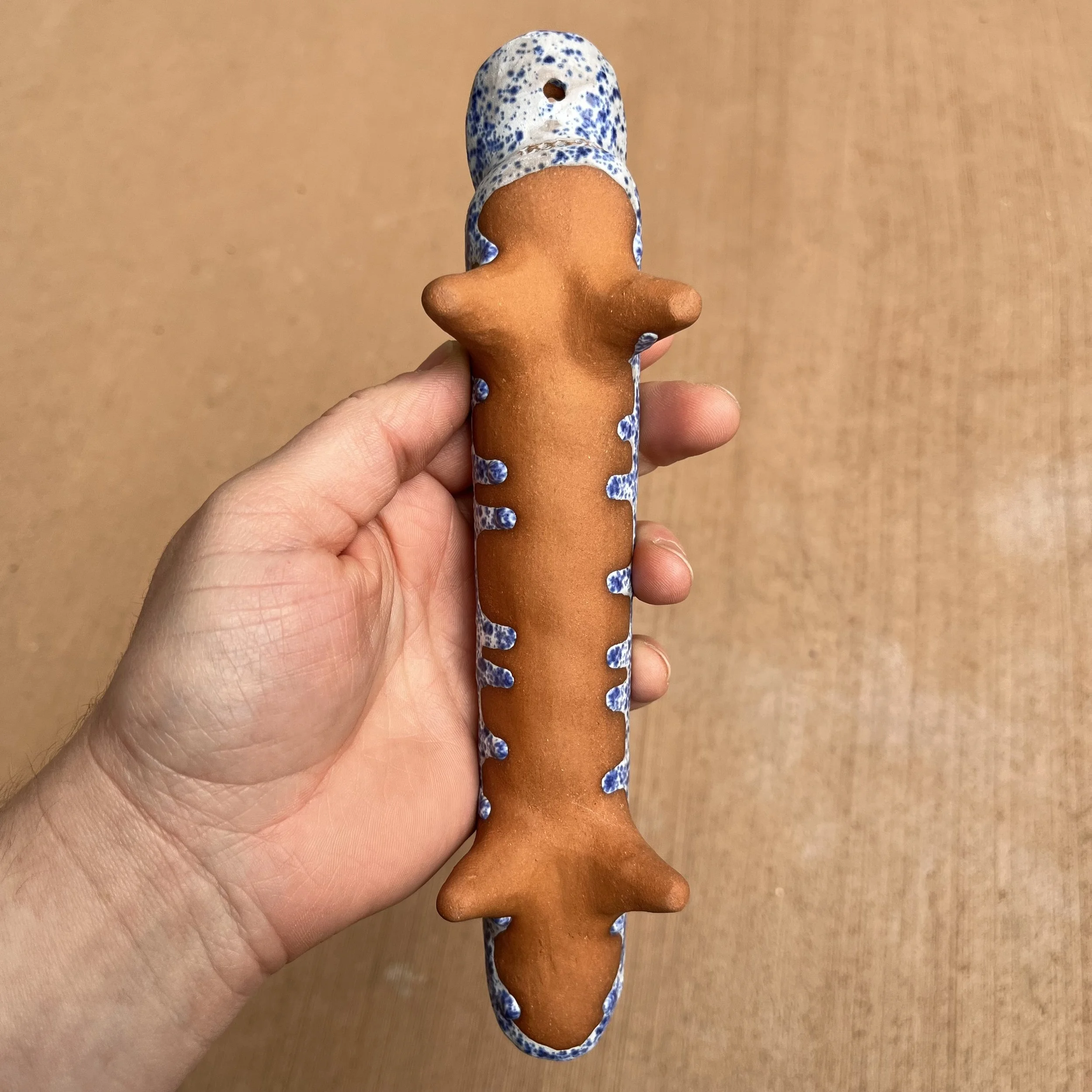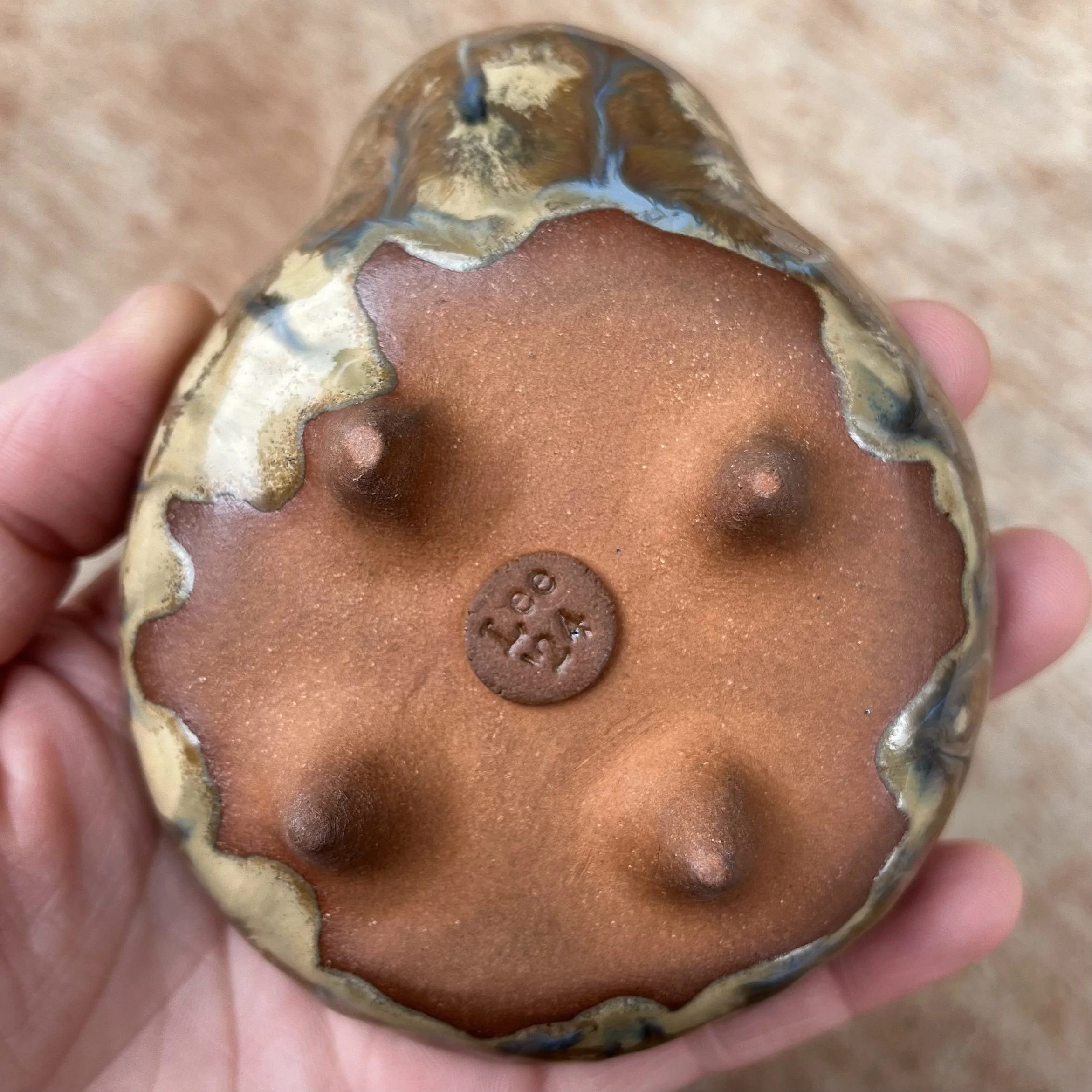 A small bowl has been punched with a hole to support a cone incense and is attached to a lower larger bowl that will collect pooling smoke for a visually pleasing effect. The smaller bowl will collect ash from the cone incense as it breaks down. The piece is raised on 4 small legs to give a clean and clear placement on any surface. This piece has not been glazed to show off the vibrant red color of the stoneware along with the intriguing textures of unglazed clay.