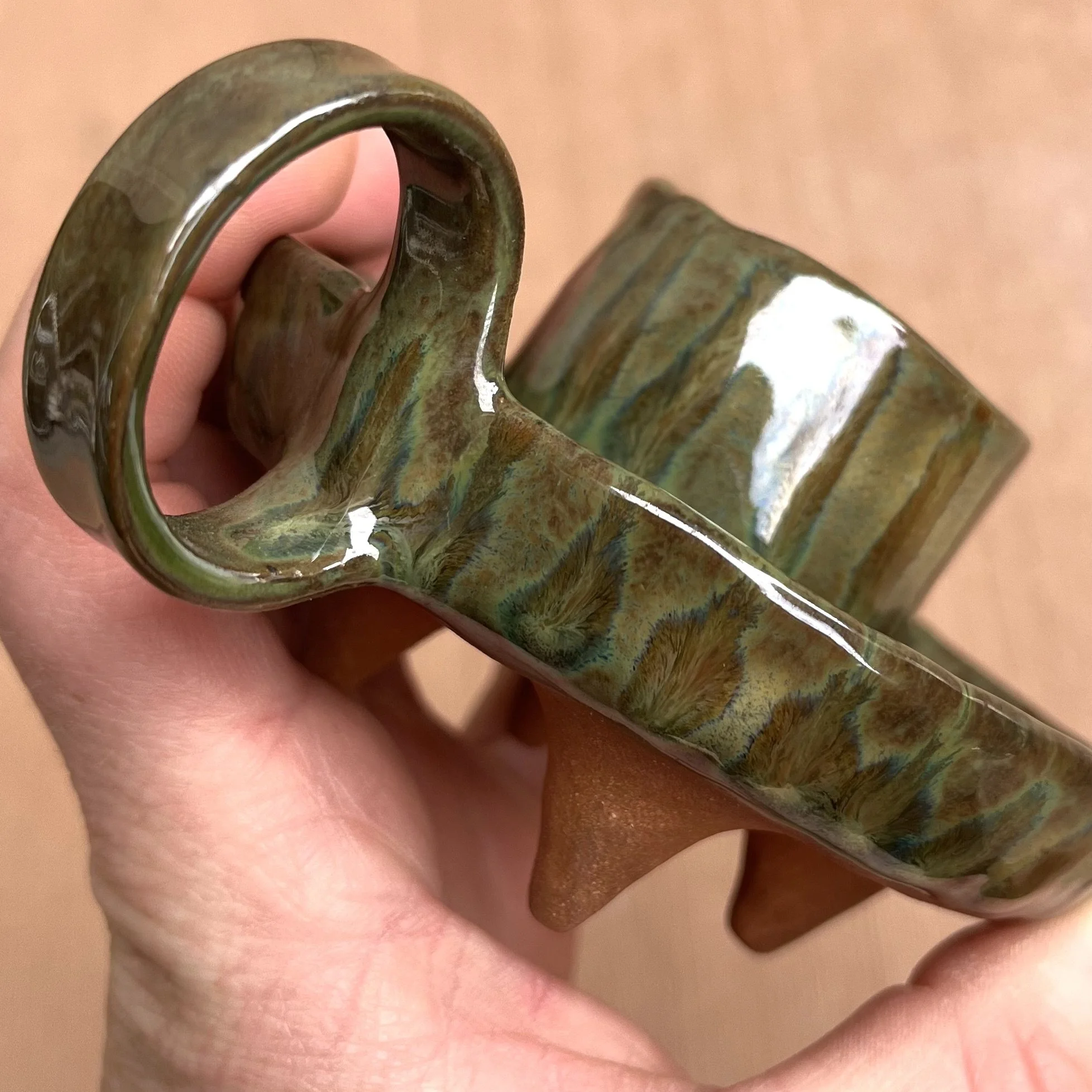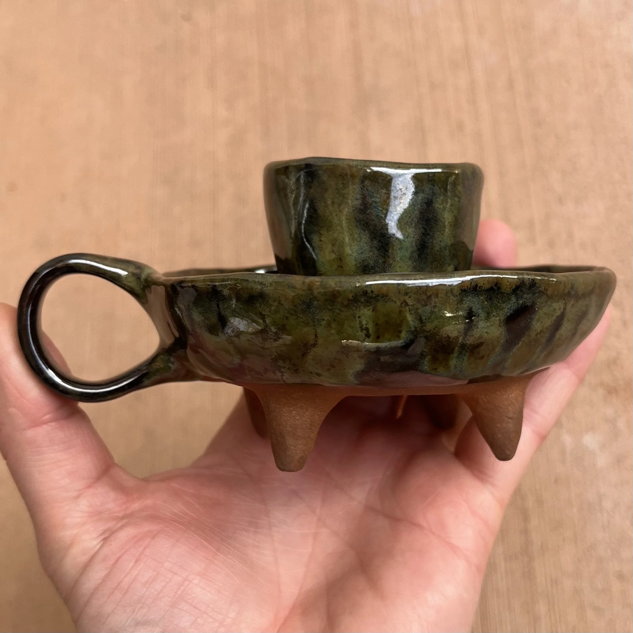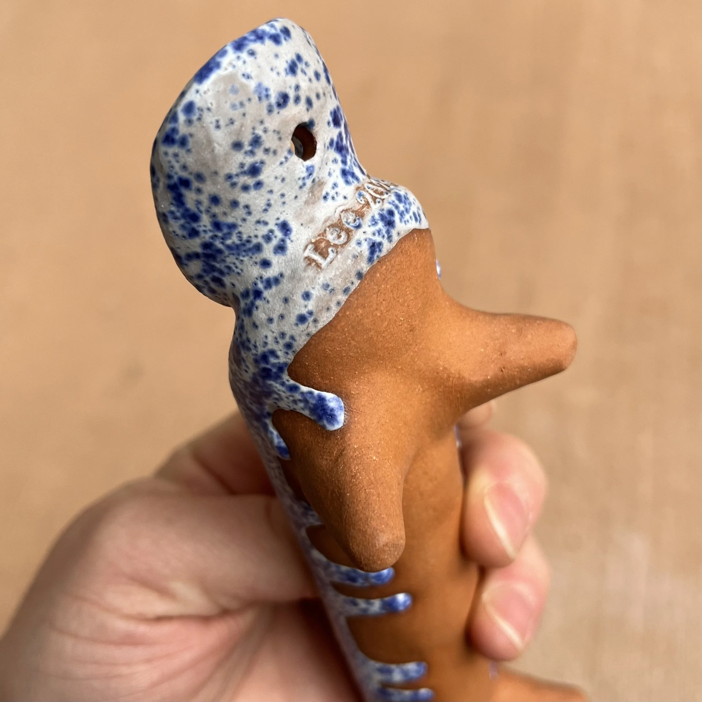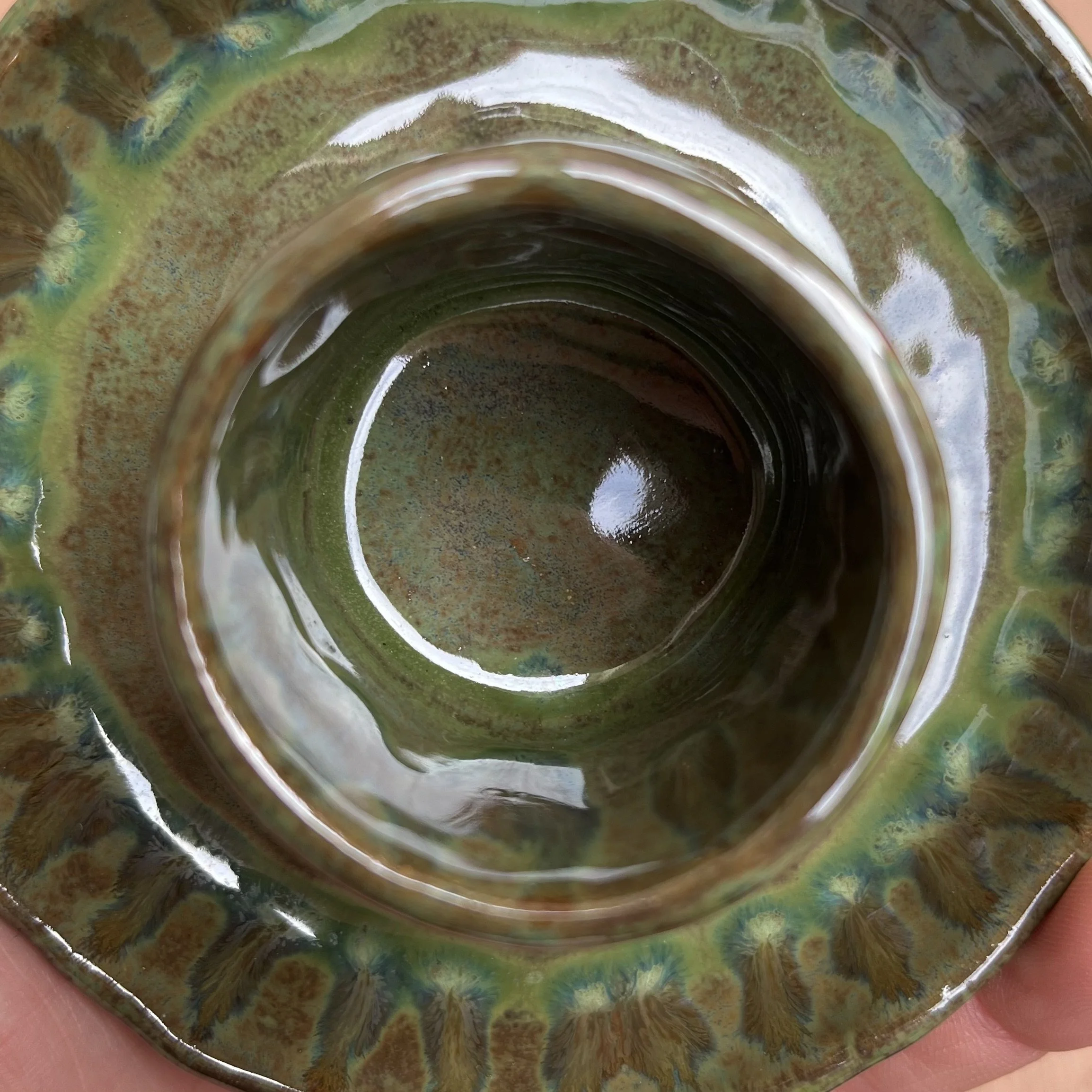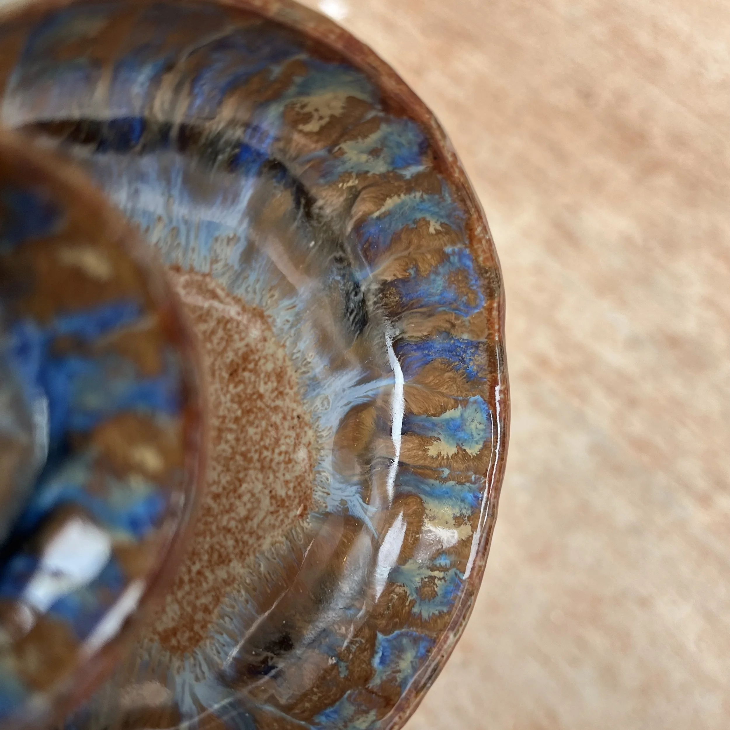 A small bowl has been punched with a hole to support a cone incense and is attached to a lower larger bowl that will collect pooling smoke for a visually pleasing effect. The smaller bowl will collect ash from the cone incense as it breaks down. The piece is raised on 4 small legs to give a clean and clear placement on any surface. This piece has not been glazed to show off the vibrant red color of the stoneware along with the intriguing textures of unglazed clay.
