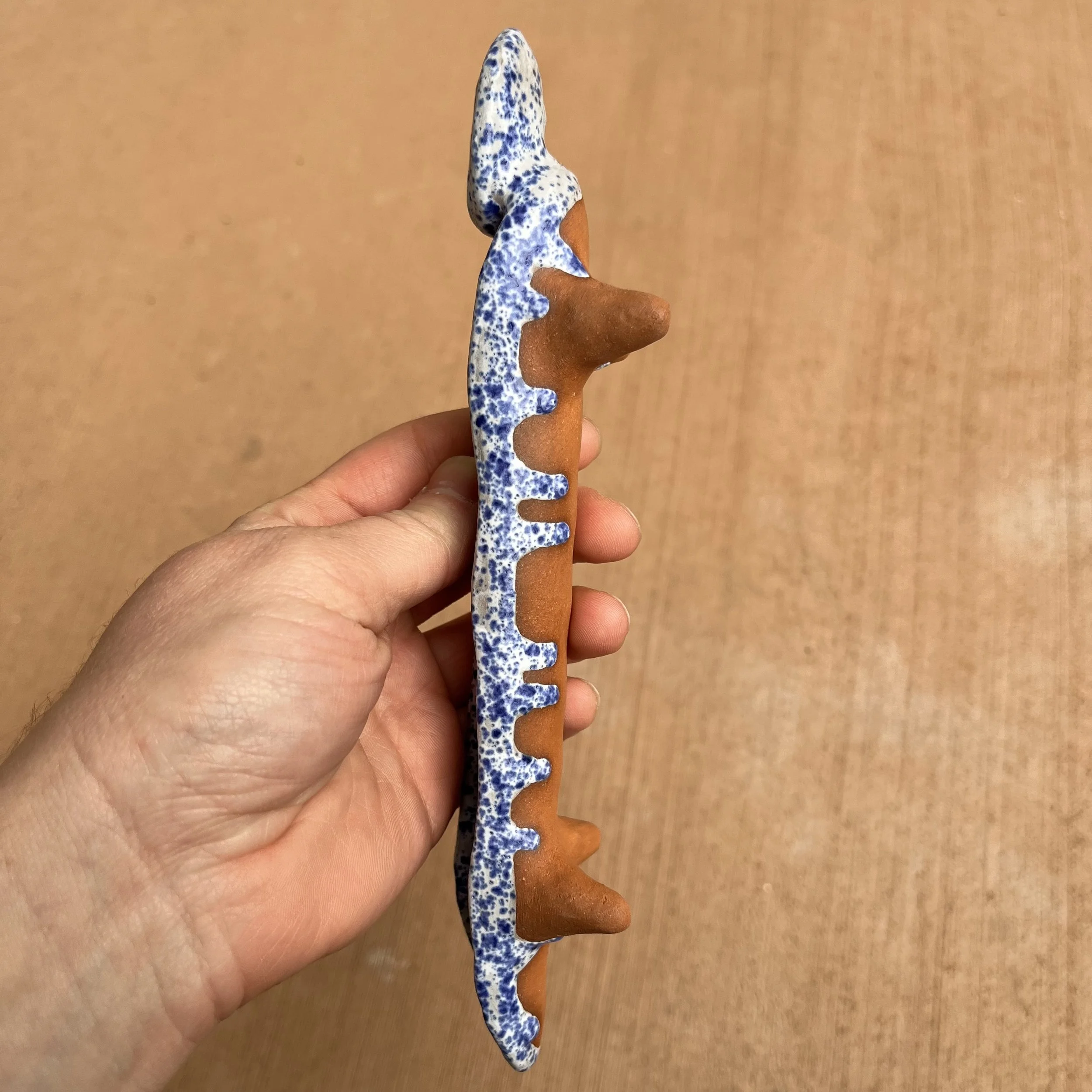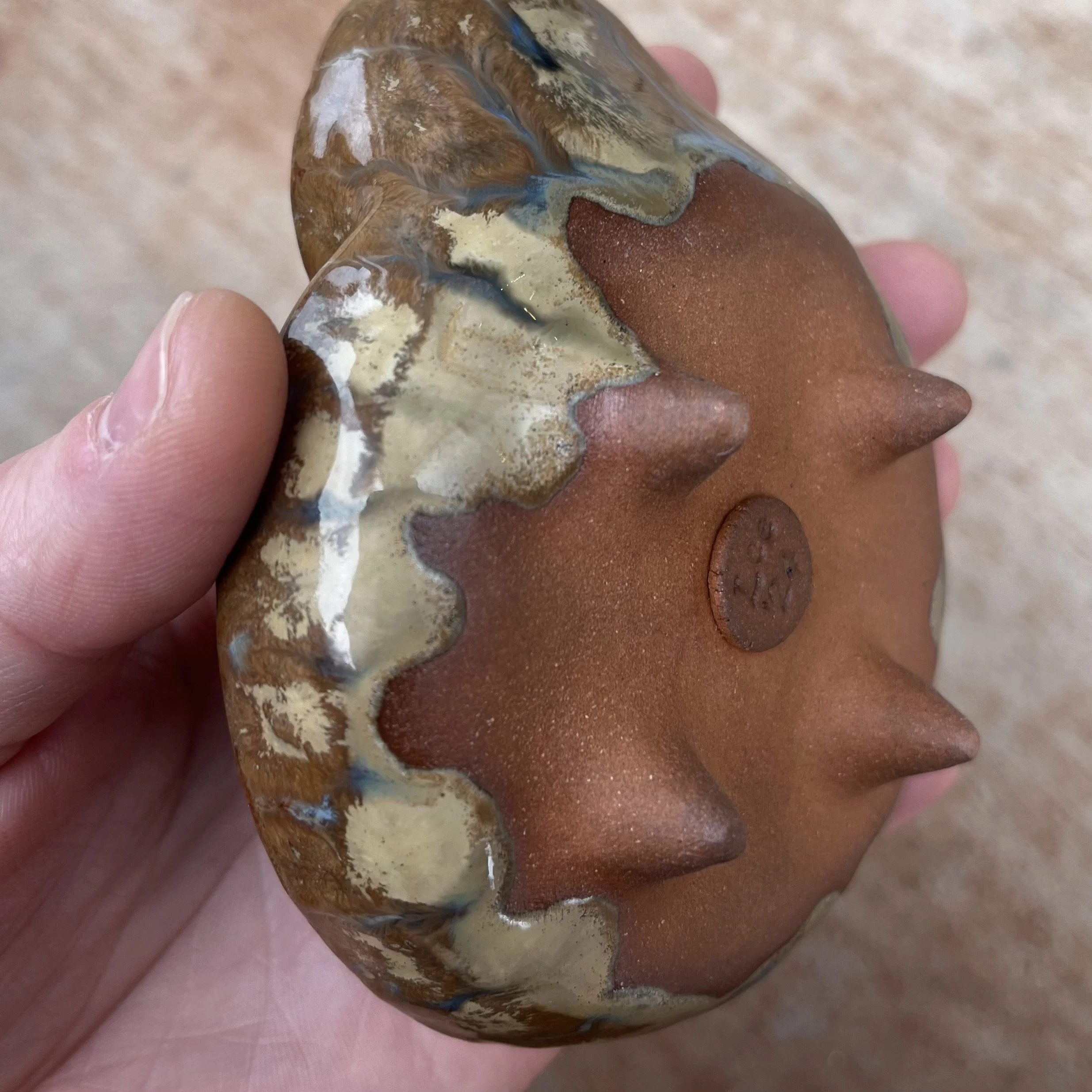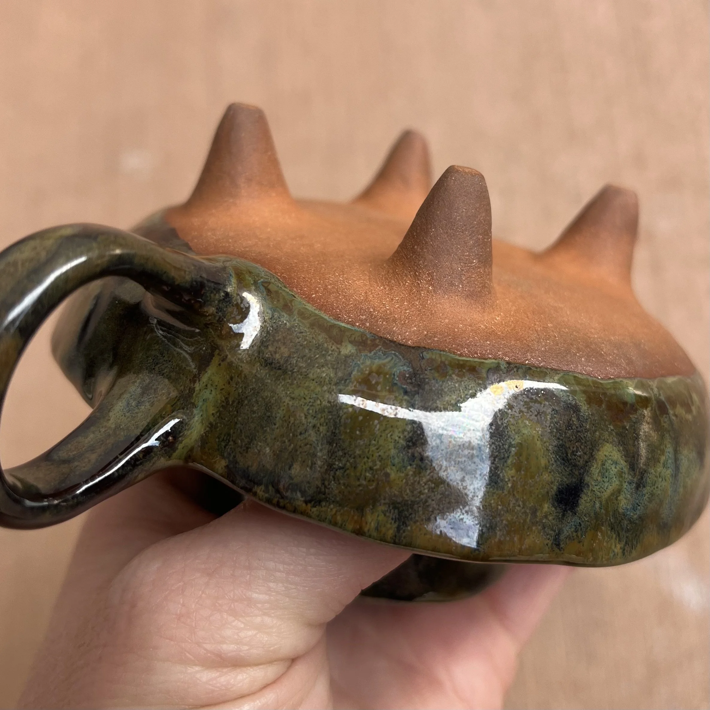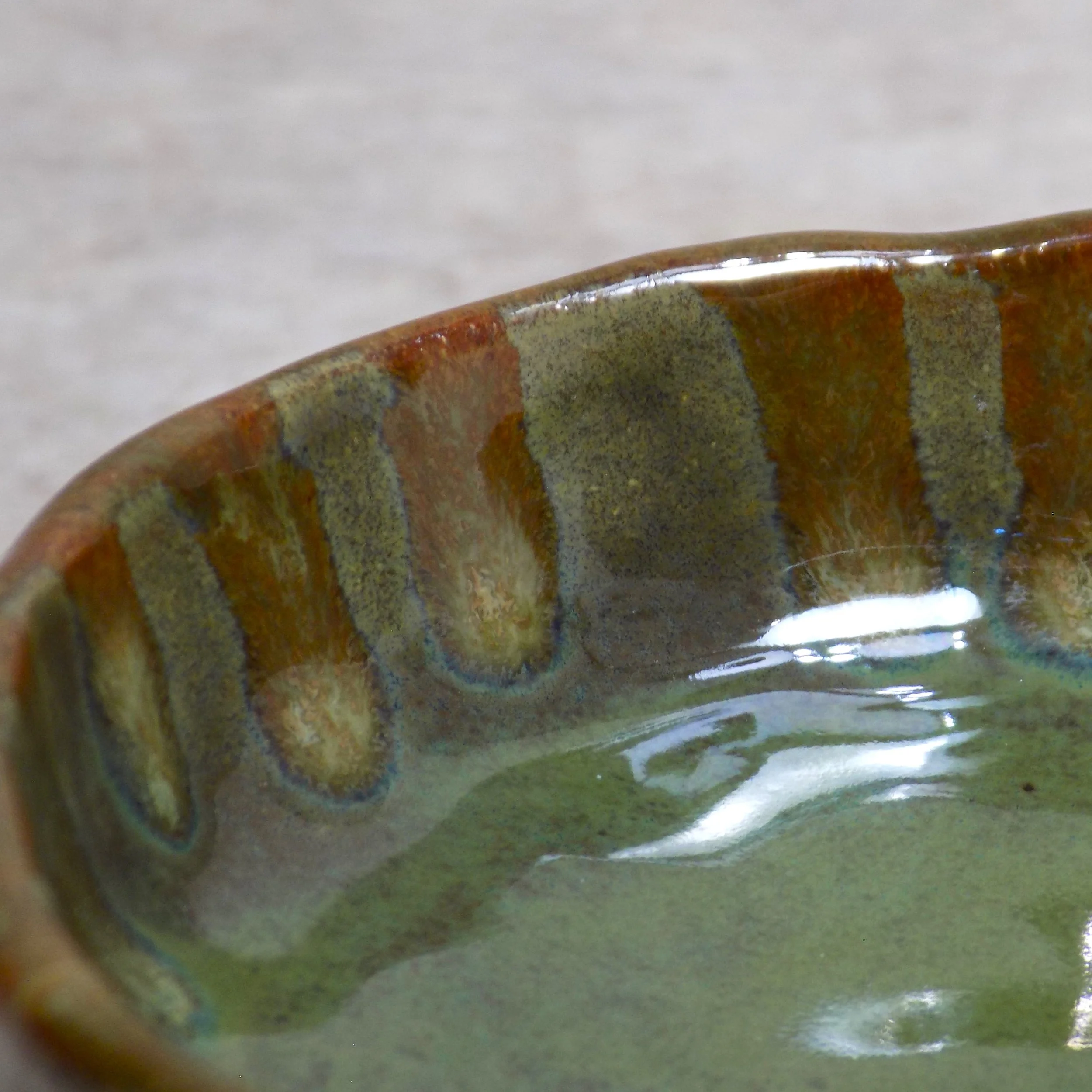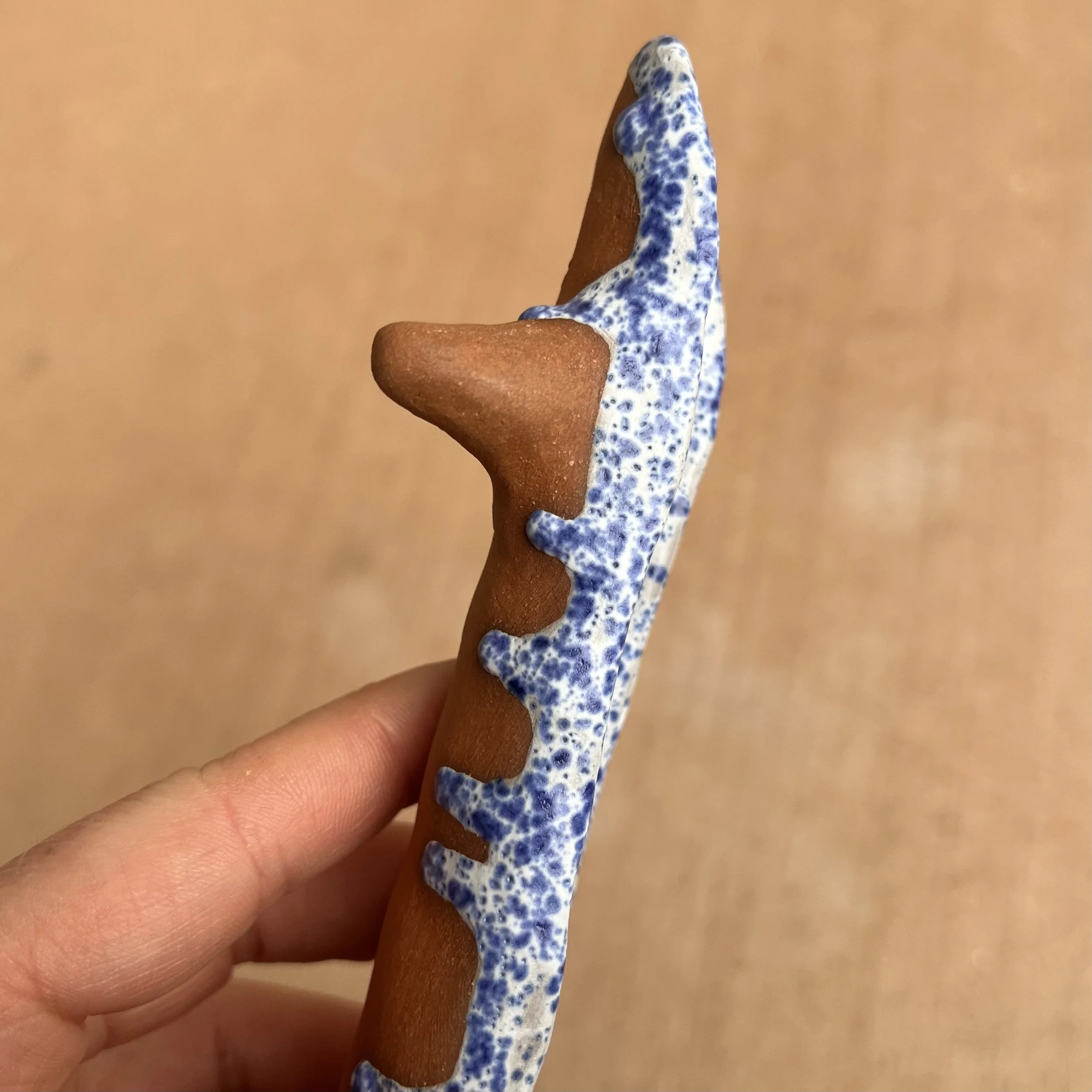 A small bowl has been punched with a hole to support a cone incense and is attached to a lower larger bowl that will collect pooling smoke for a visually pleasing effect. The smaller bowl will collect ash from the cone incense as it breaks down. The piece is raised on 4 small legs to give a clean and clear placement on any surface. This piece has not been glazed to show off the vibrant red color of the stoneware along with the intriguing textures of unglazed clay.