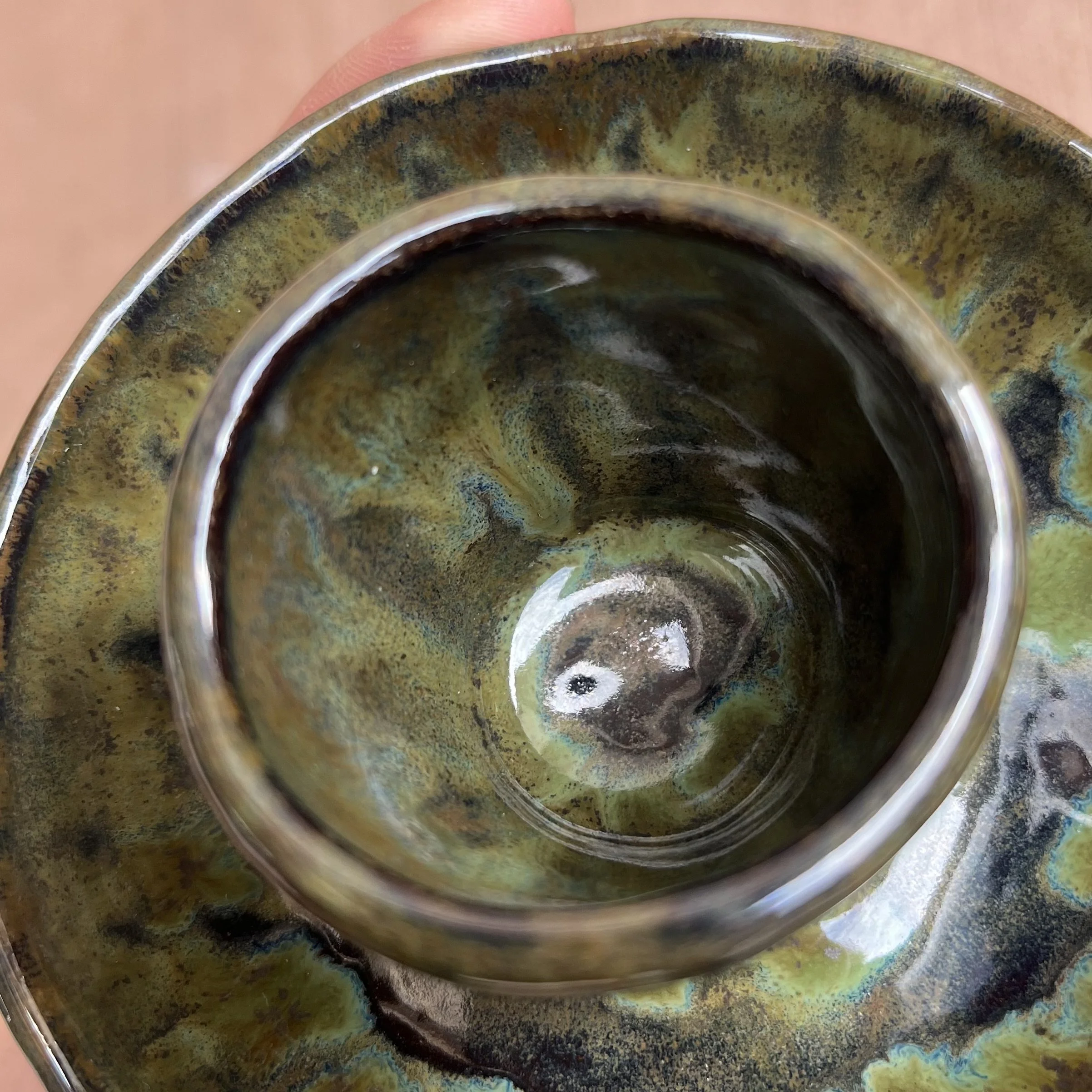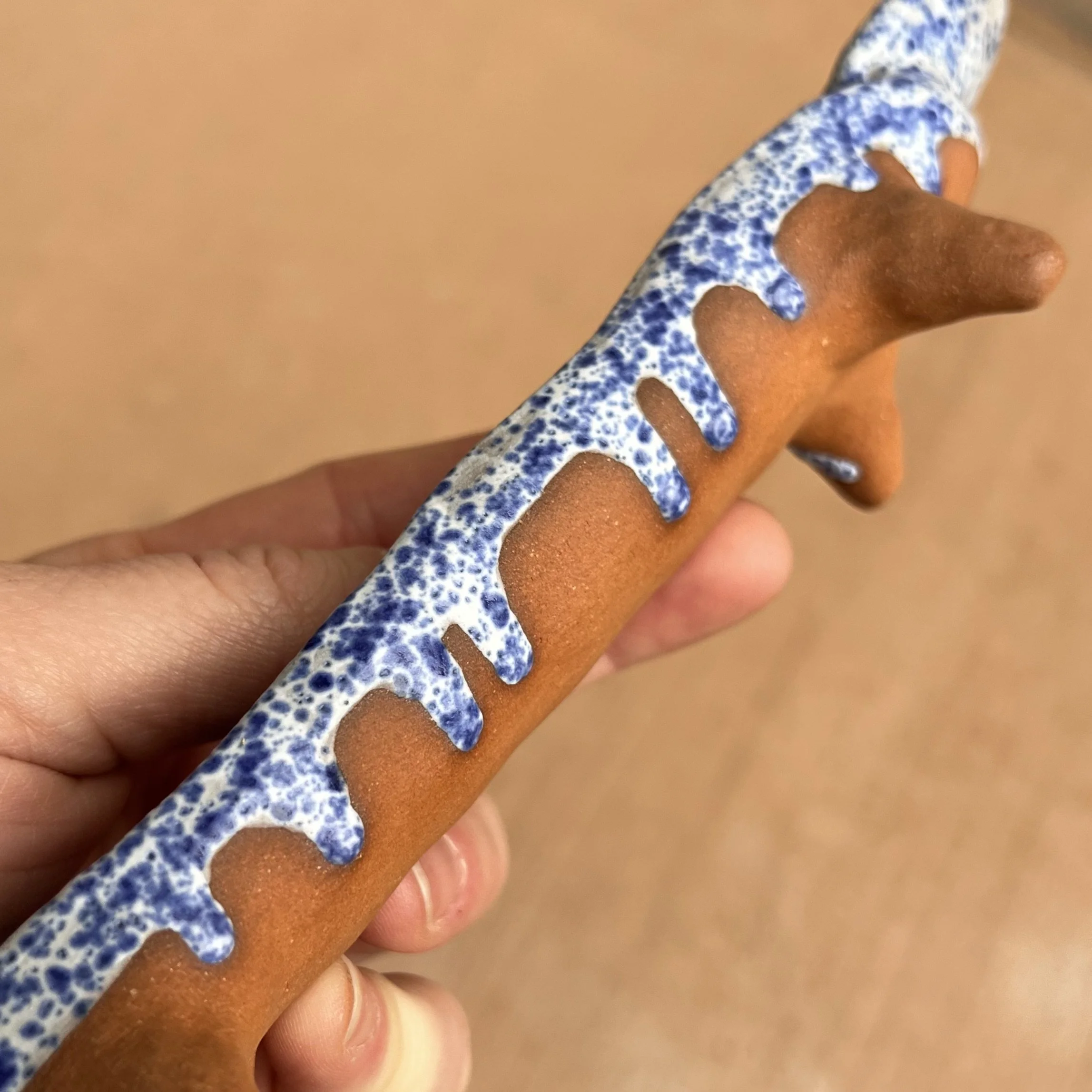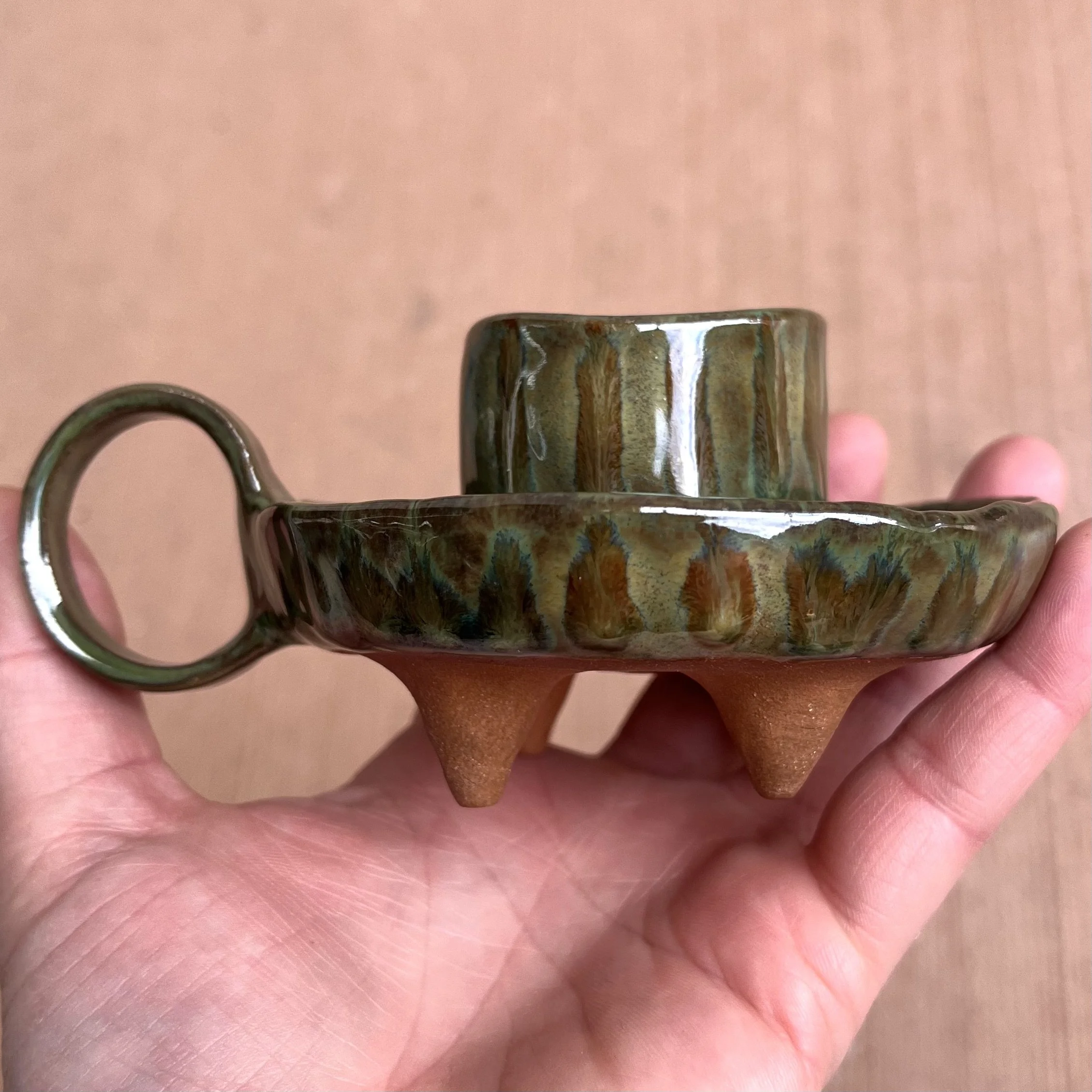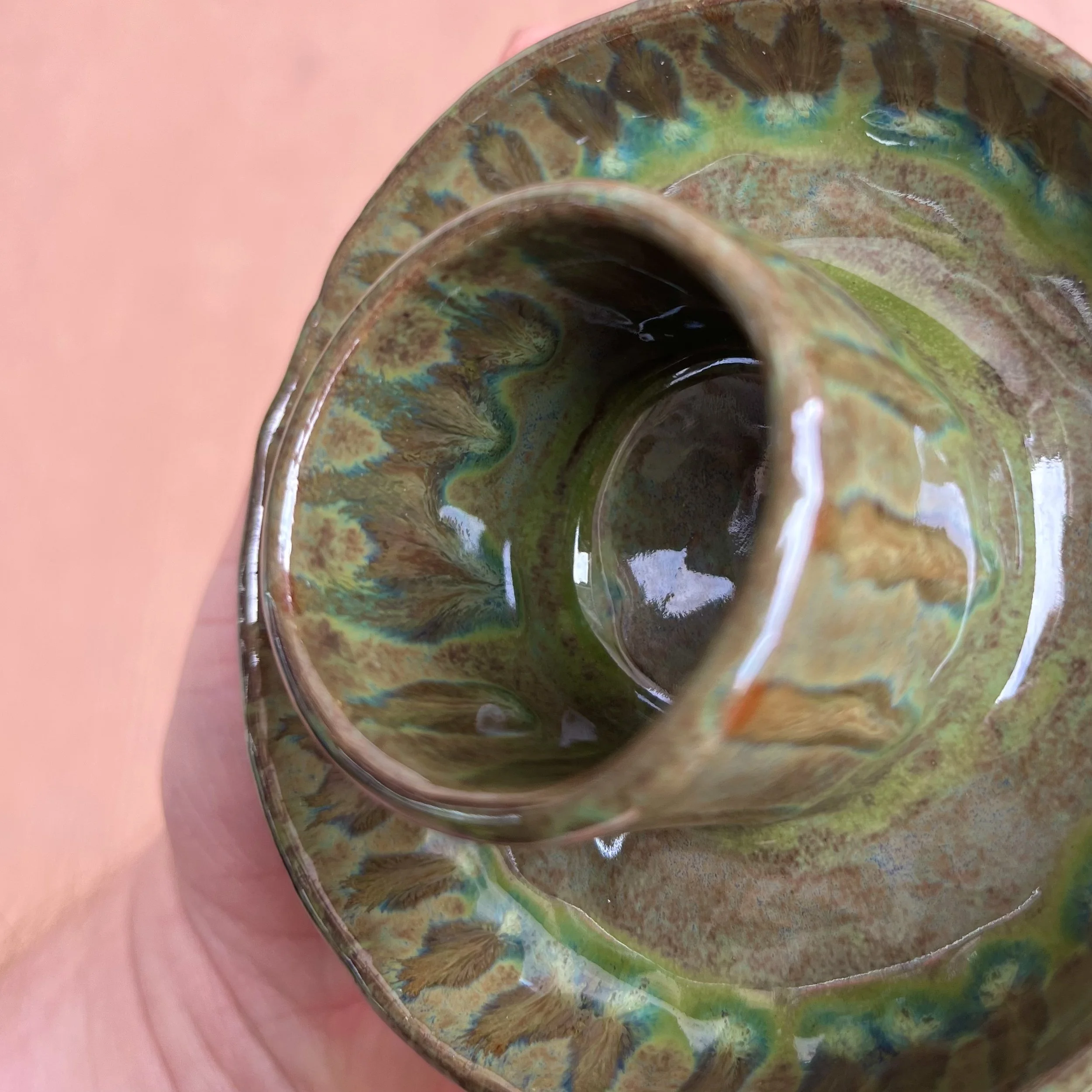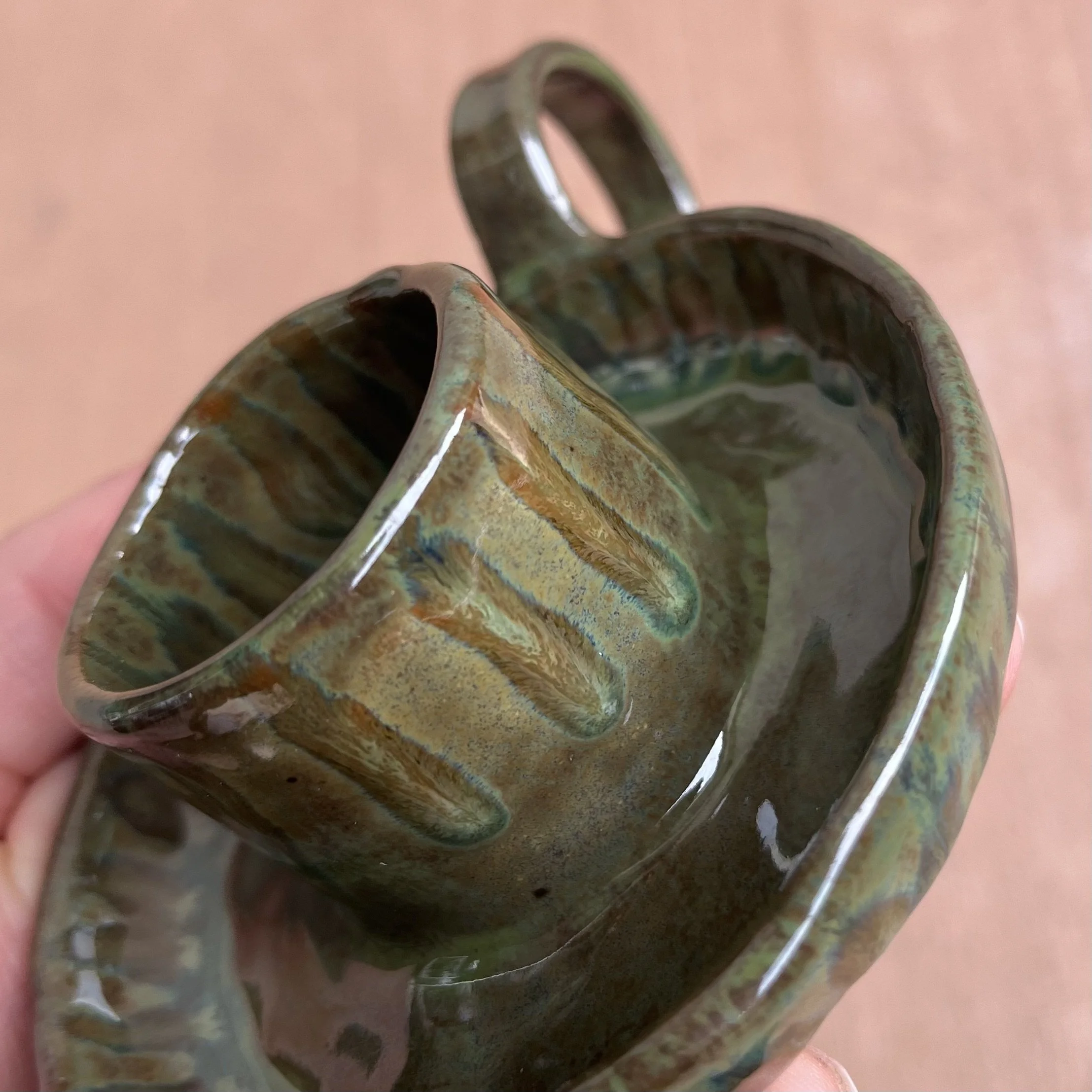A small bowl has been punched with a hole to support a cone incense and is attached to a lower larger bowl that will collect pooling smoke for a visually pleasing effect. The smaller bowl will collect ash from the cone incense as it breaks down. The piece is raised on 4 small legs to give a clean and clear placement on any surface. This piece has not been glazed to show off the vibrant red color of the stoneware along with the intriguing textures of unglazed clay.